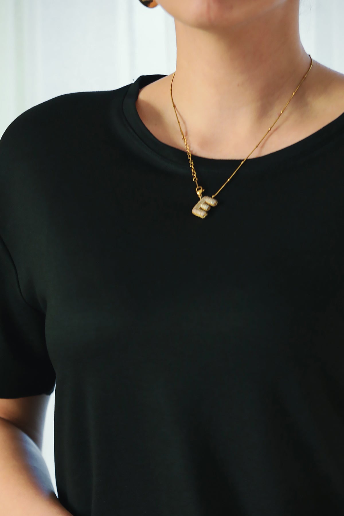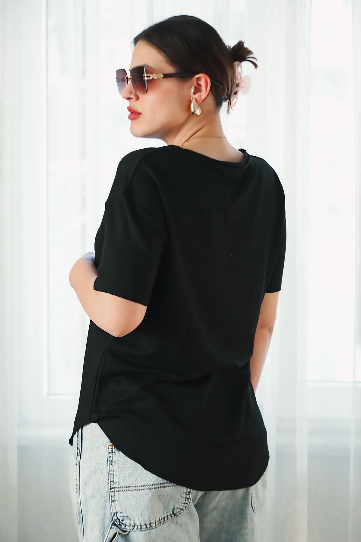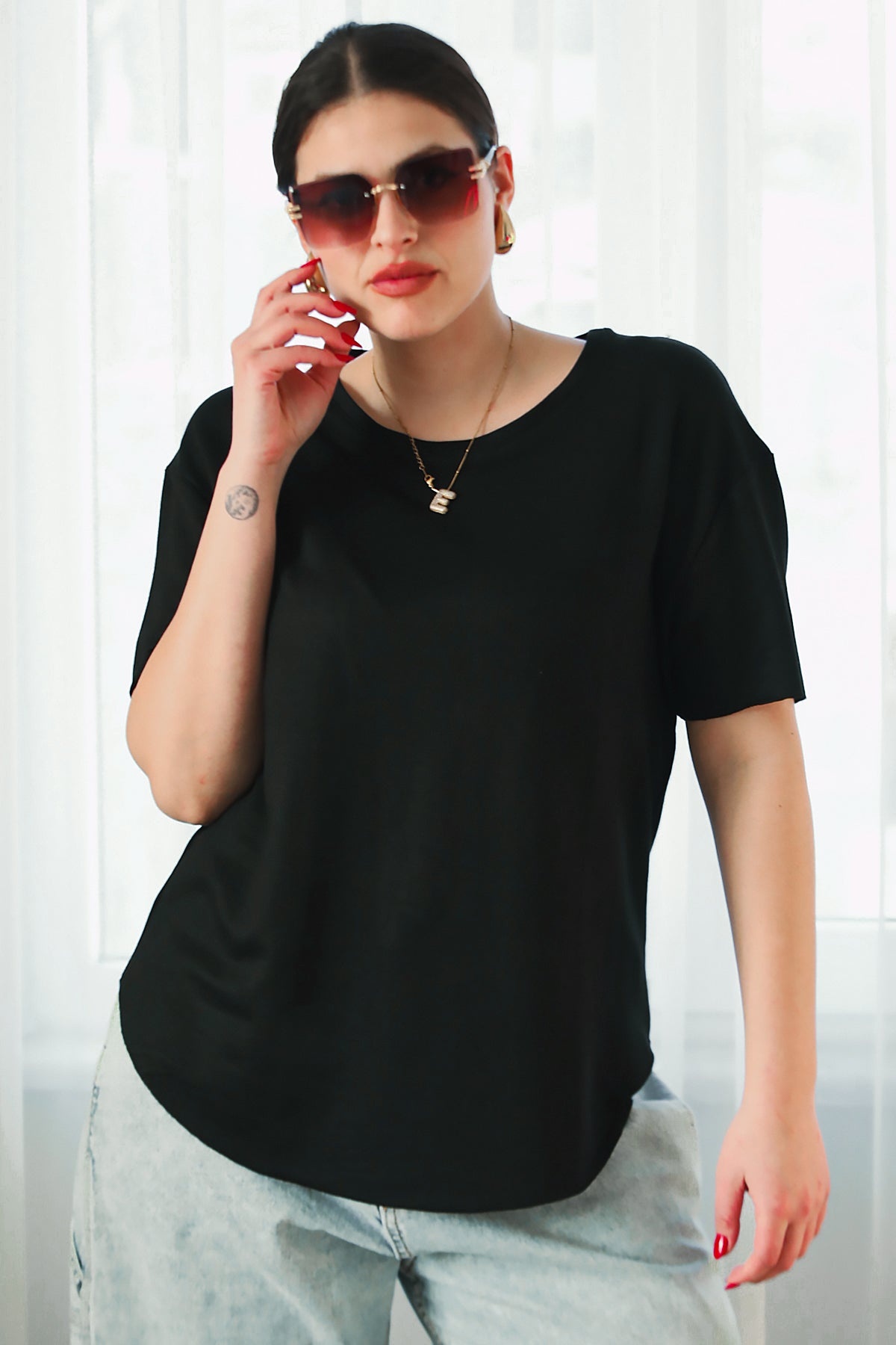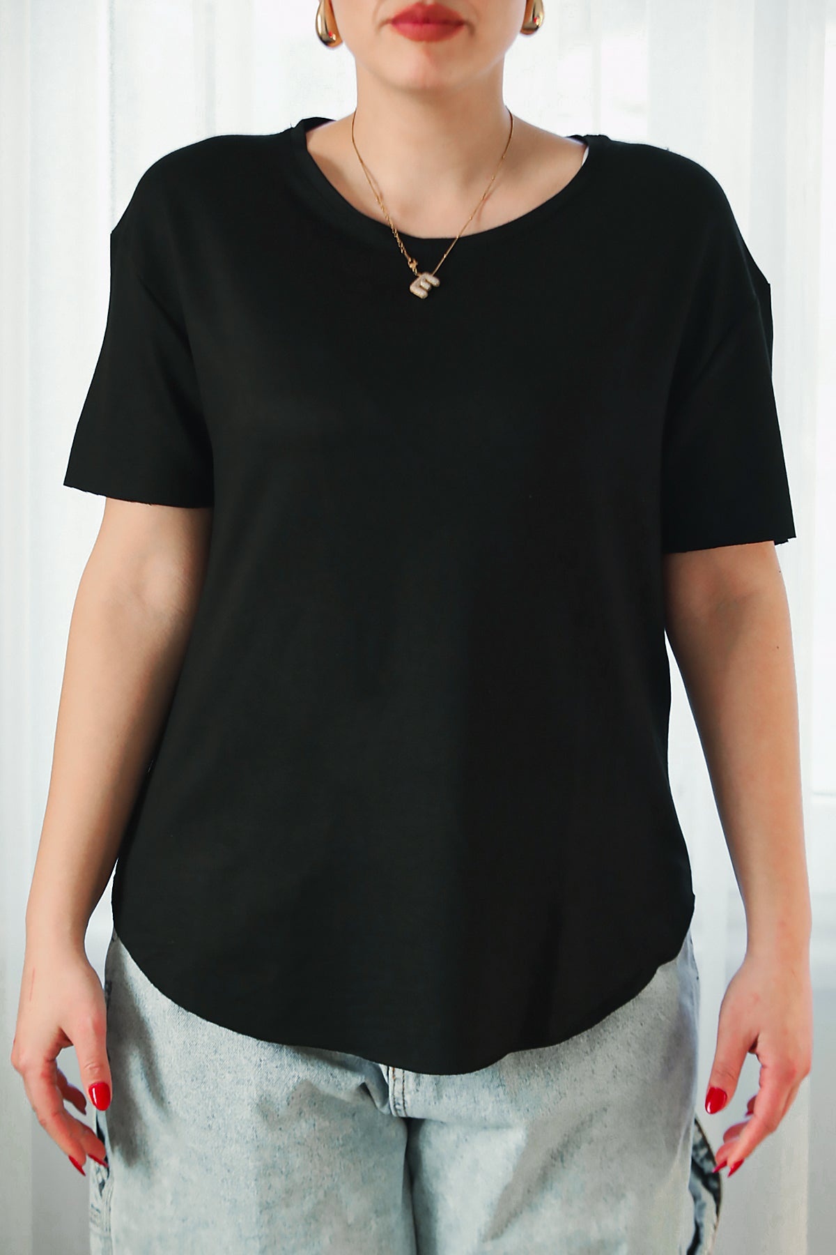 Büyük Beden Eteği Oval Bisiklet Yaka Tshırt Siyah