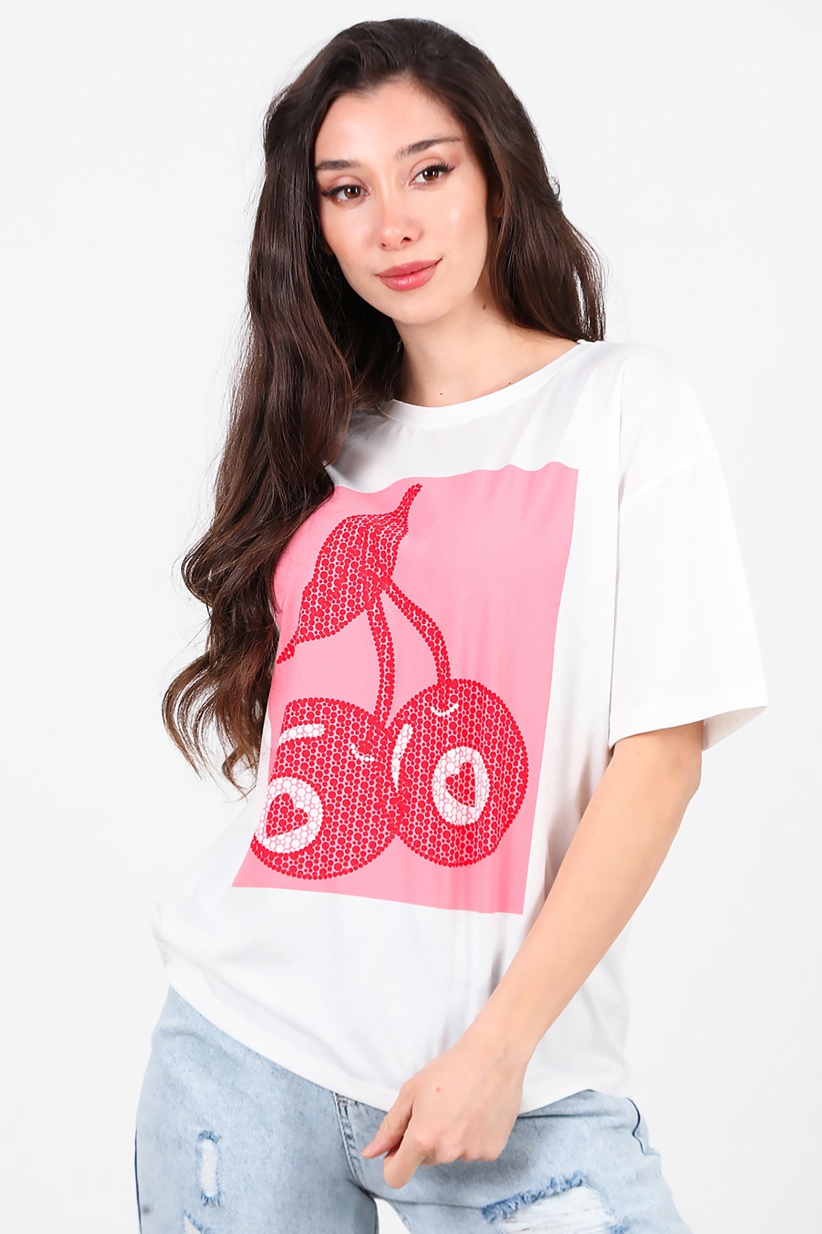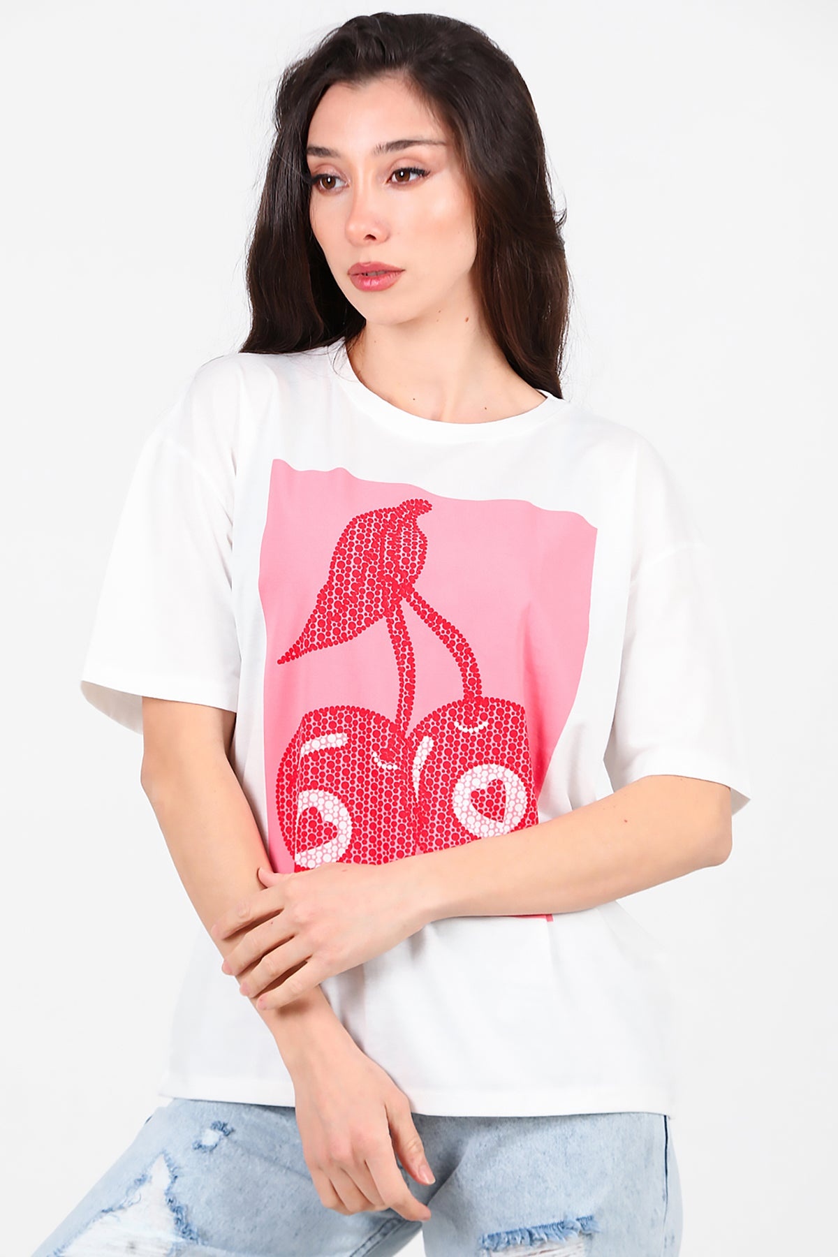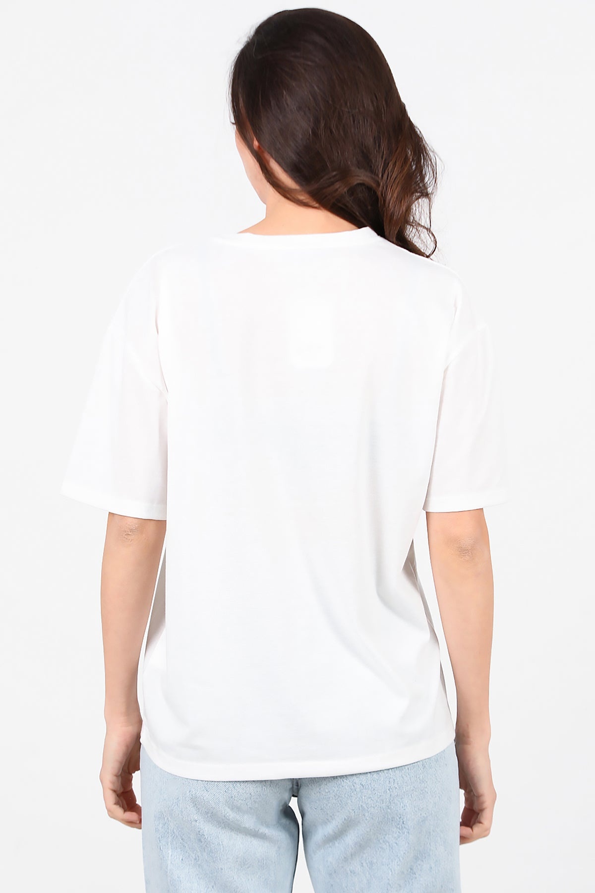 Kadın Baskılı Bisiklet Yaka T-shirt Ekru