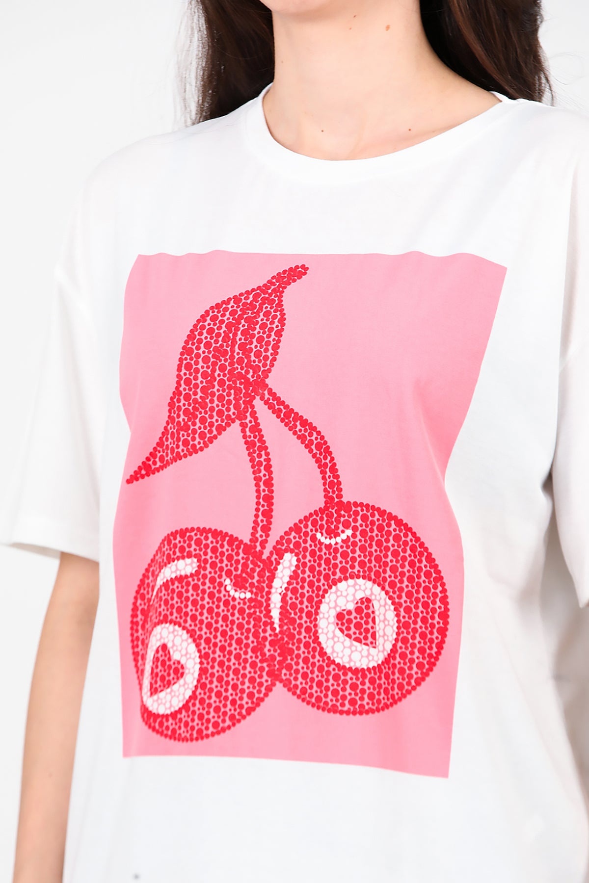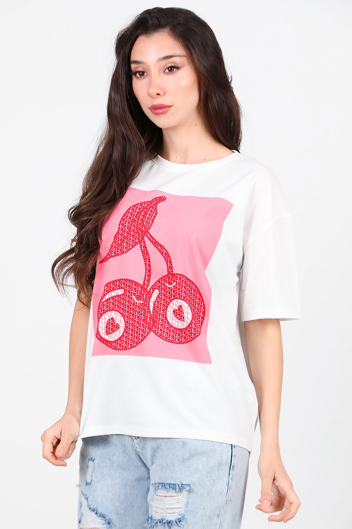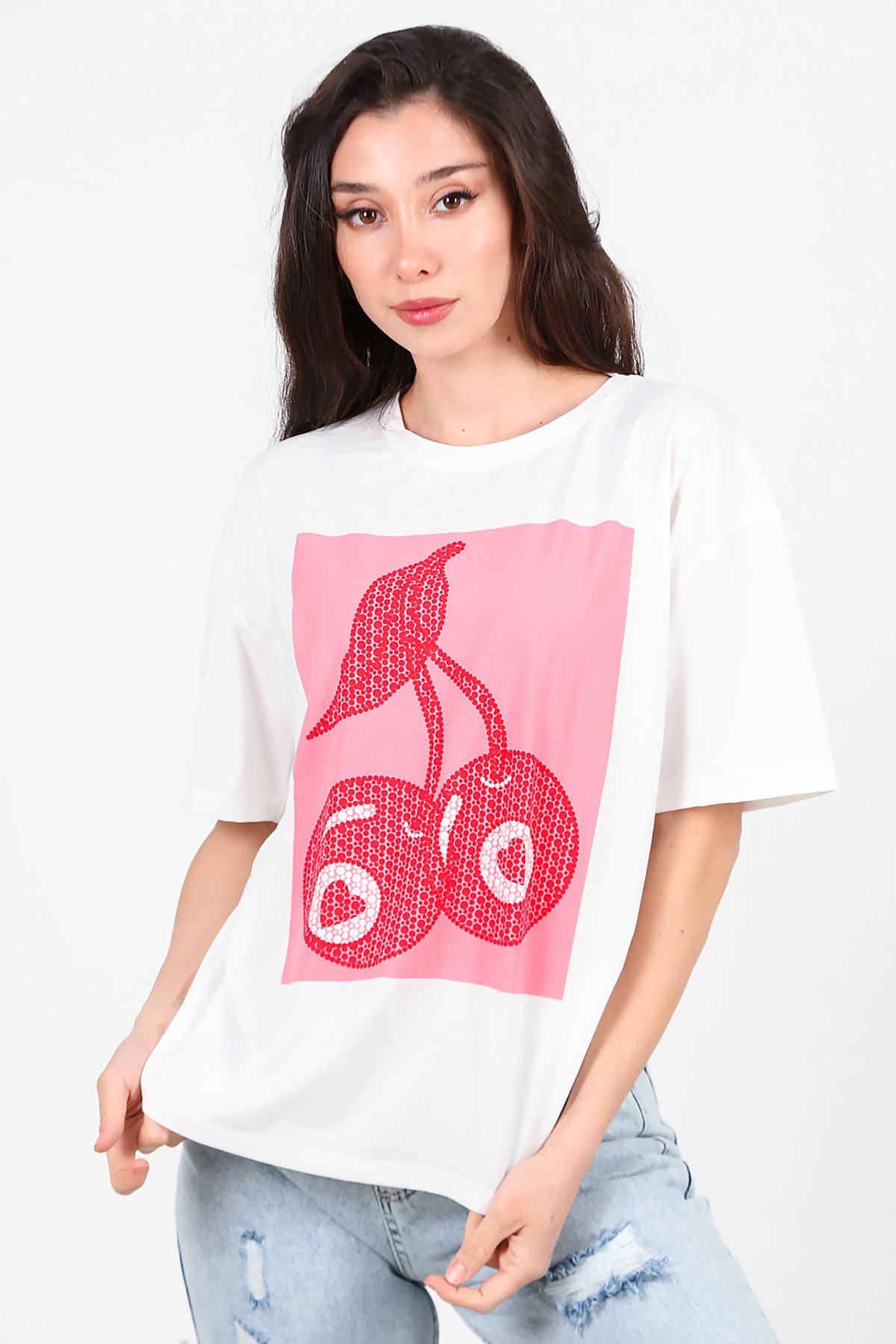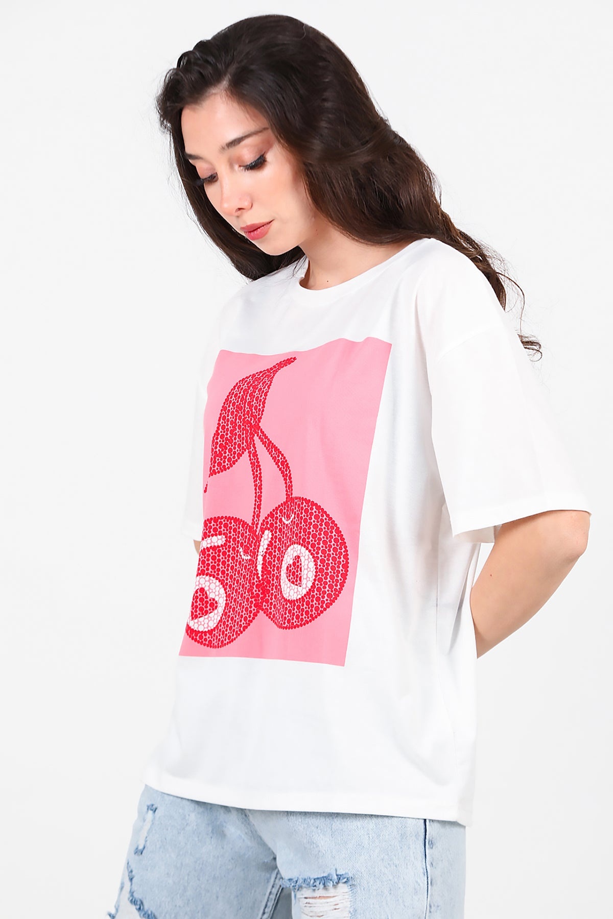 Kadın Baskılı Bisiklet Yaka T-shirt Ekru