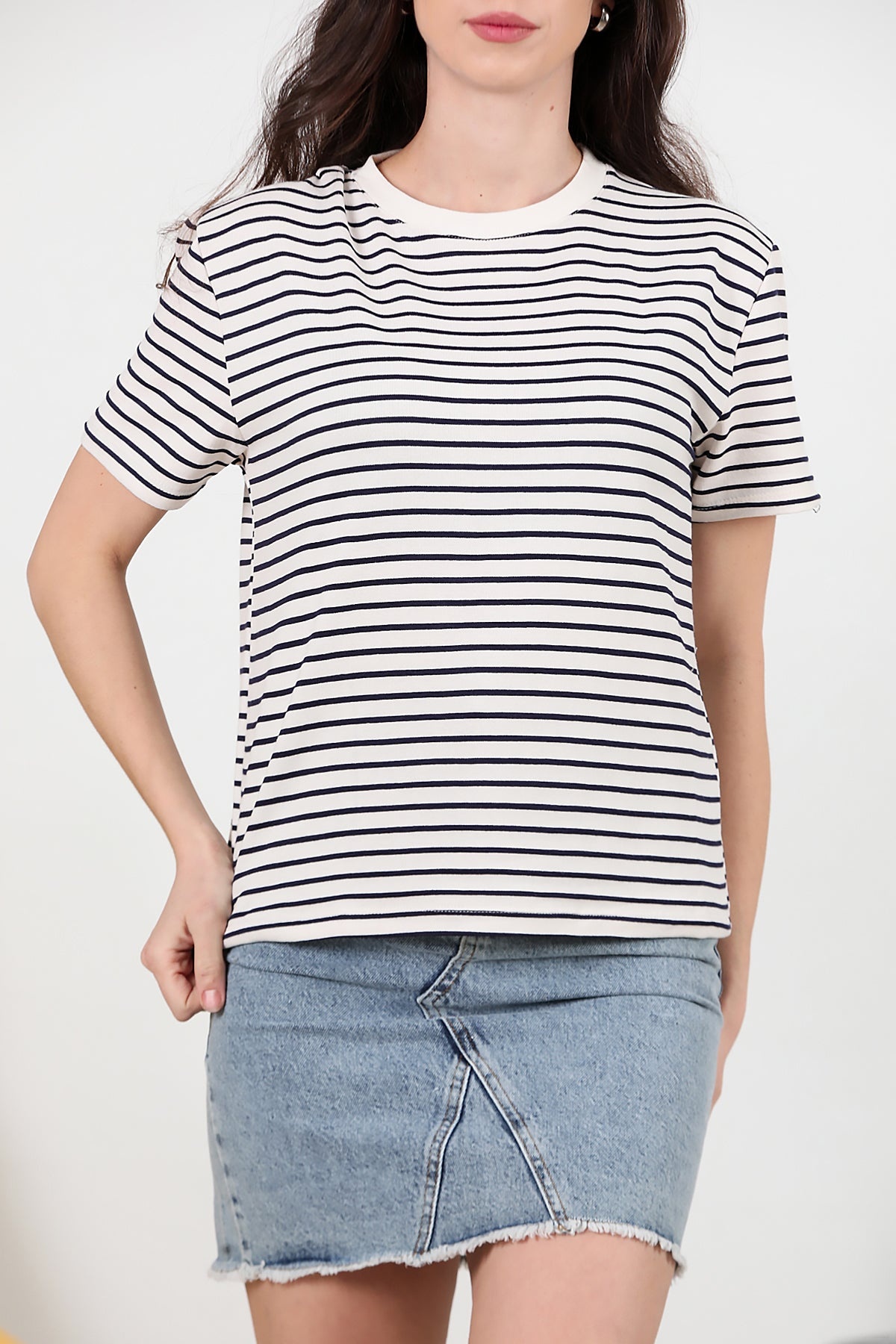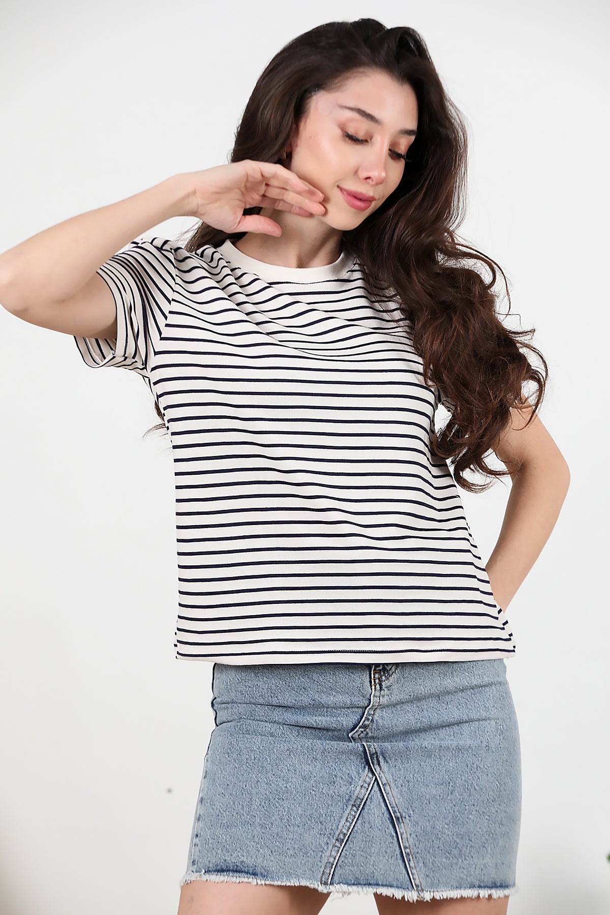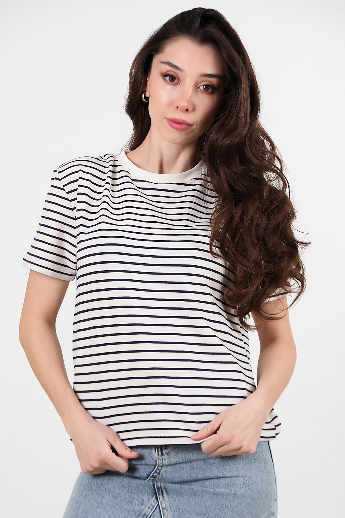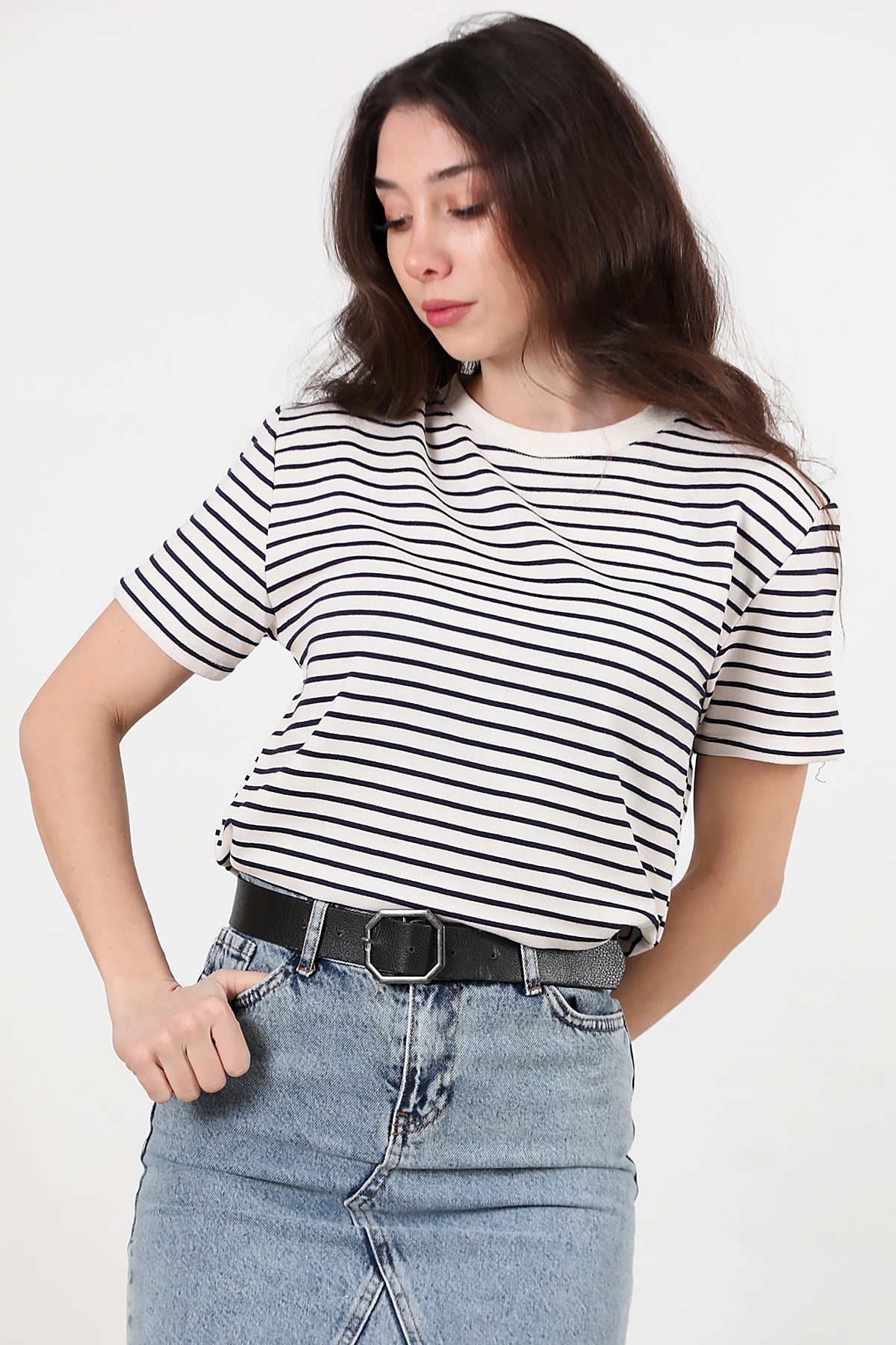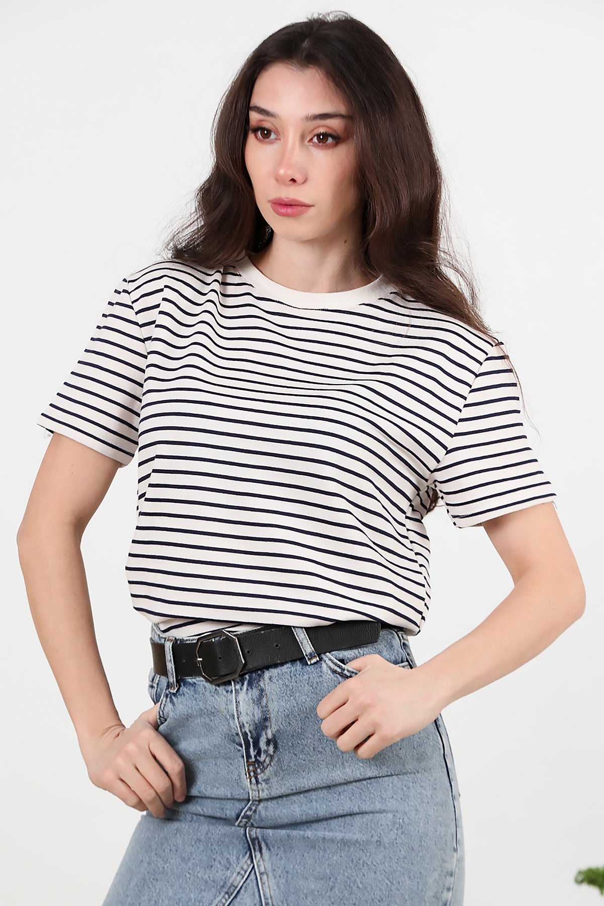 Kadın Bisiklet Yaka Çizgili T-shirt Lacivert