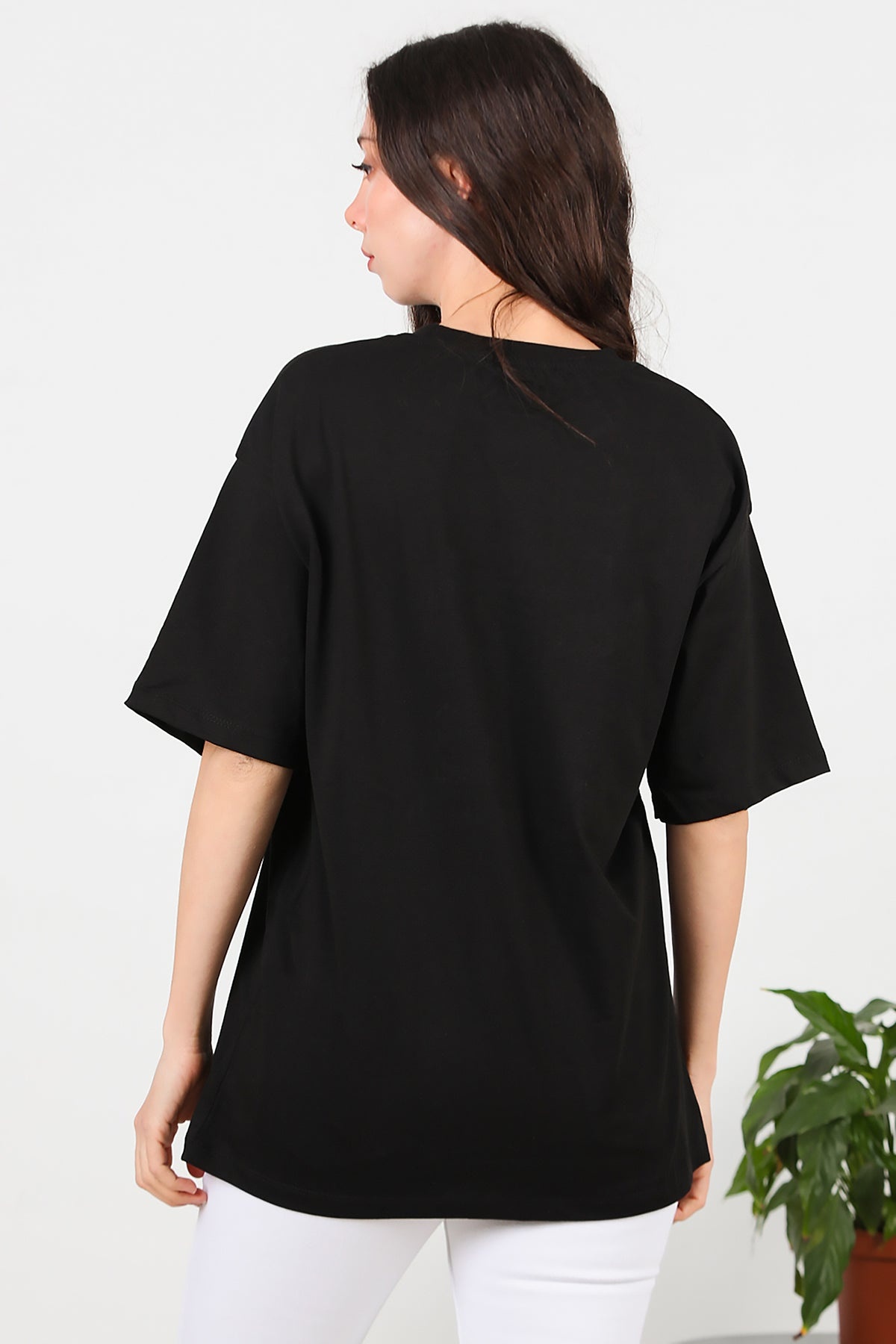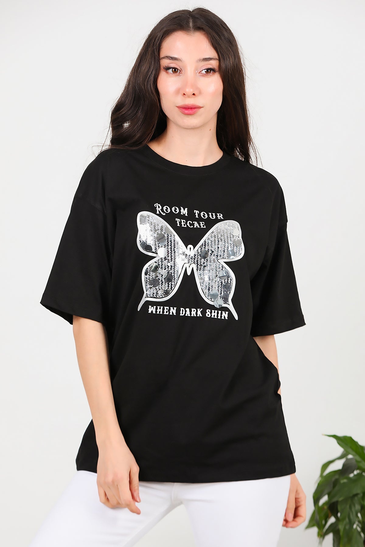 Kadın Bisiklet Yaka Kelebek Pullu Tshırt Siyah