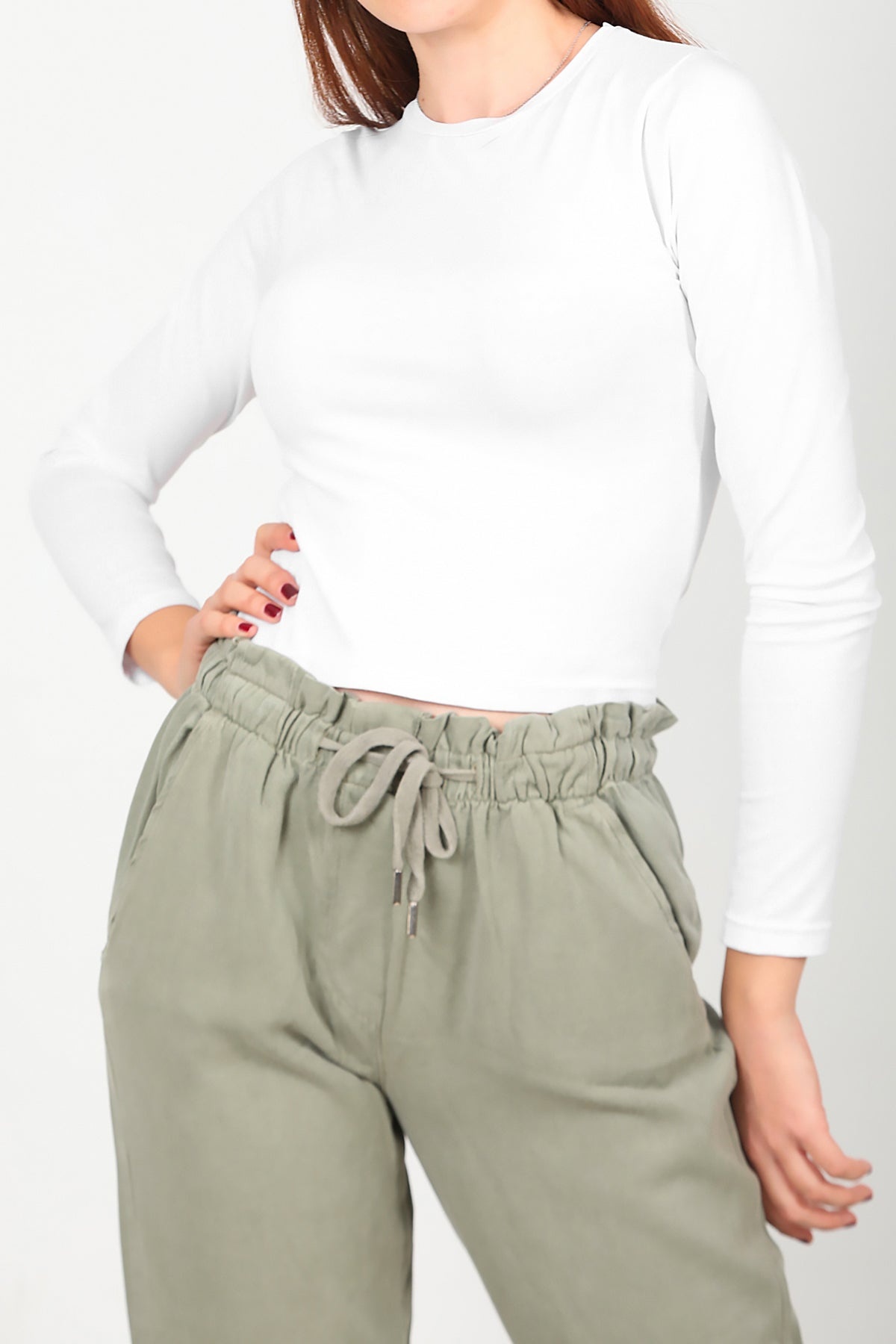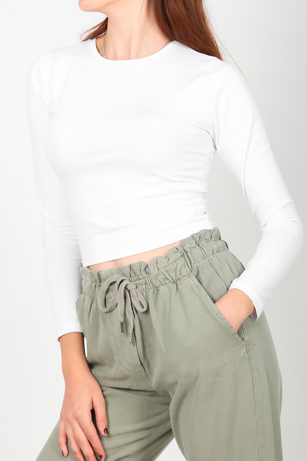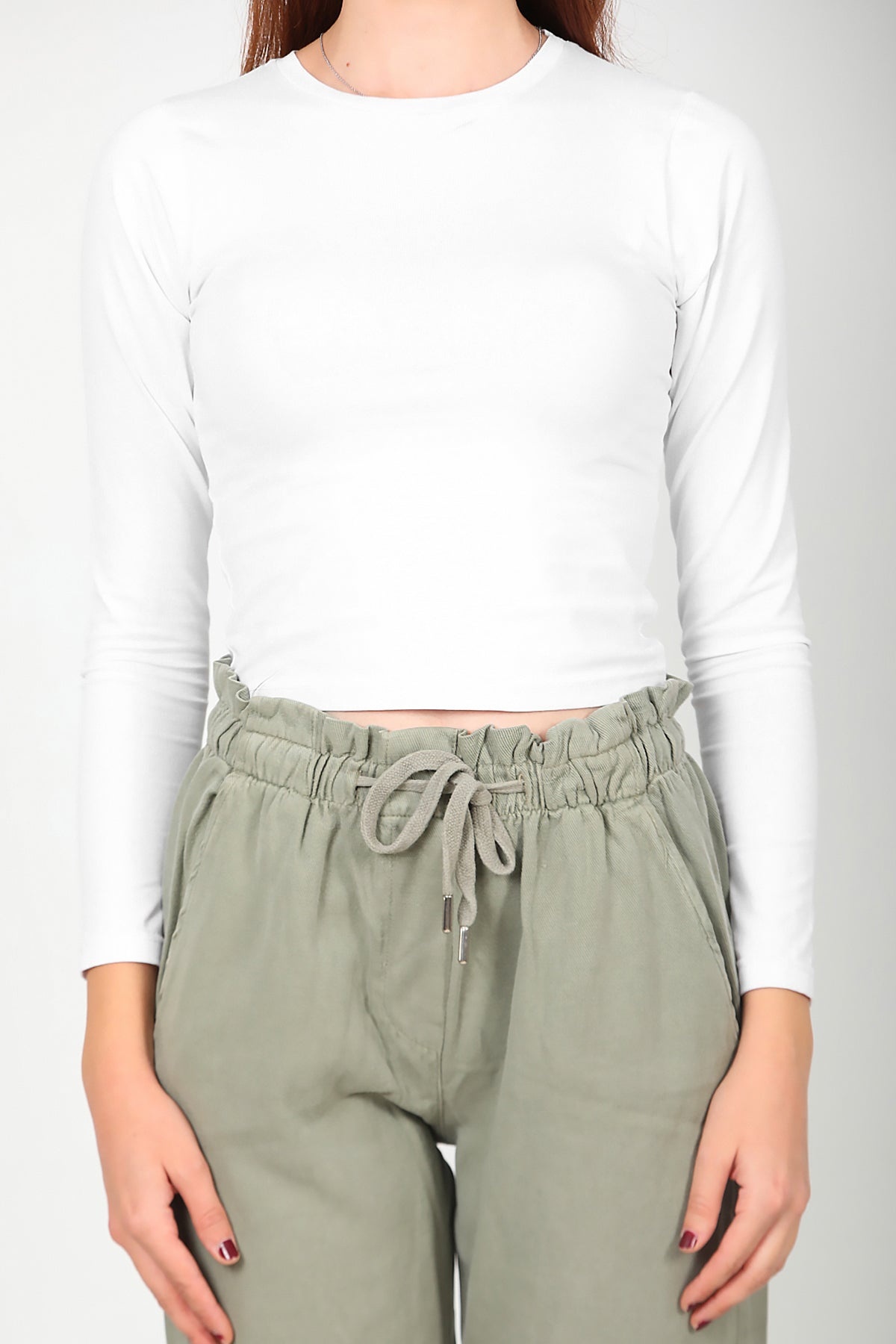 Kadın Bisiklet Yaka Kısa Uzun Kol Bluz Beyaz Beyaz
