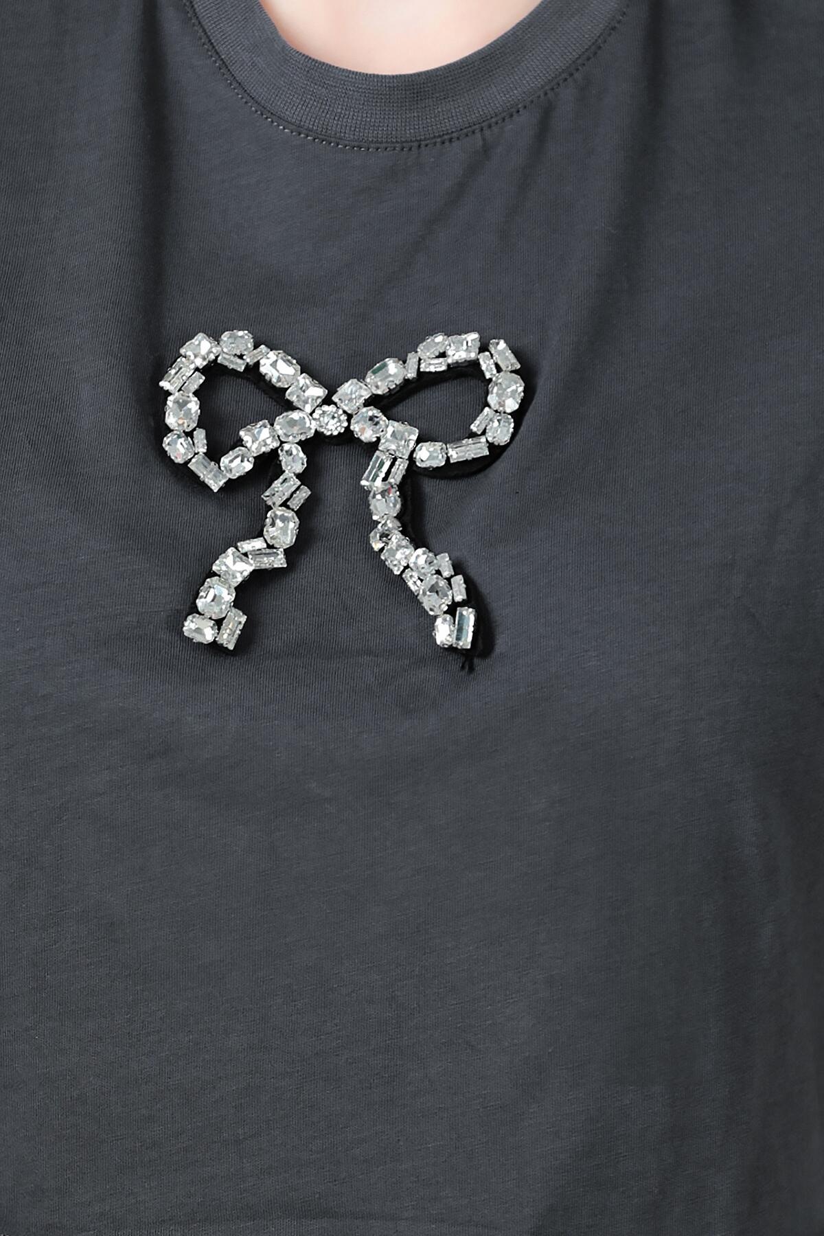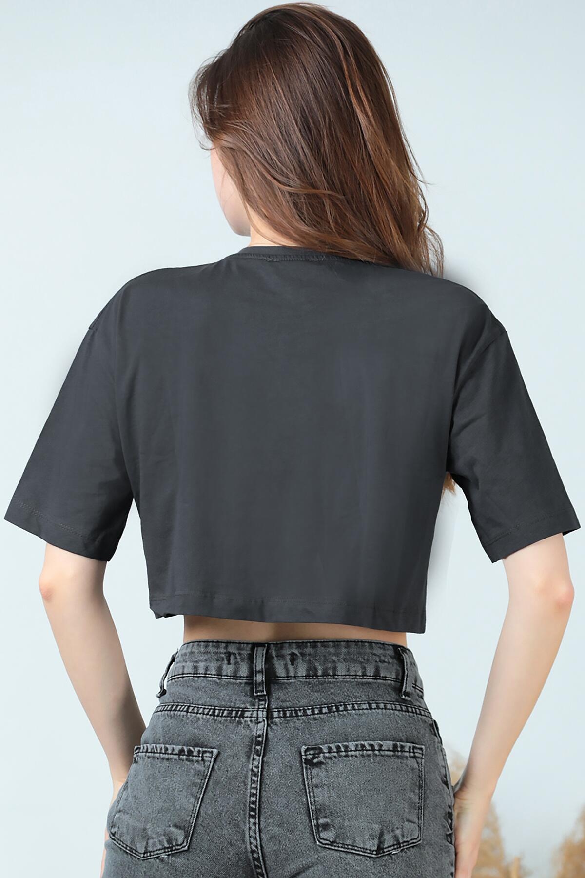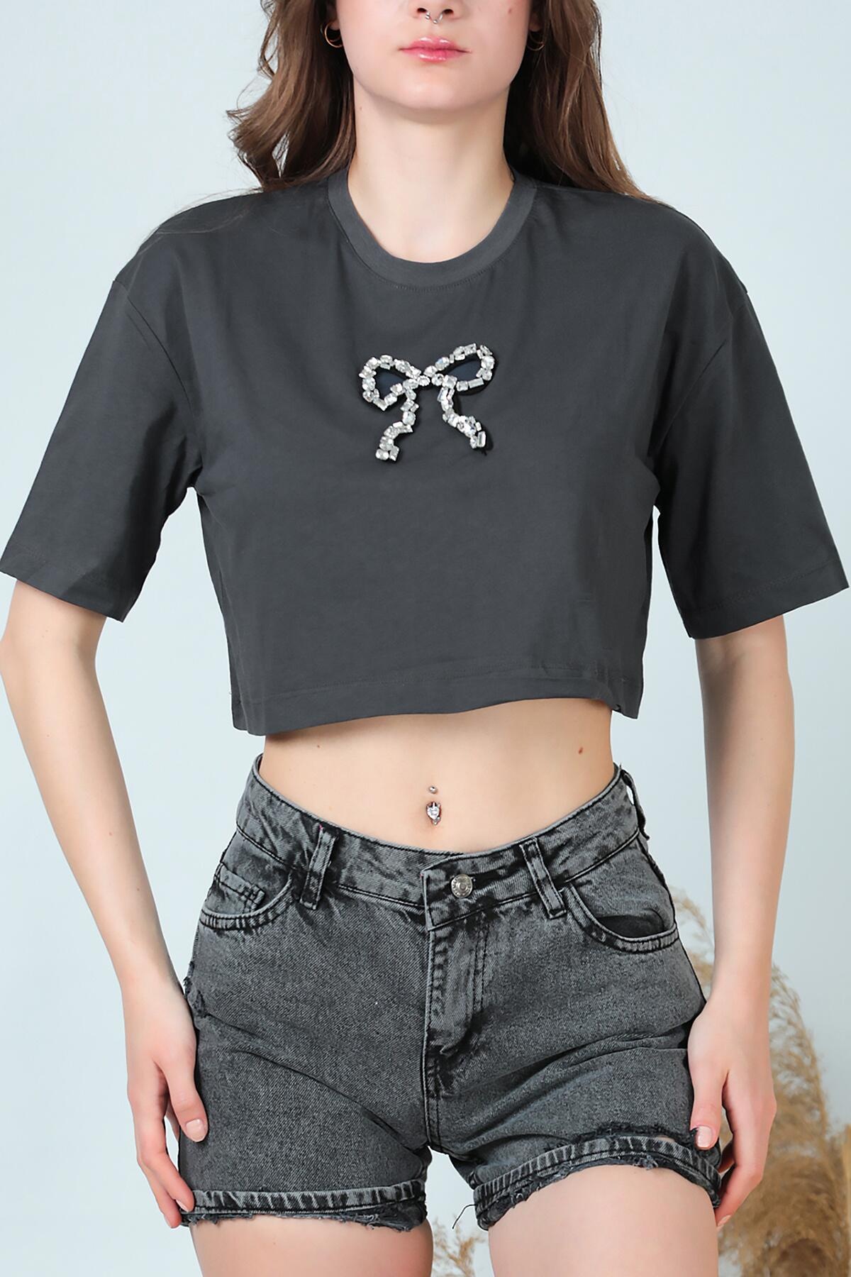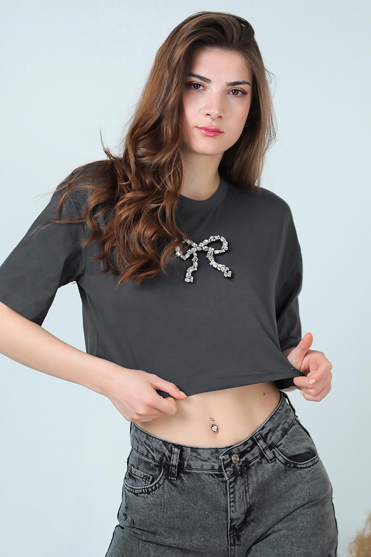 Kadın Bisiklet Yaka Taşlı T-shırt Füme