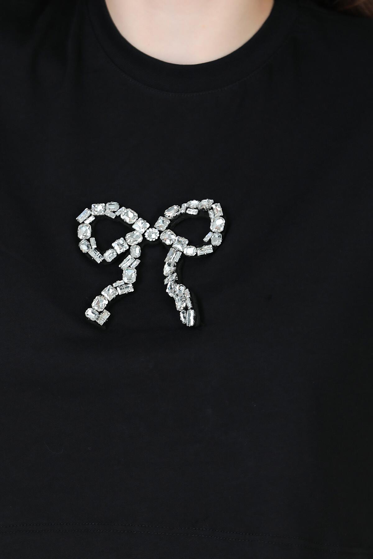 Kadın Bisiklet Yaka Taşlı T-shırt Siyah