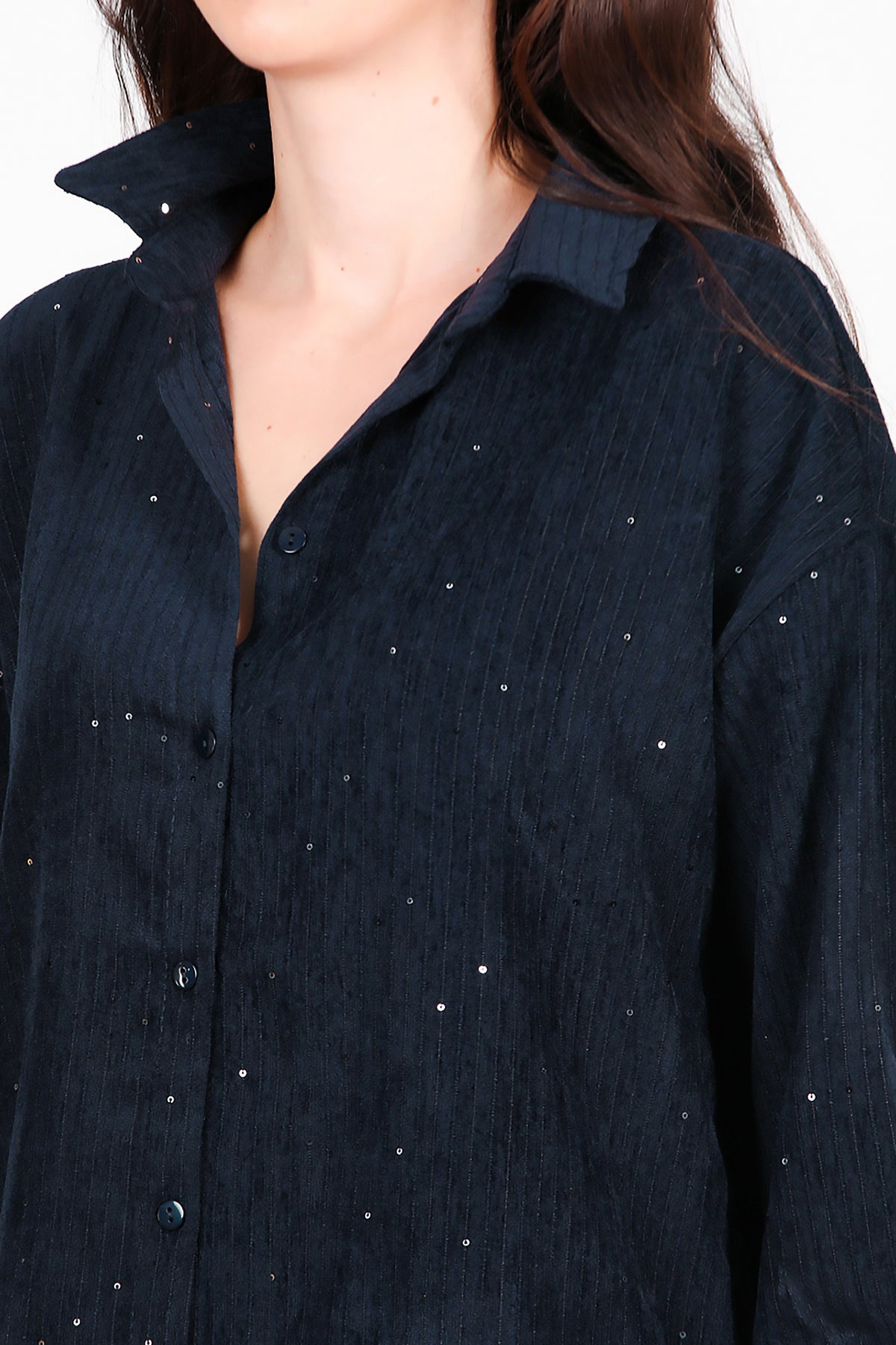 Kadın kadife pullu gömlek modelleri!Kadifenin yumuşak dokusu ve göz alıcı pul detayıyla özel gecelerde ve davetlerde tarzınızı tamamlar.Hızlı kargo.Hemen inceleyin!