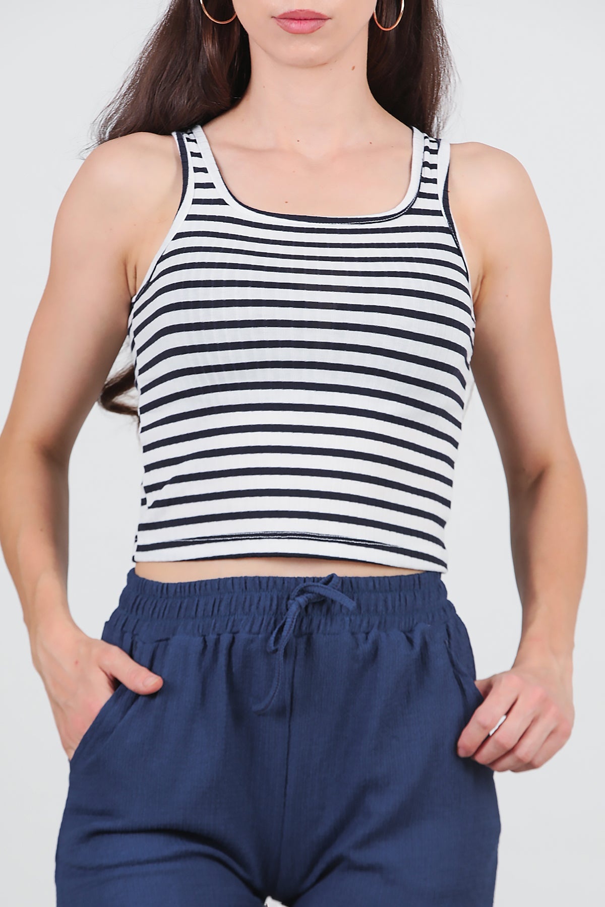 Kadın Kalın Çizgili Askılı Bluz Lacivert