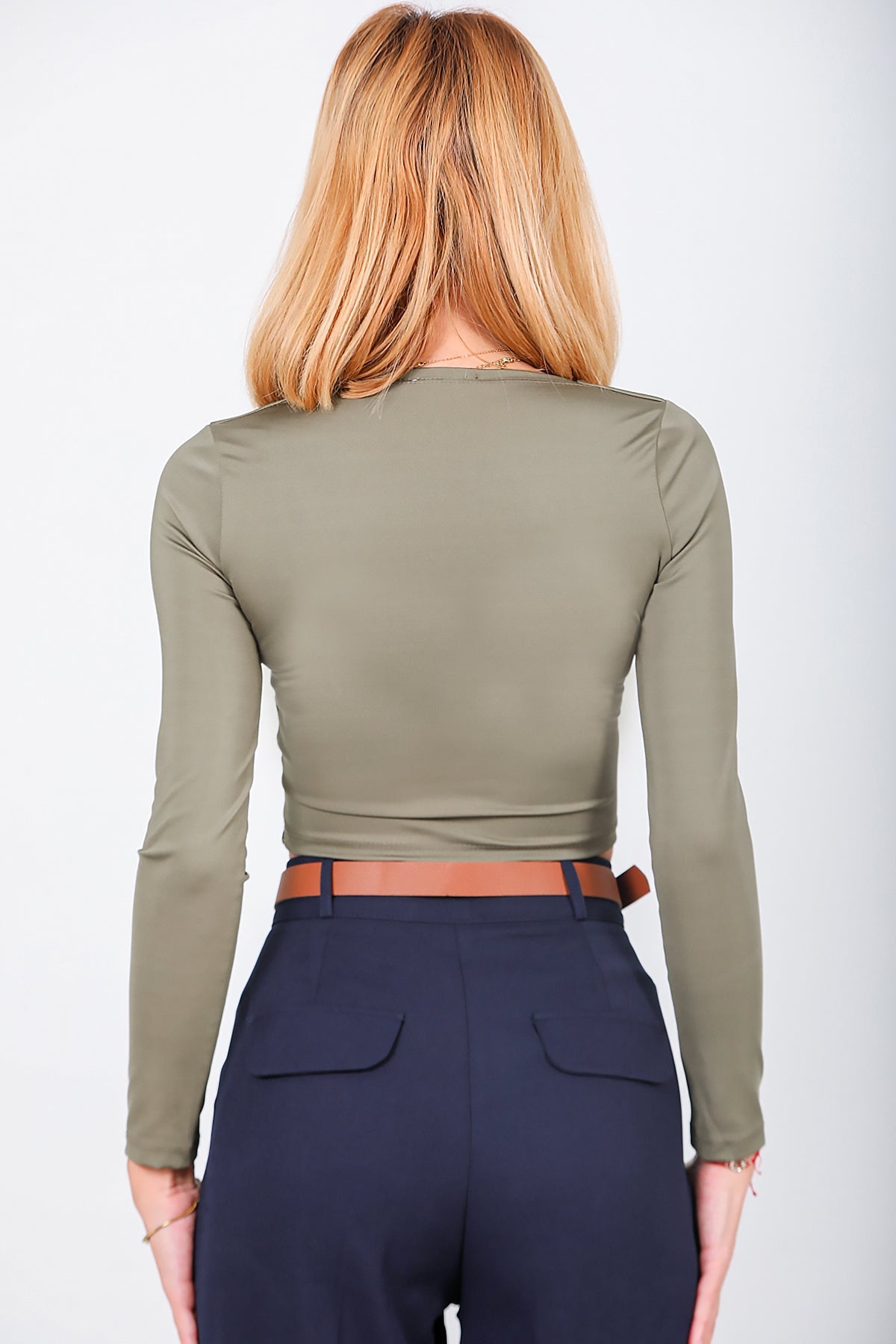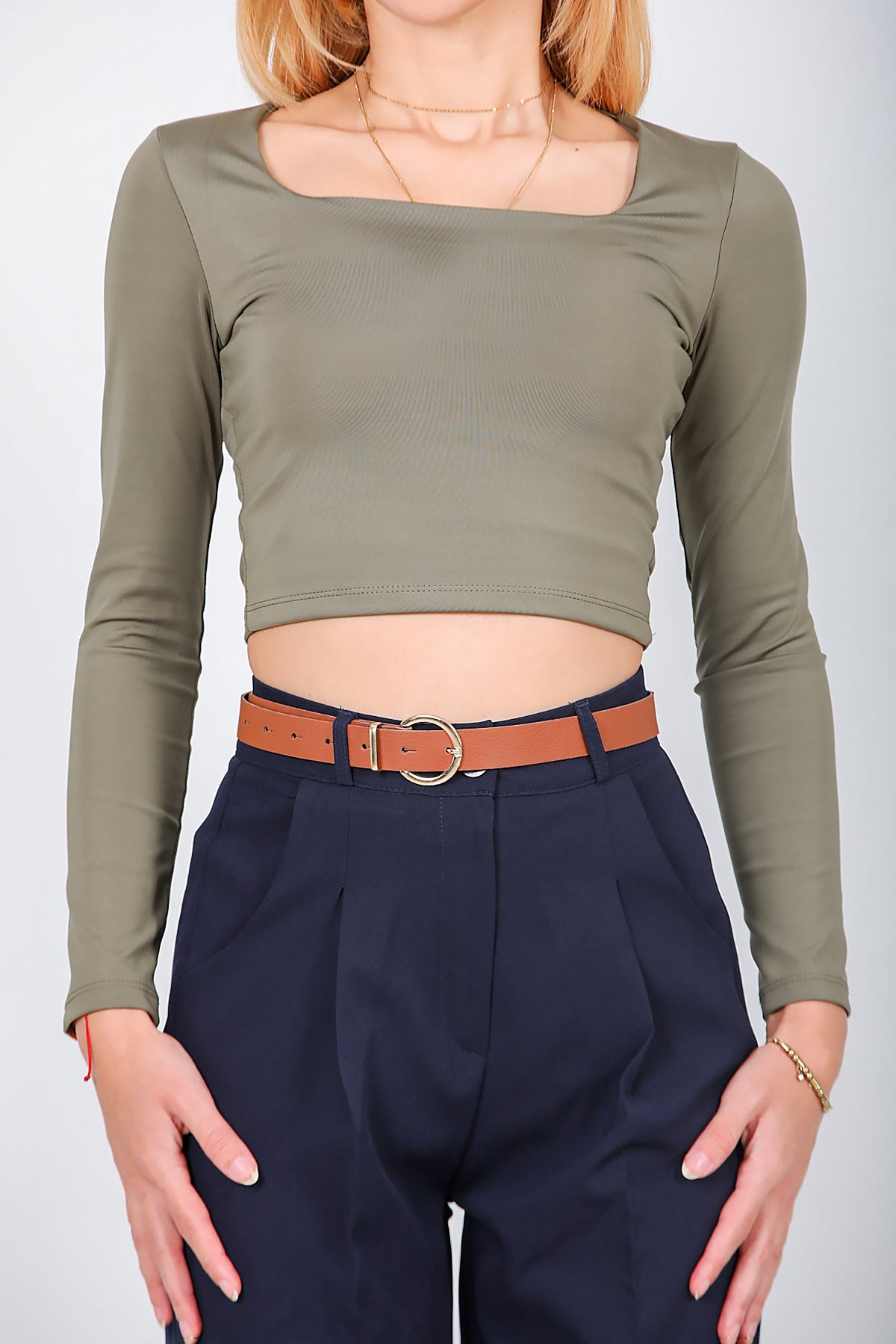 Kadın Kare Yaka Kısa Bluz Vizon