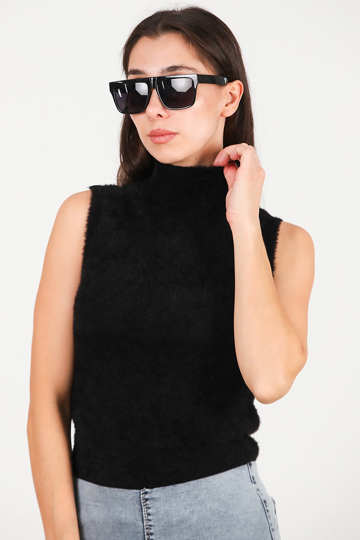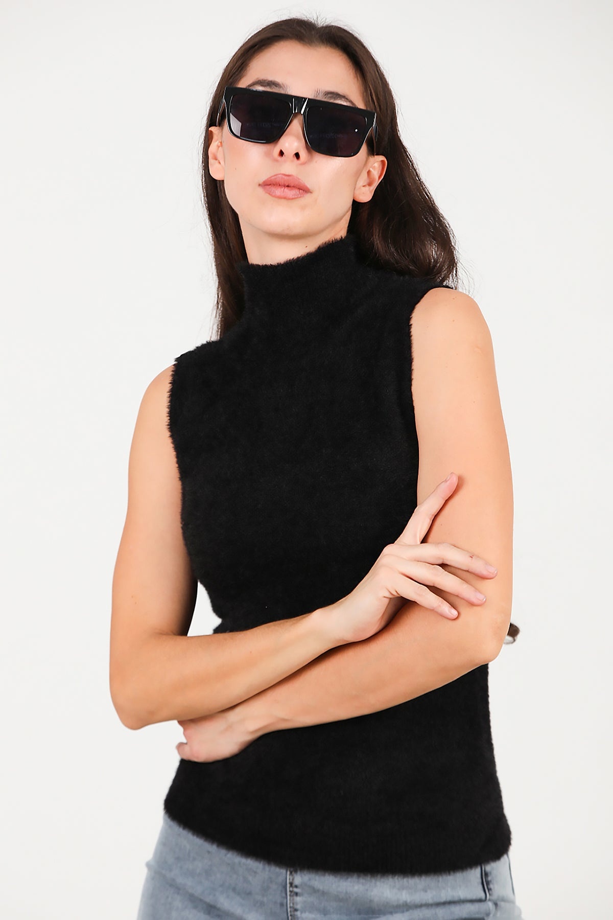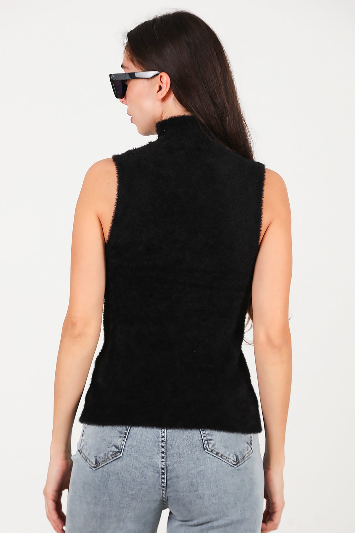 Kadın Kolsuz Balıkçı Yaka Sakallı Bluz Siyah