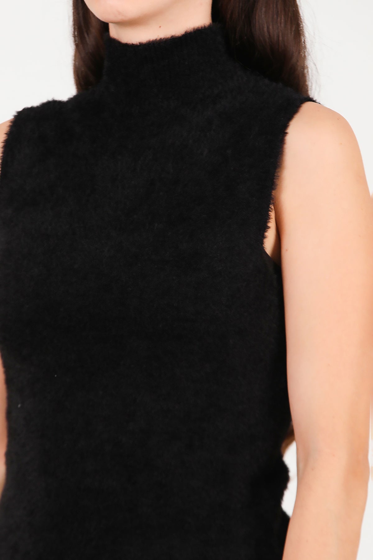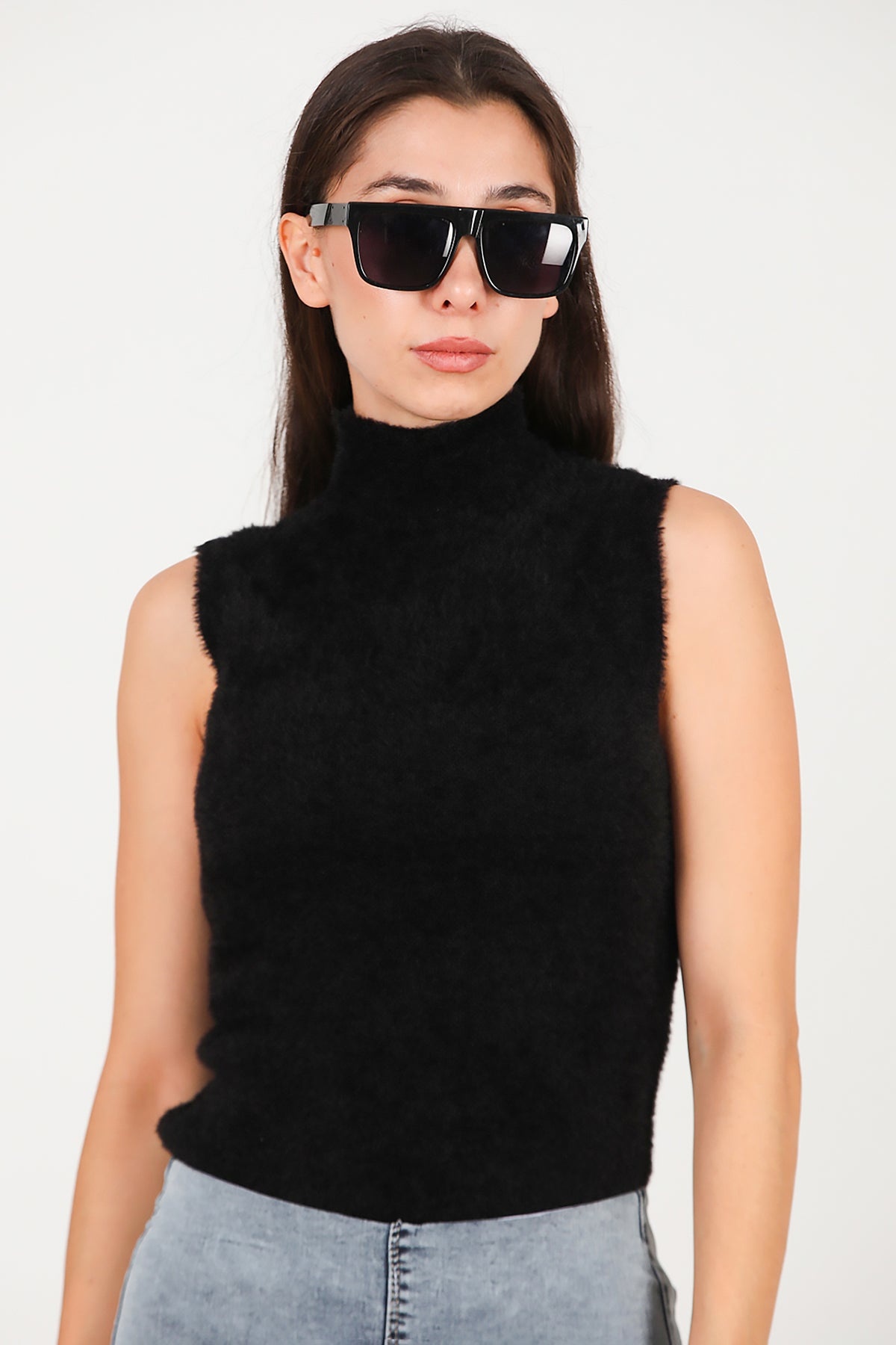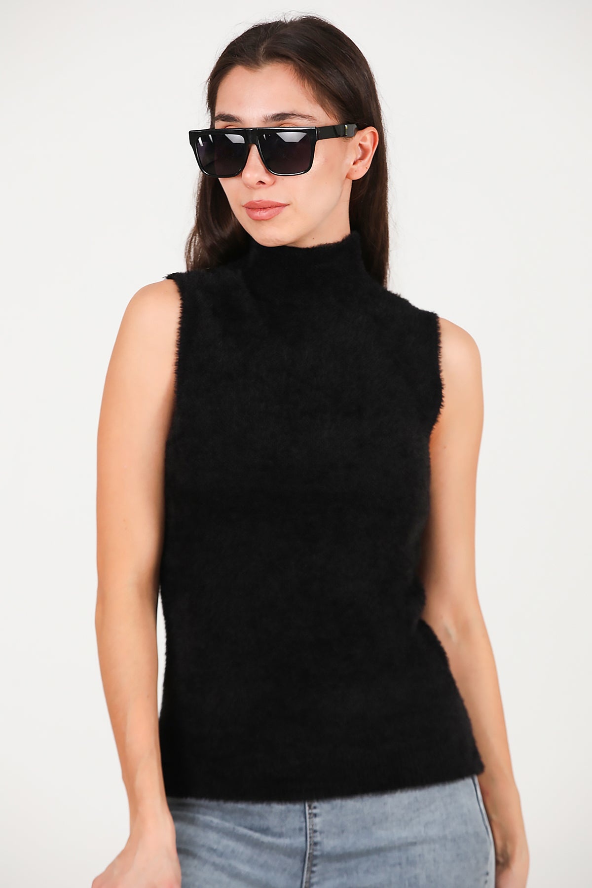 Kadın Kolsuz Balıkçı Yaka Sakallı Bluz Siyah