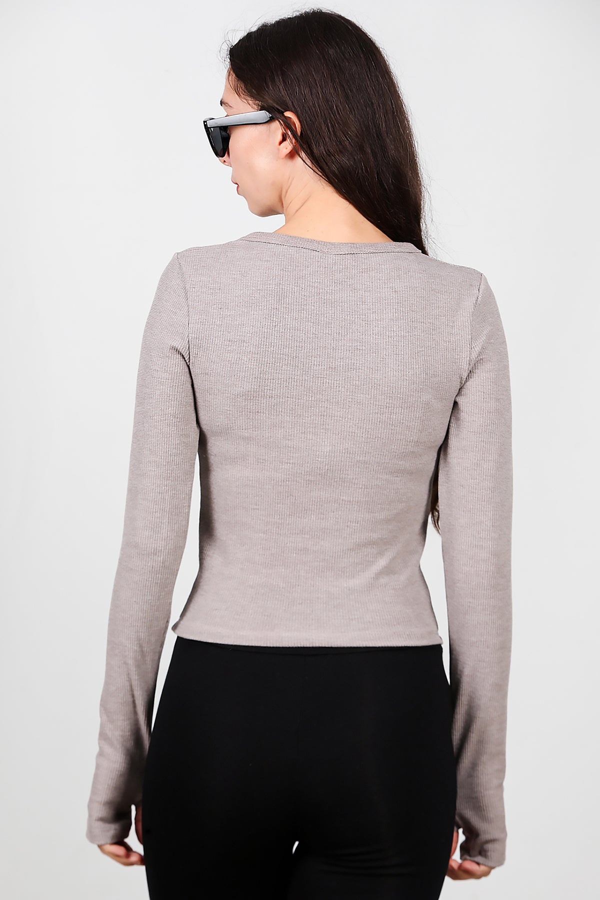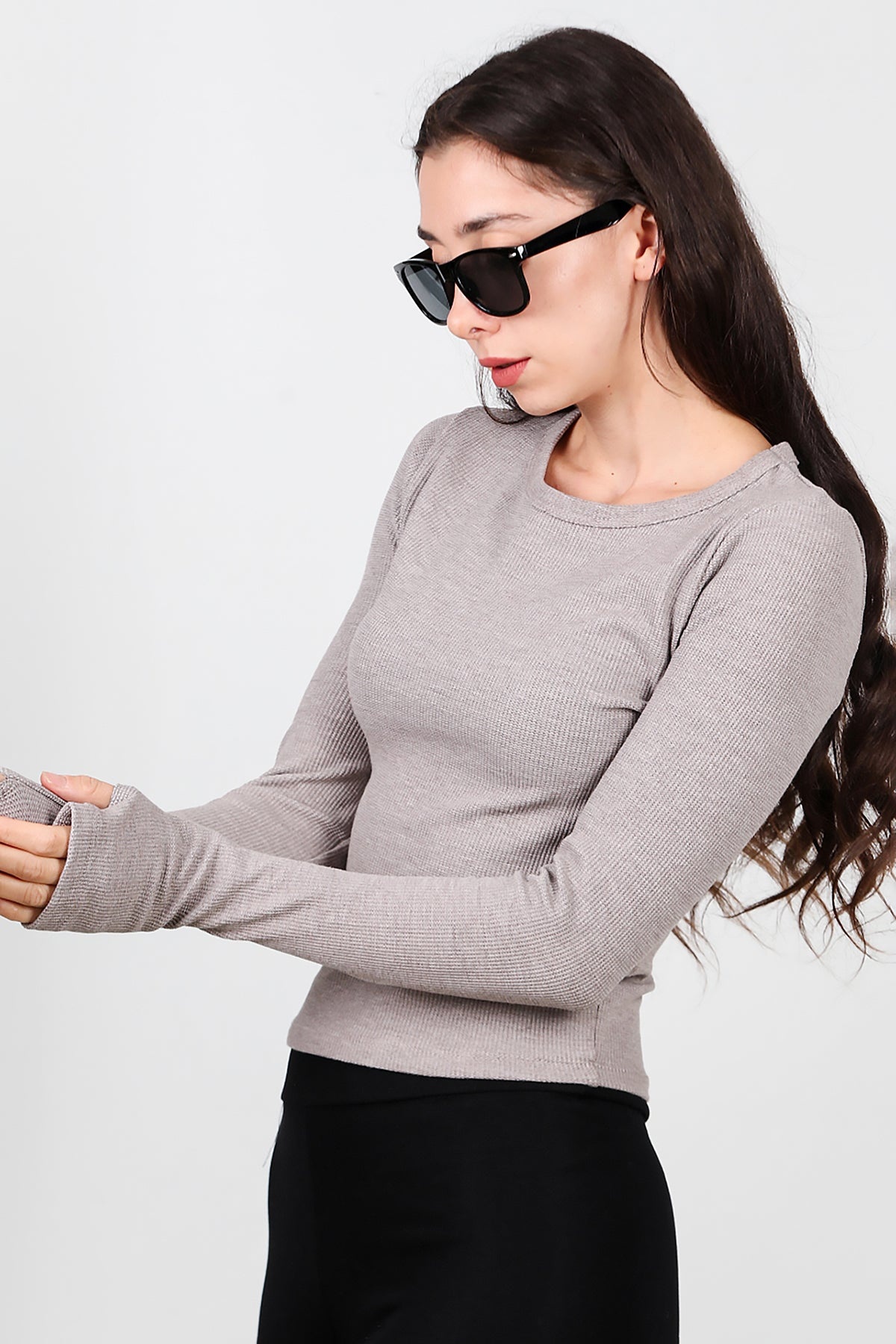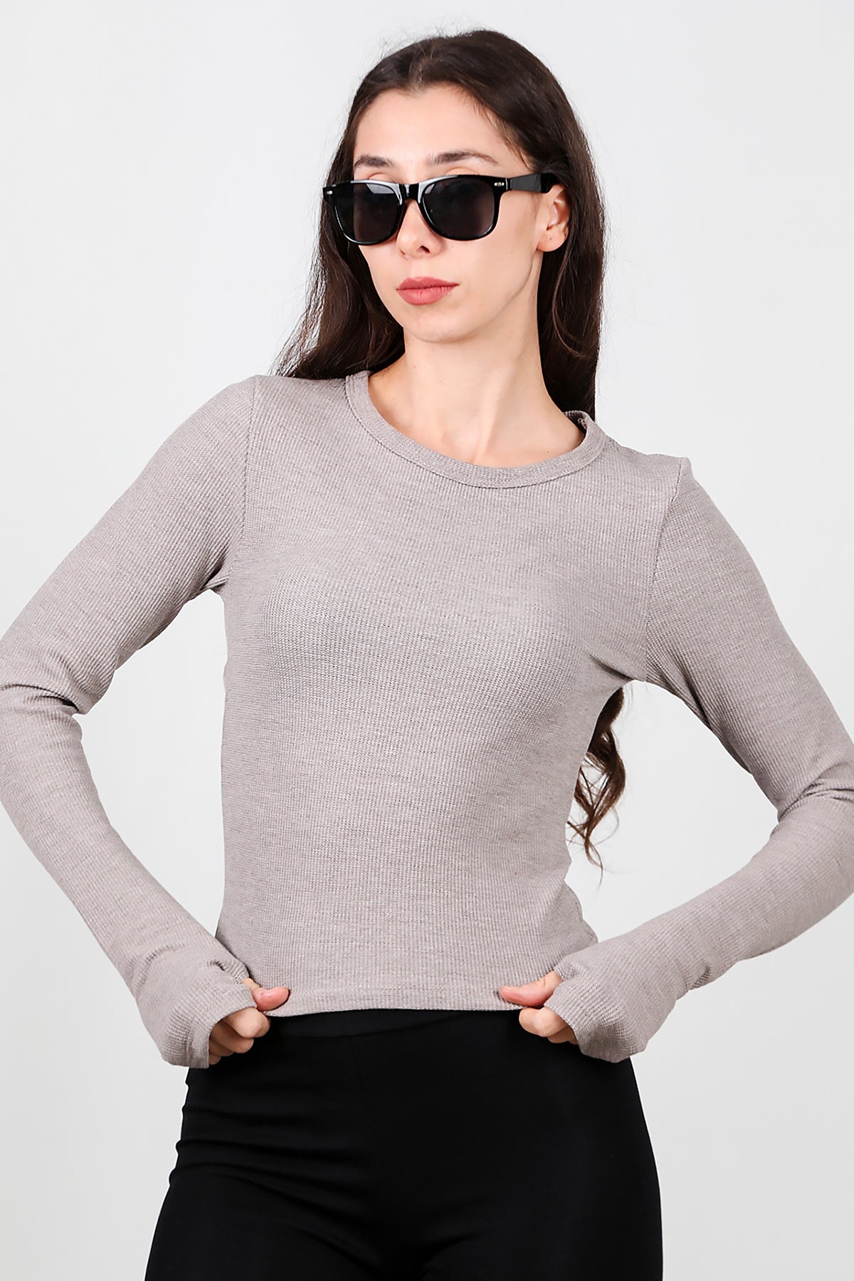 Kadın Parmak Geçmeli Waffle Bluz Vizon