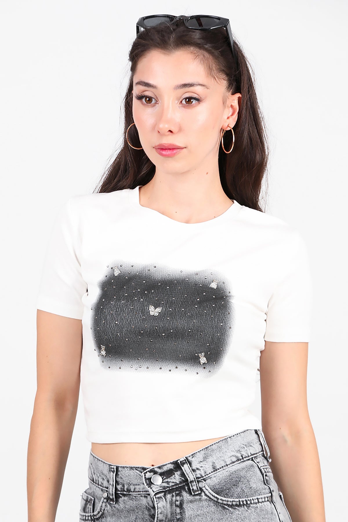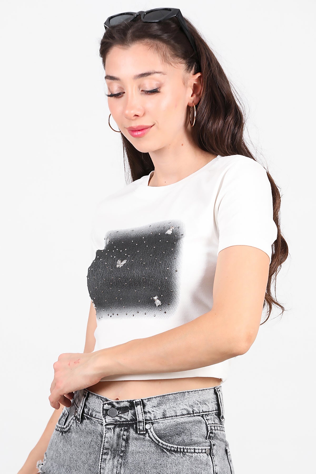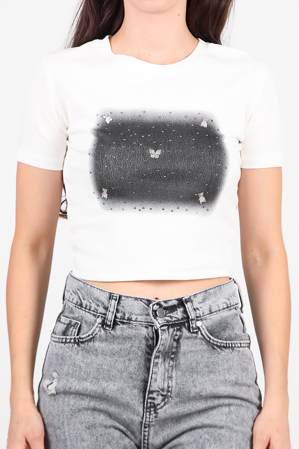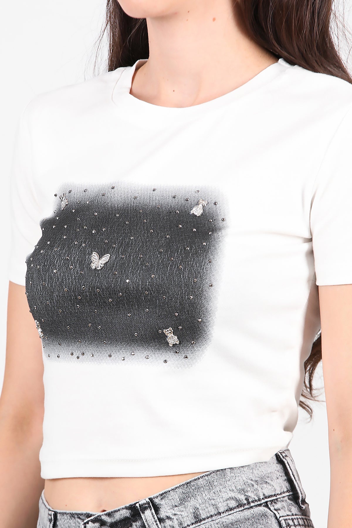Kadın Taş Baskılı Tshırt Ekru