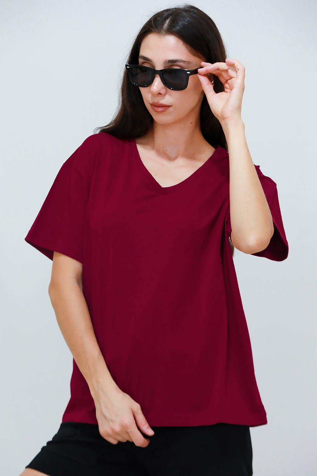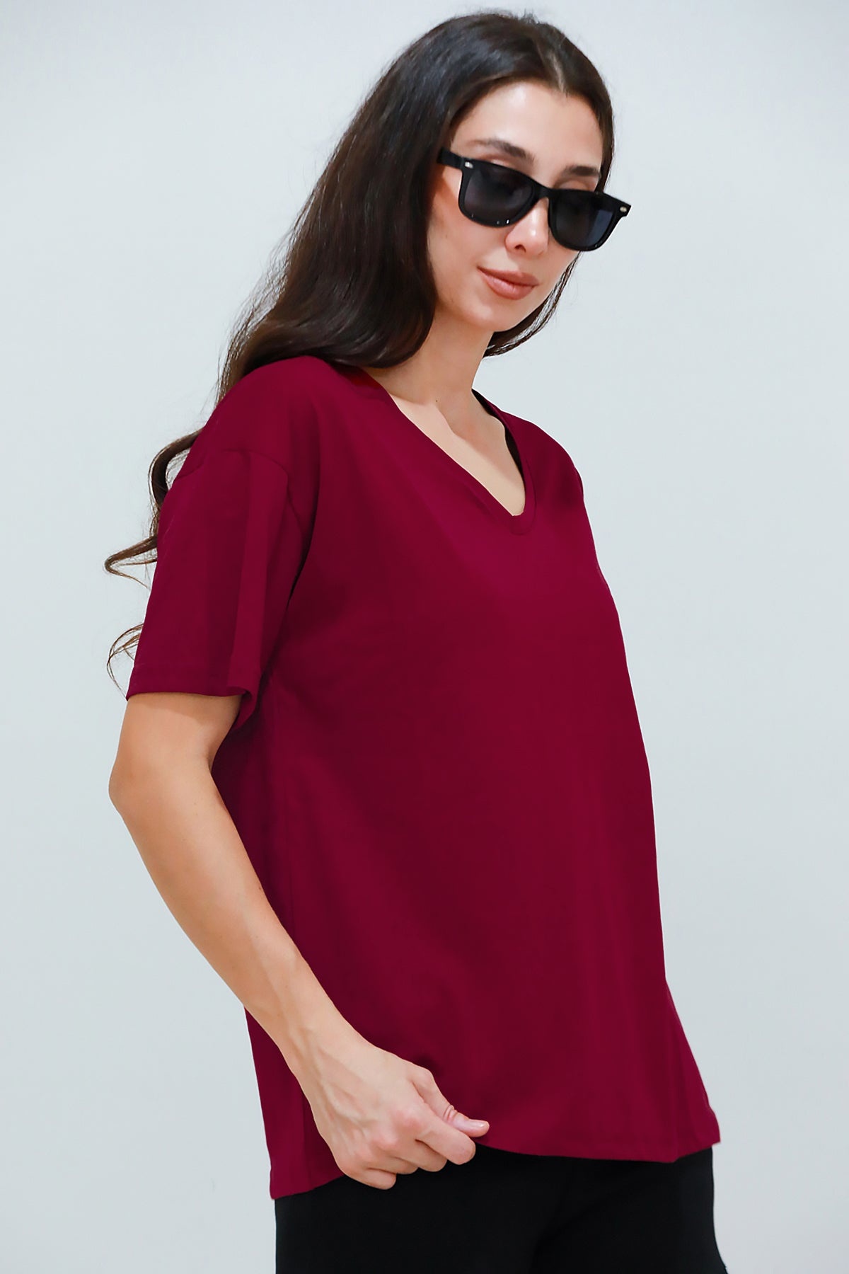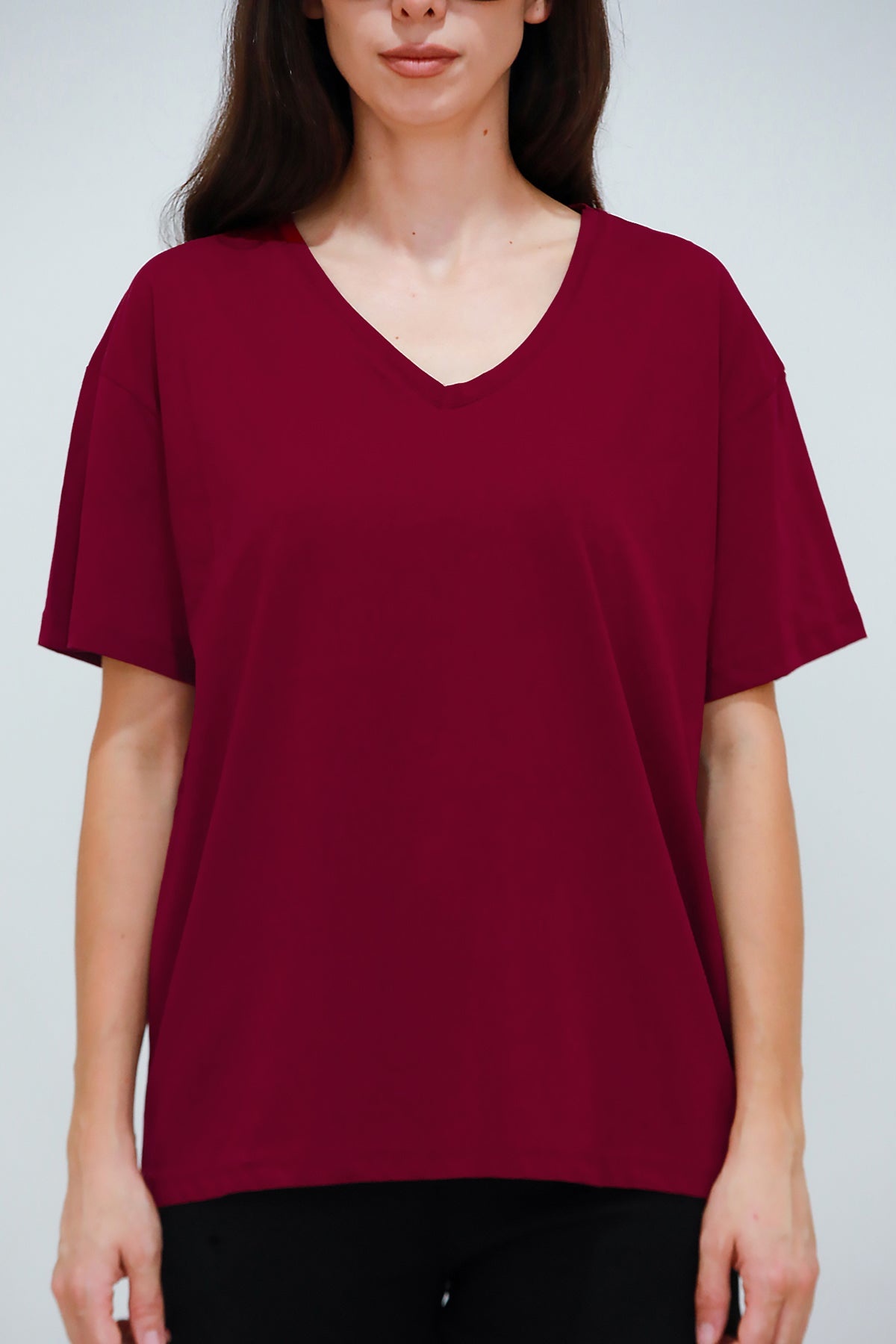 Kadın V Yaka Owersize Tshırt Bordo