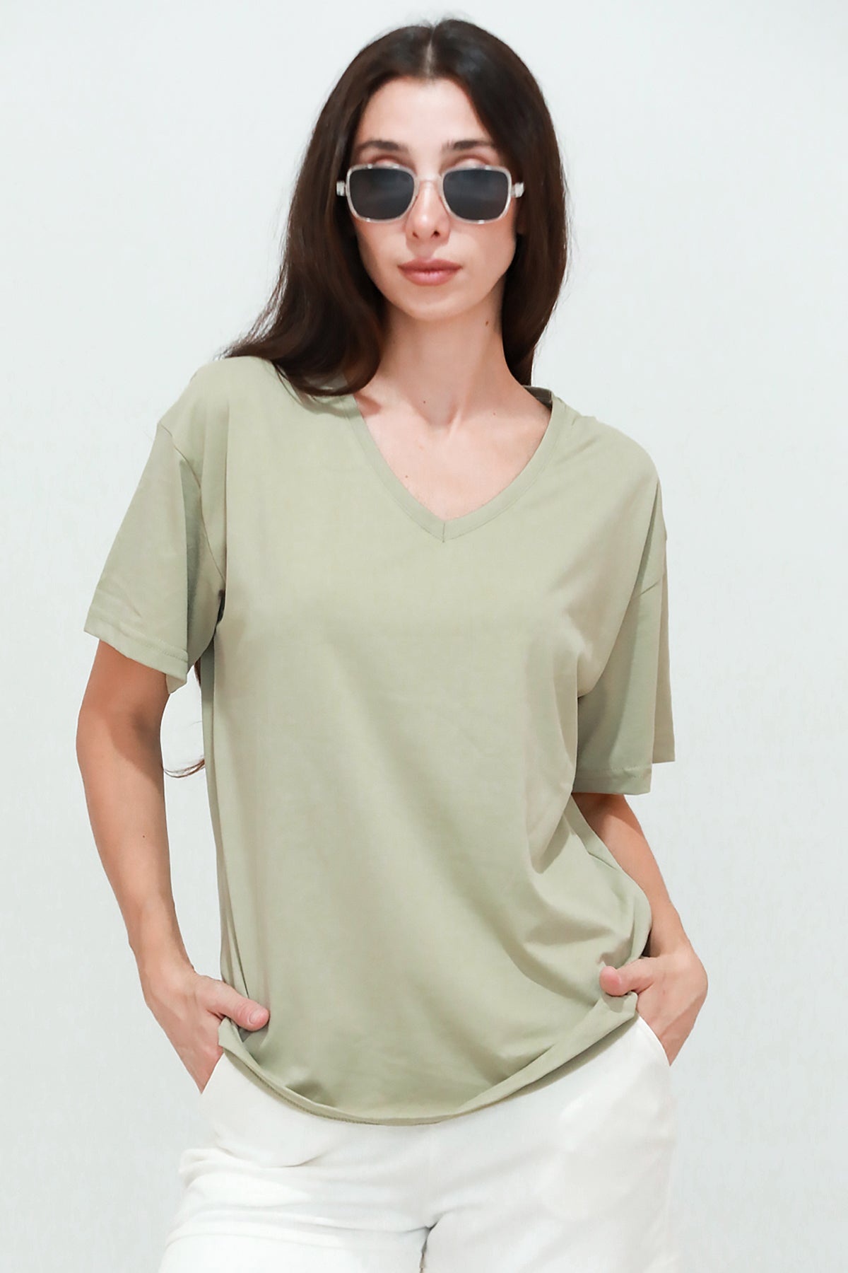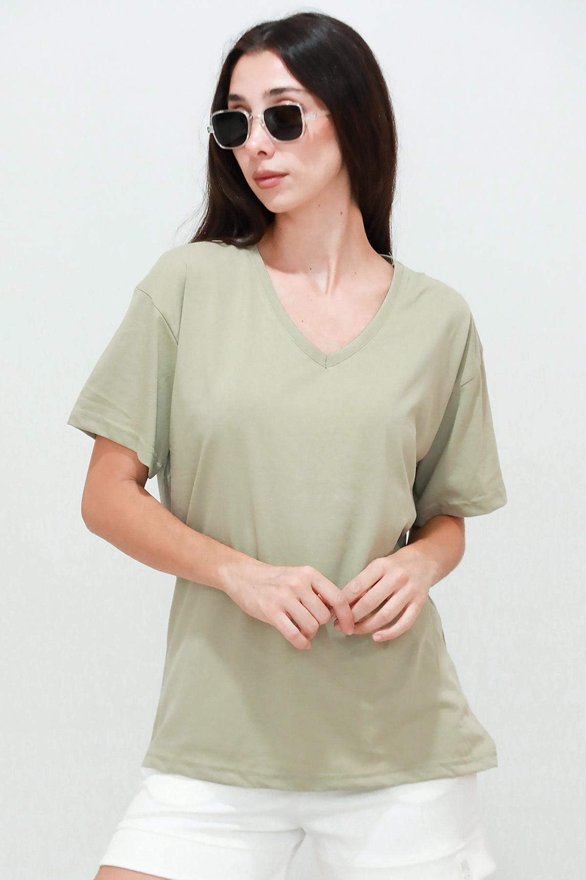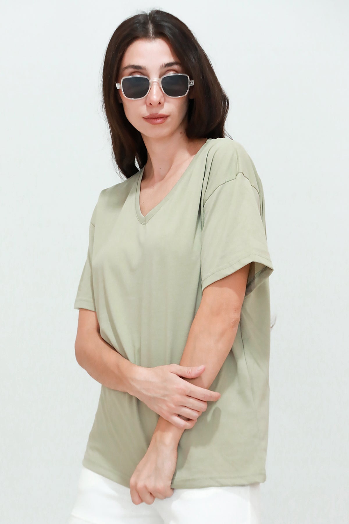 Kadın V Yaka Owersize Tshırt Haki