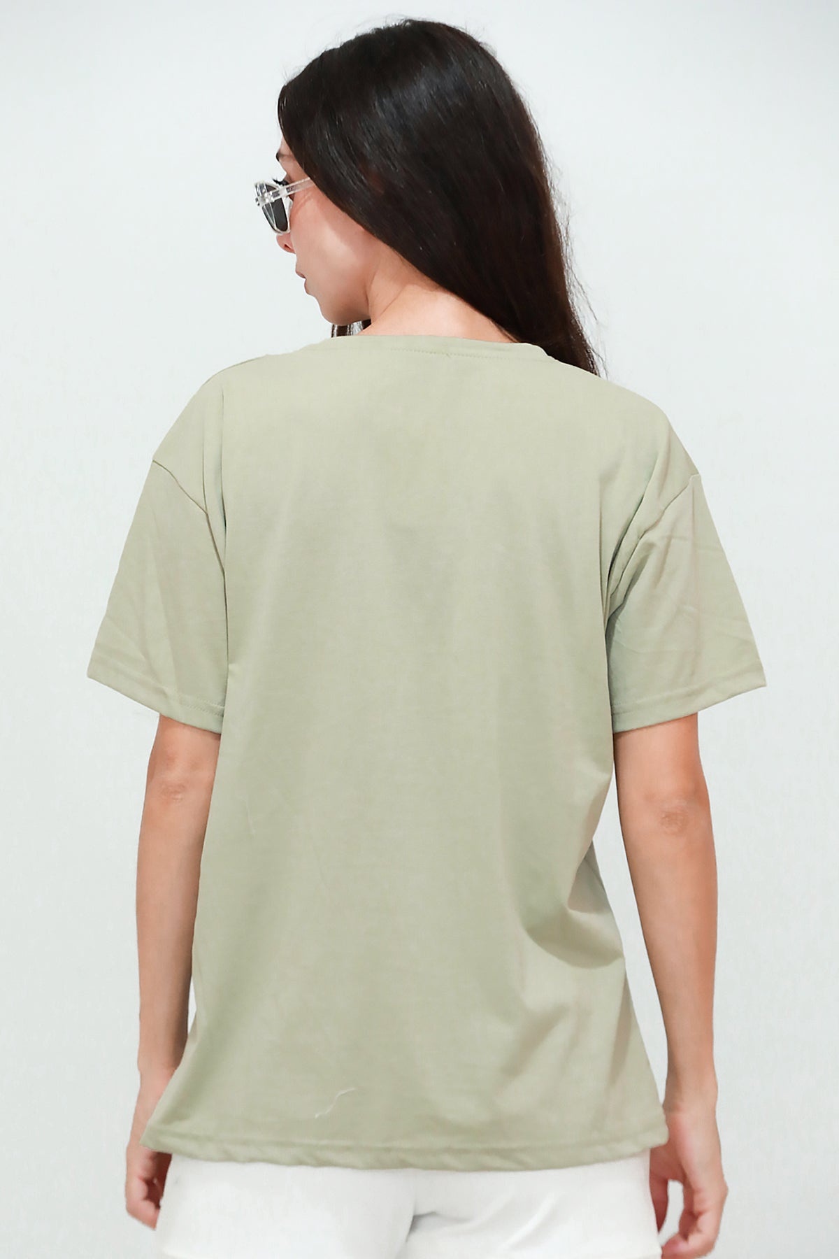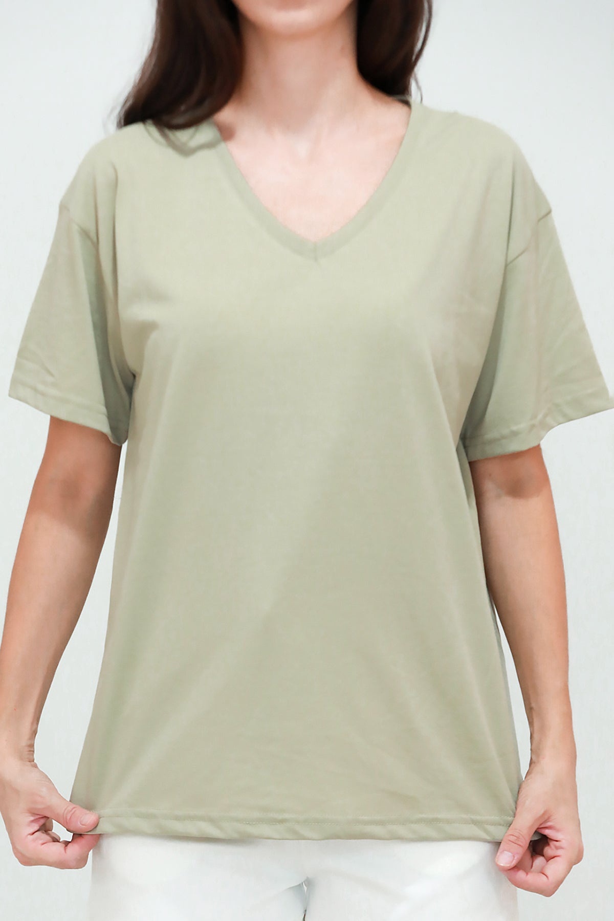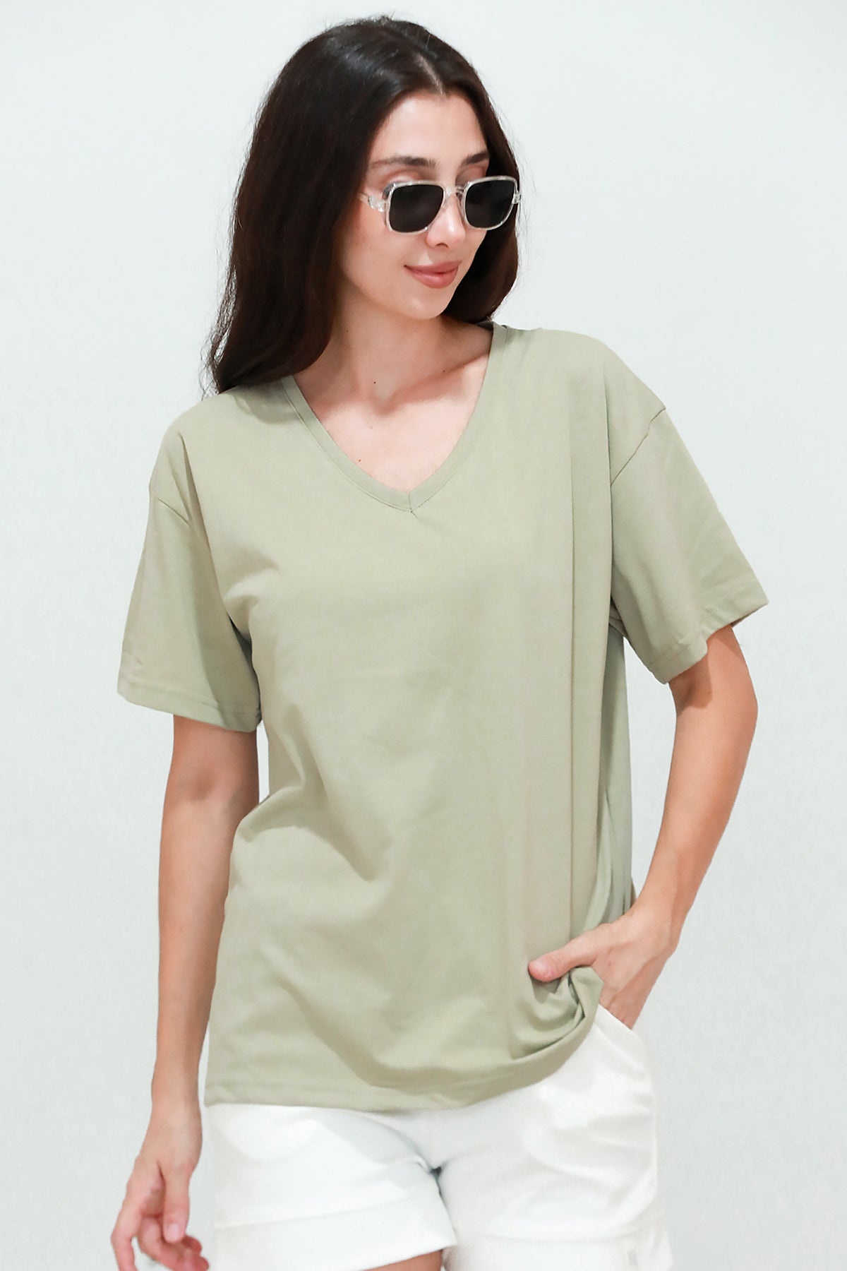 Kadın V Yaka Owersize Tshırt Haki