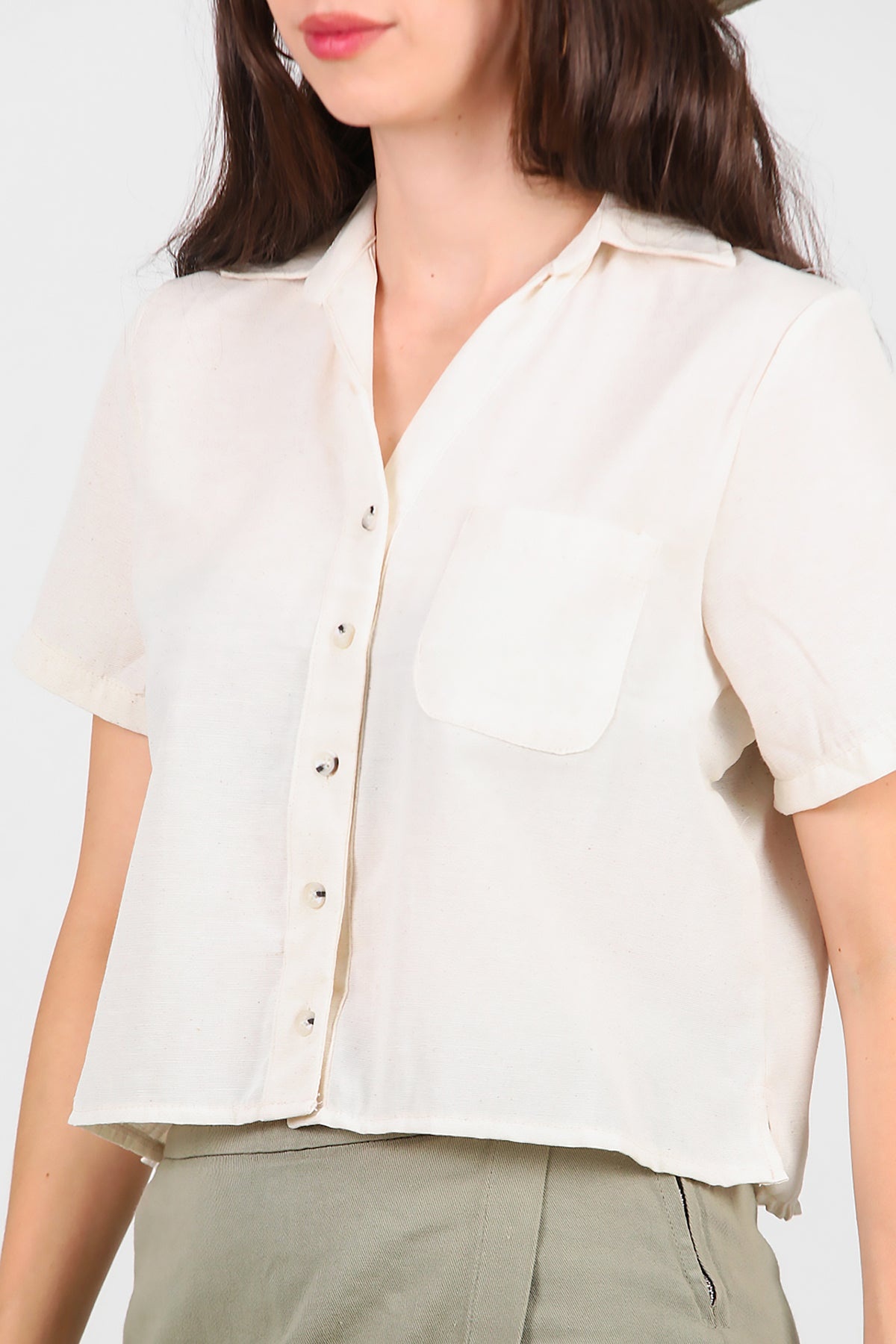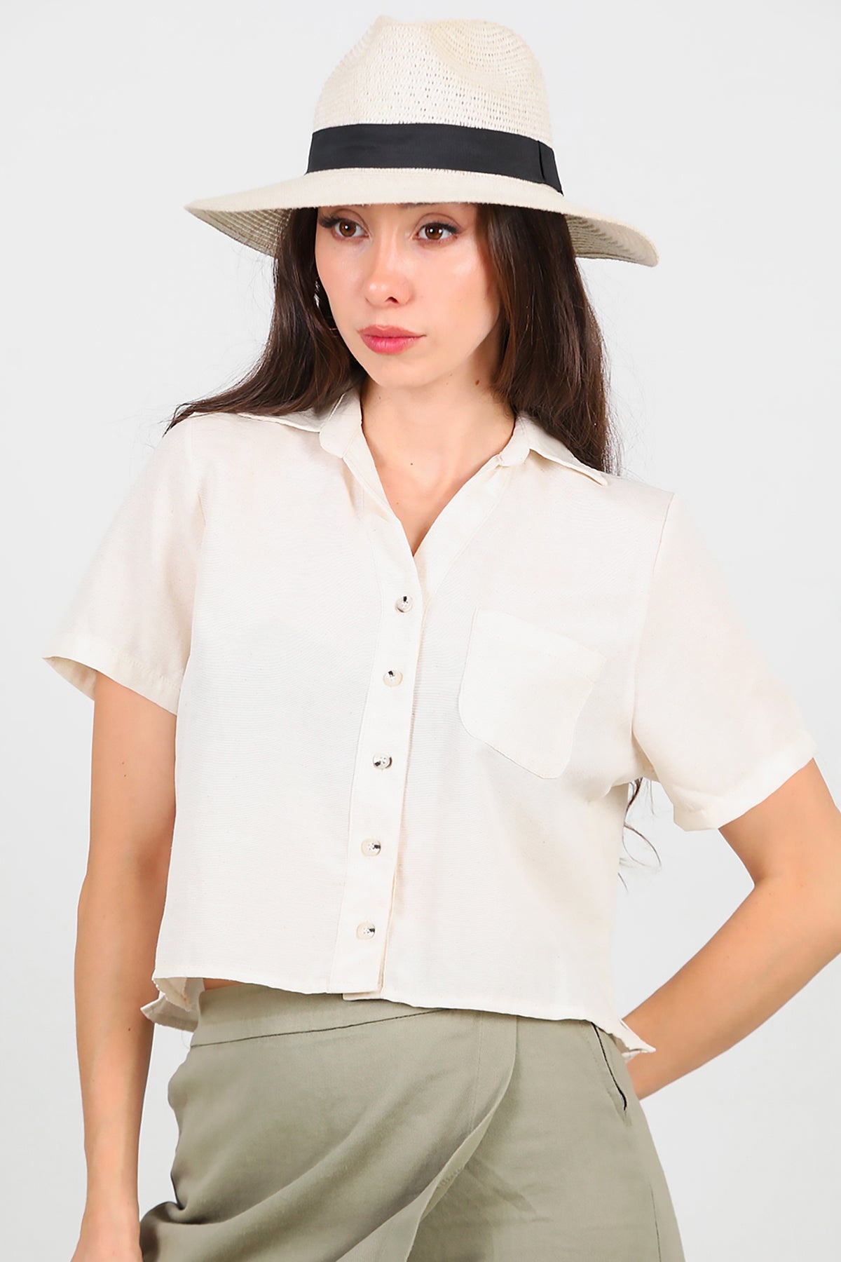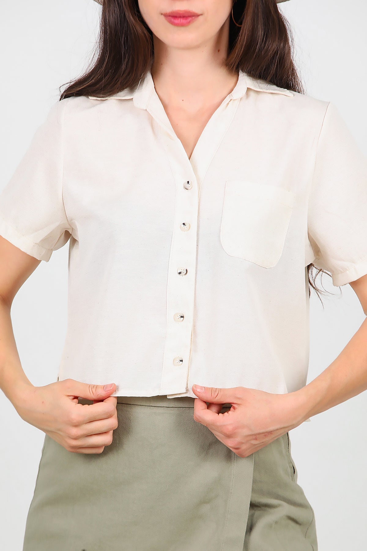 Kadın Yakalı Düğmeli Keten Gömlek Taş