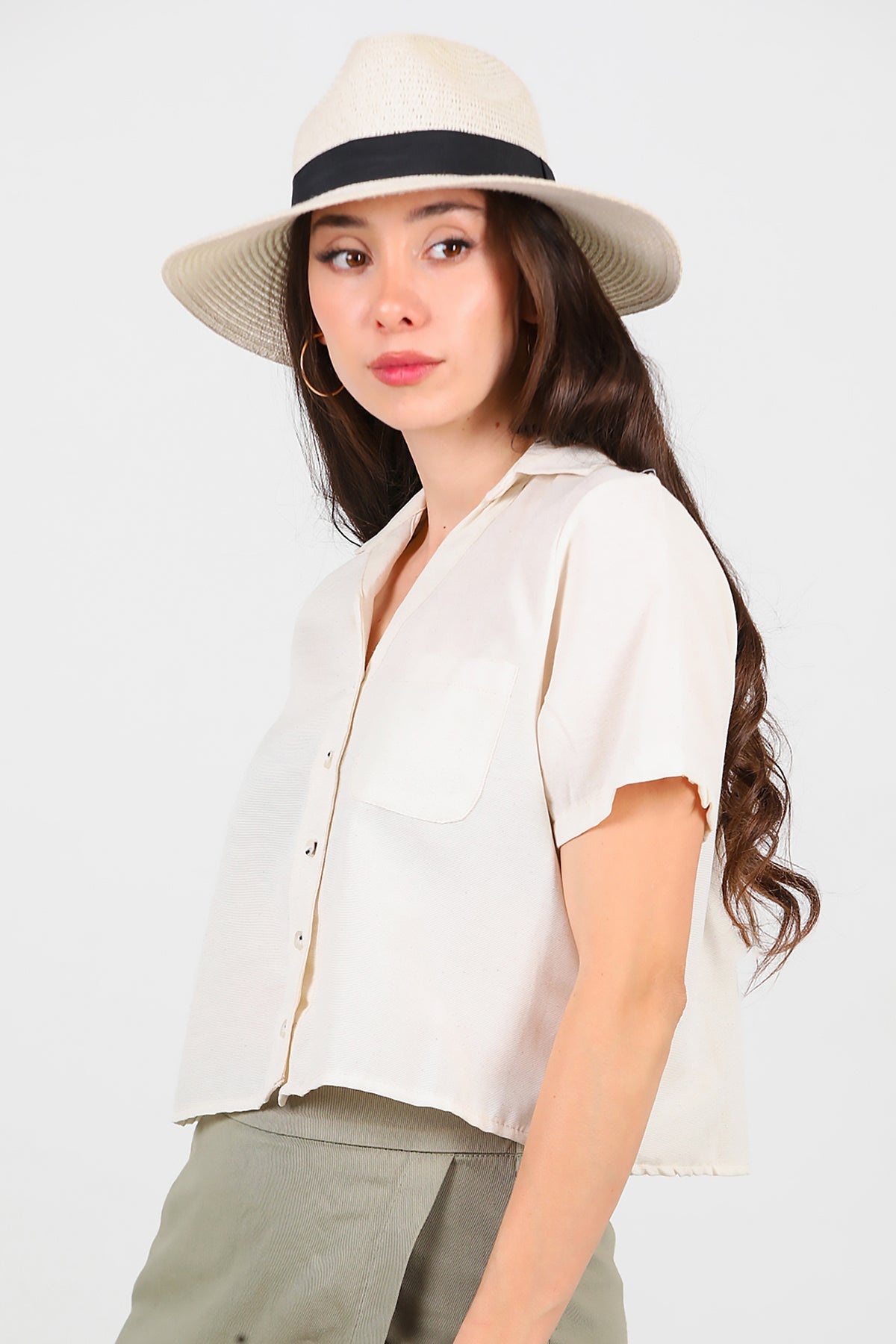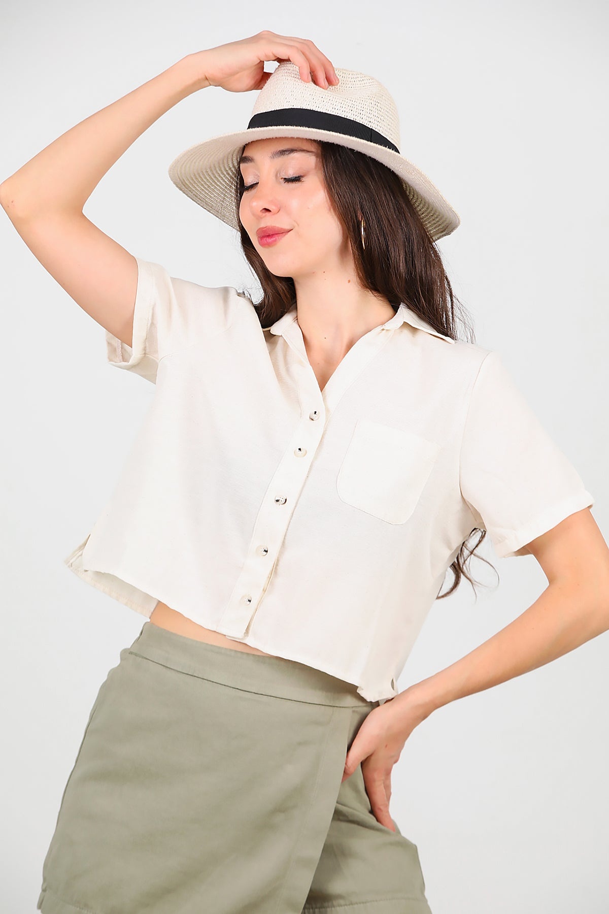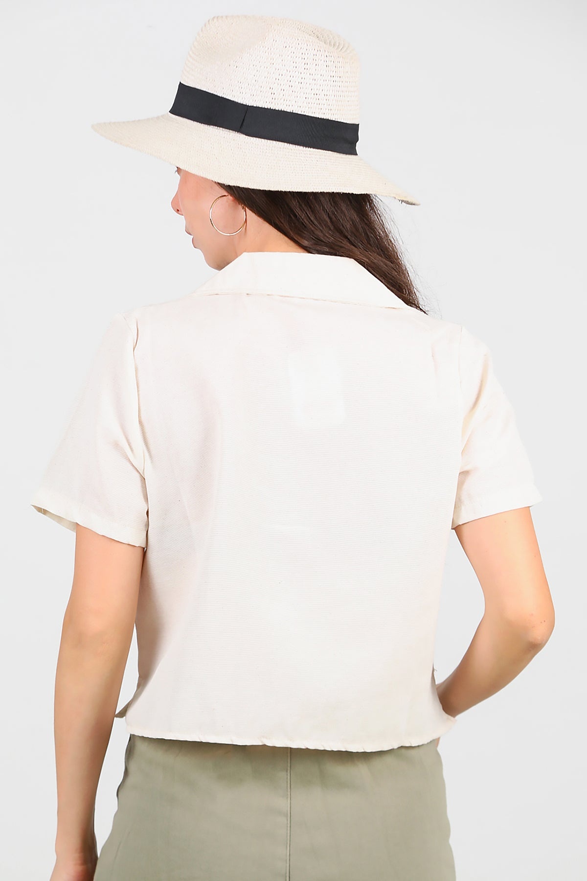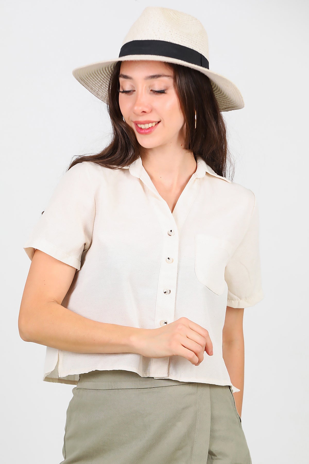 Kadın Yakalı Düğmeli Keten Gömlek Taş