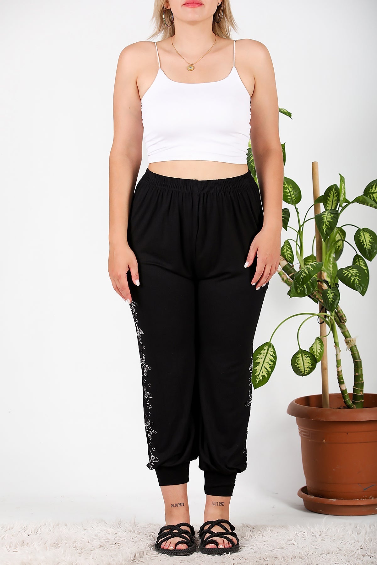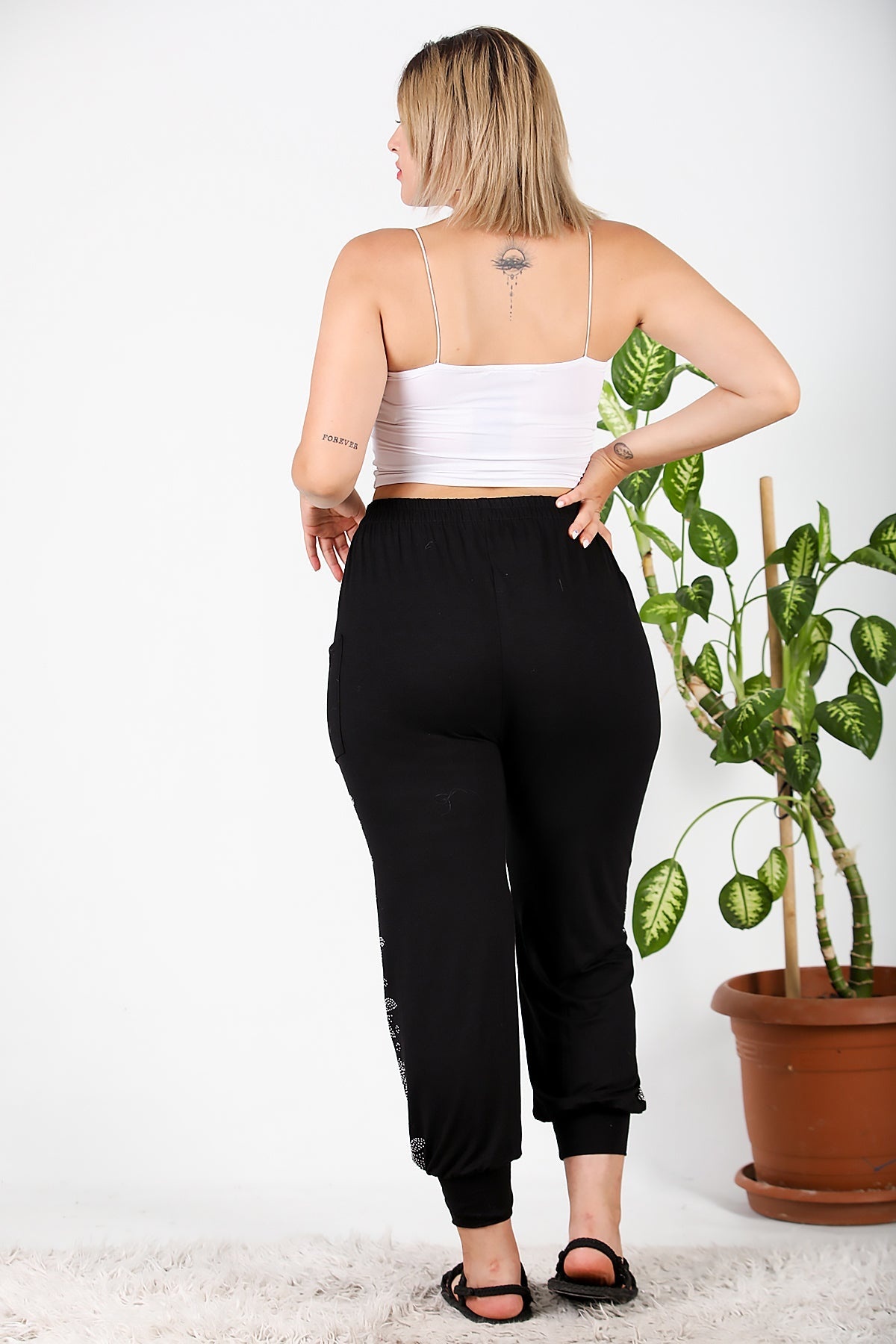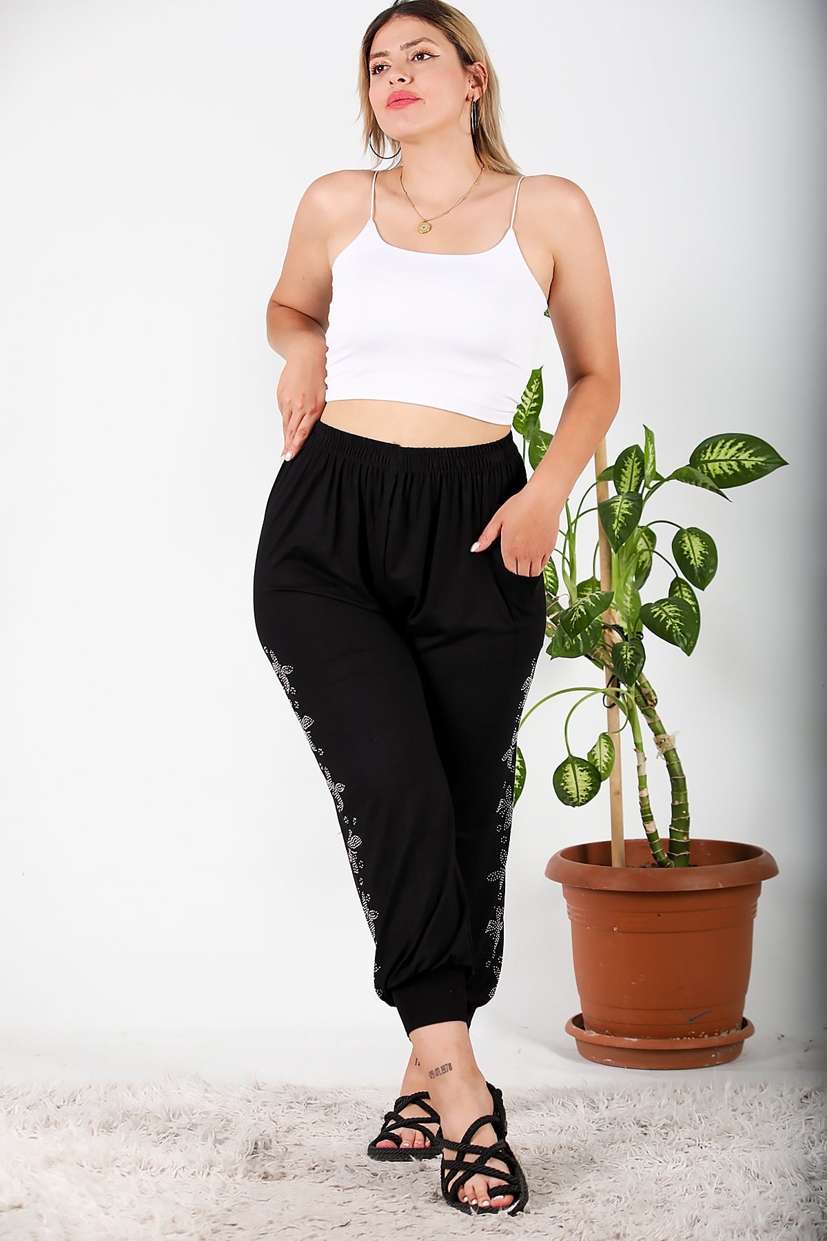 Büyük Beden Yanları Taşlı Şalvar Black Siyah