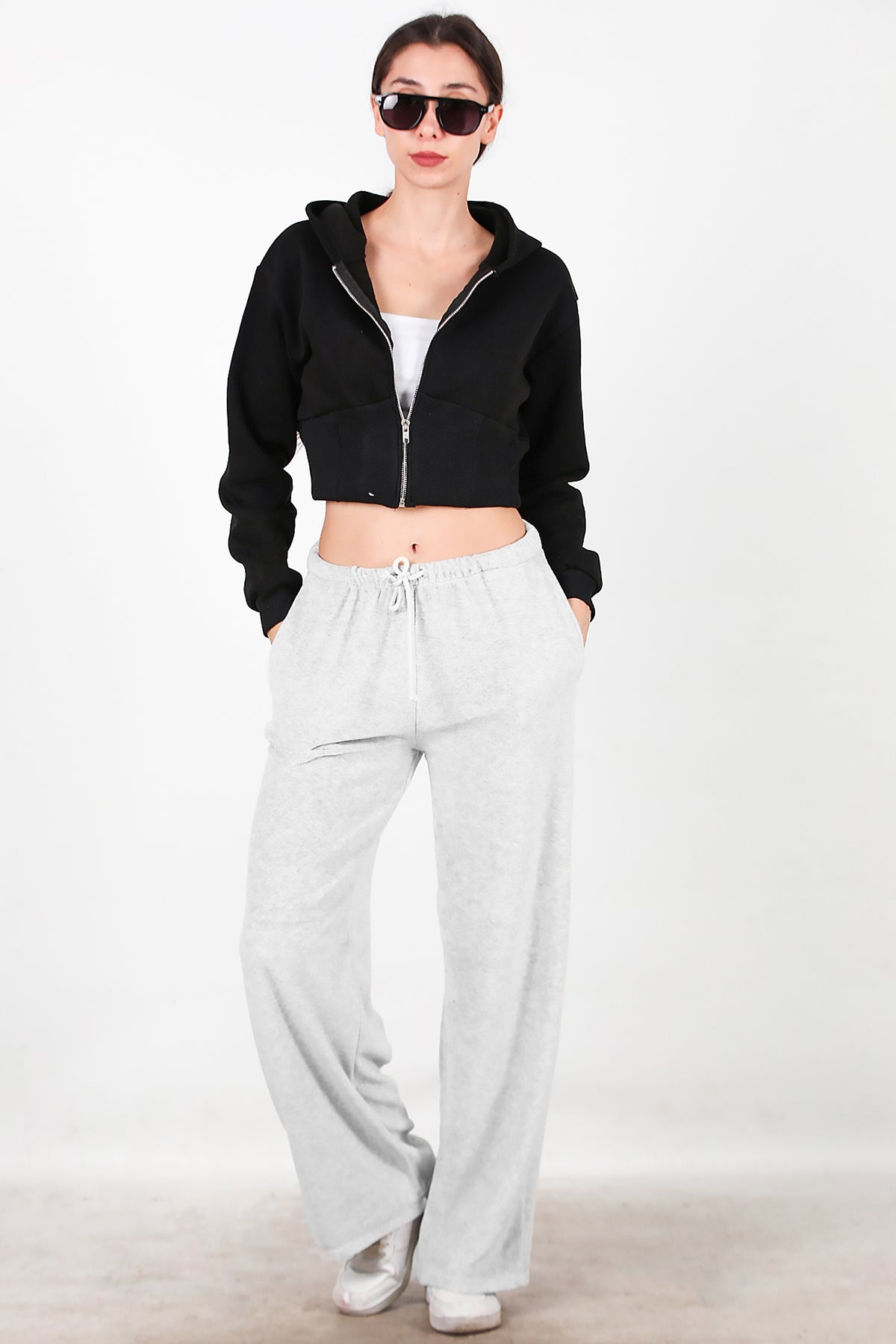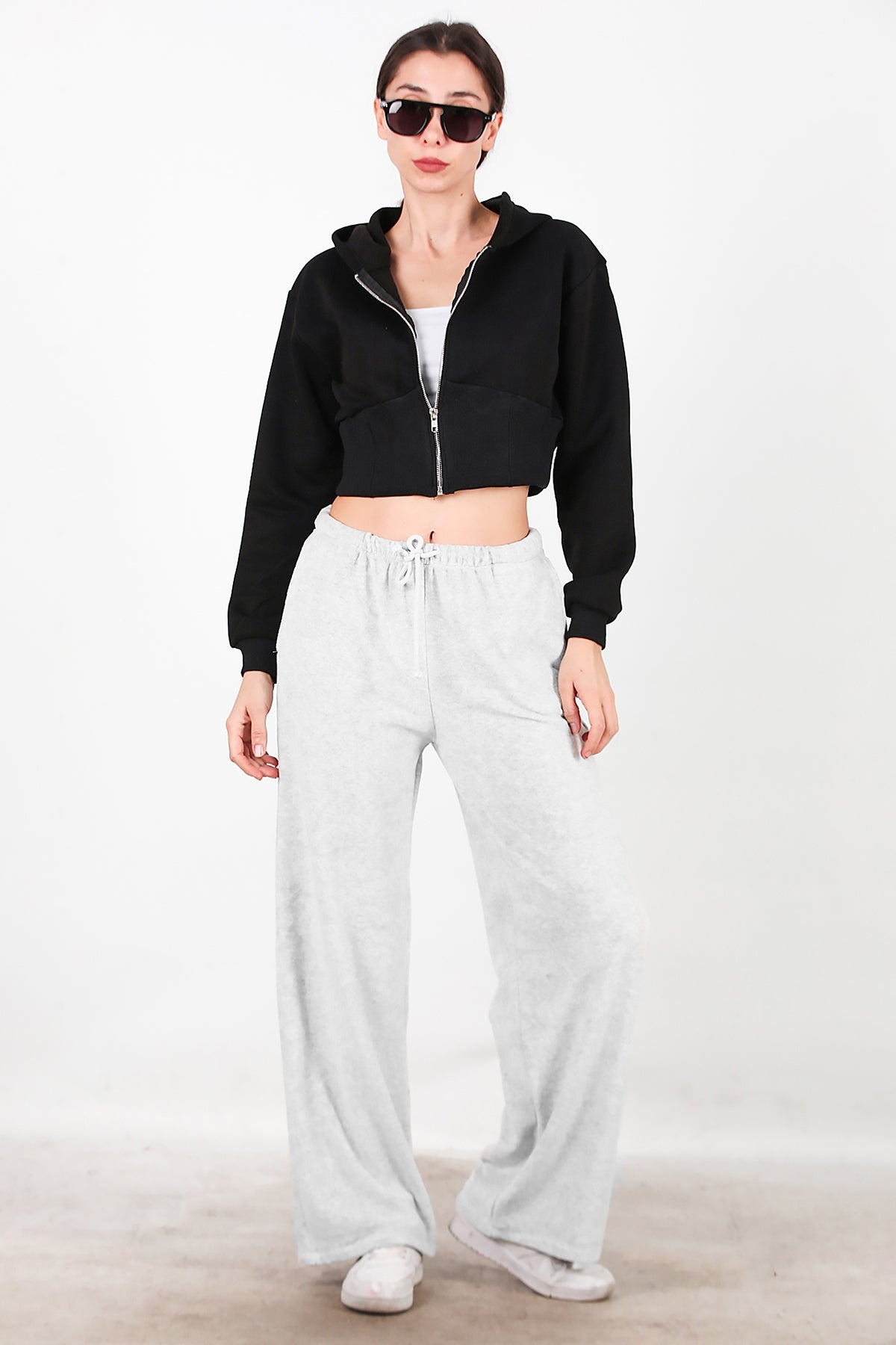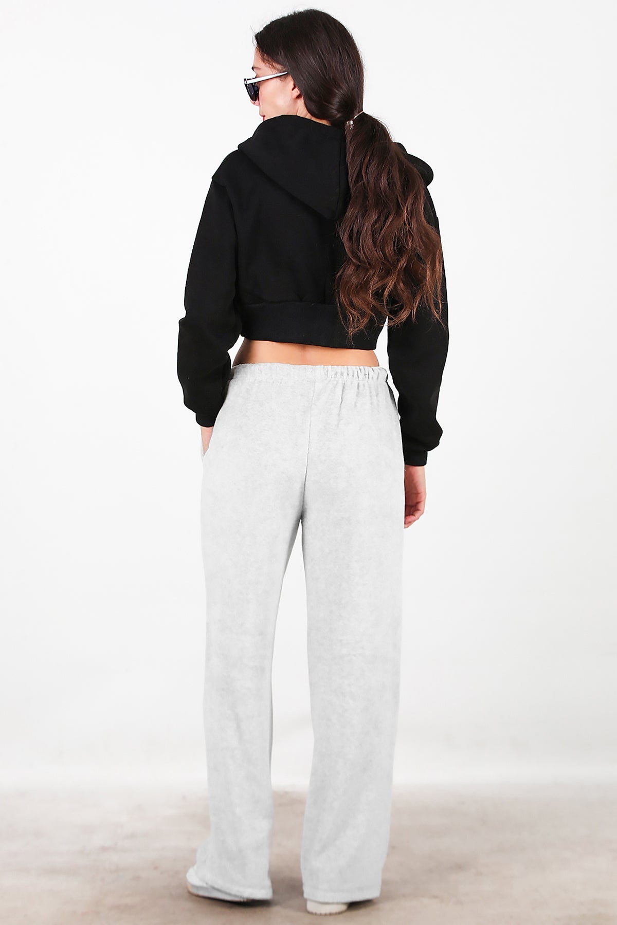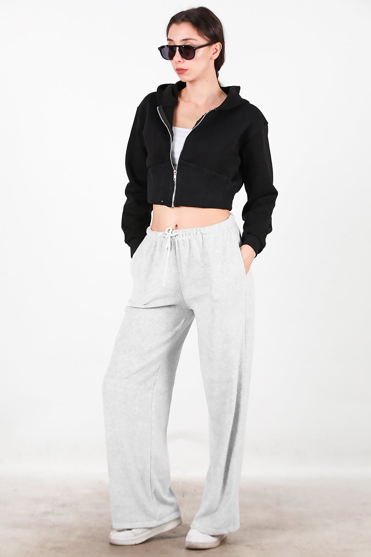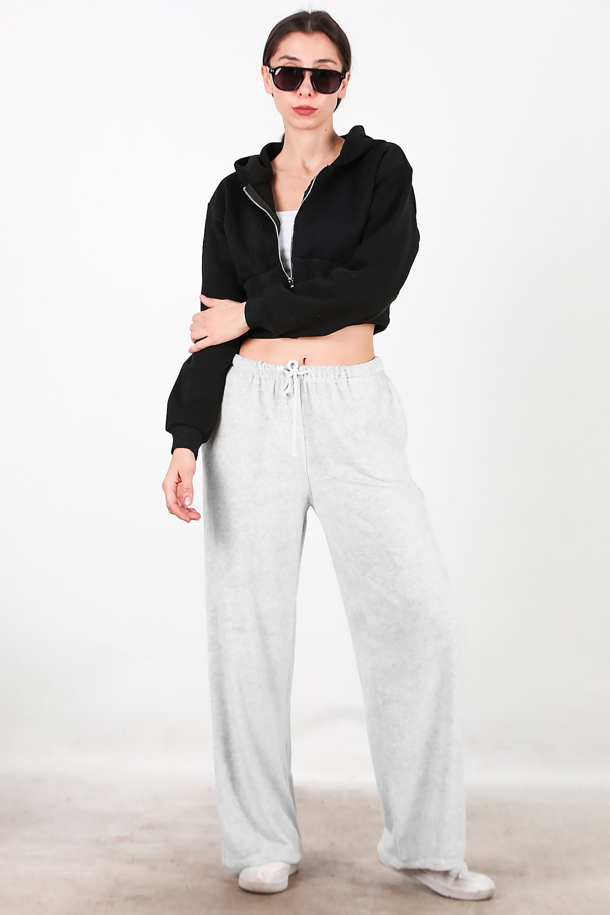 Kadın Cepli Bol Paça Havlu Pantolon Gri