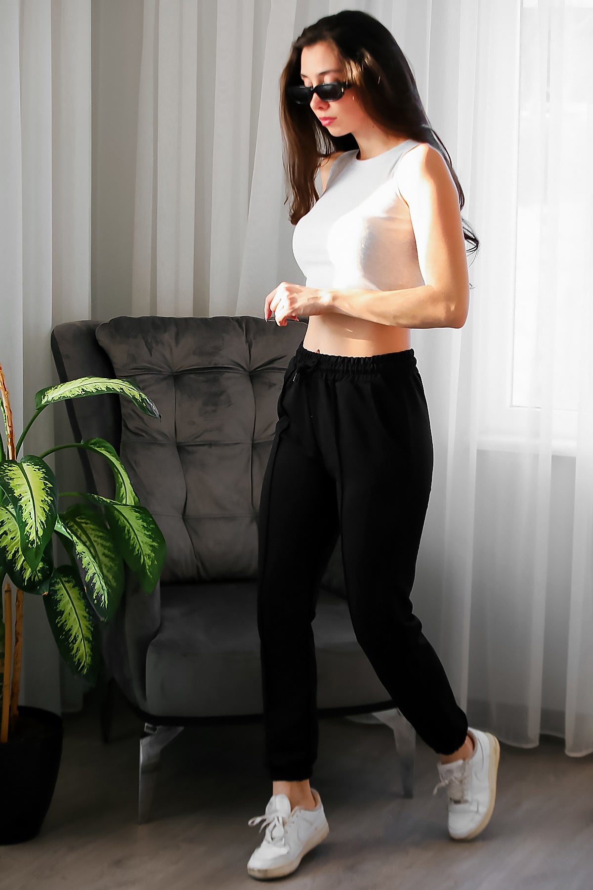 Kadın İki İplik Çimalı Paça Lastikli Eşofman Siyah