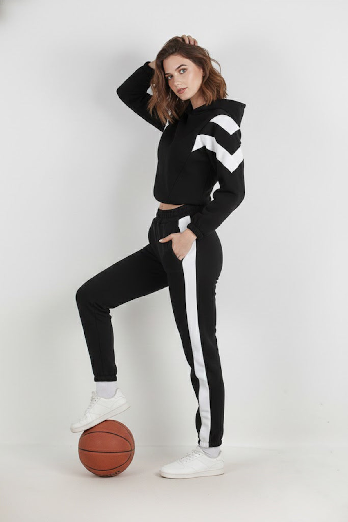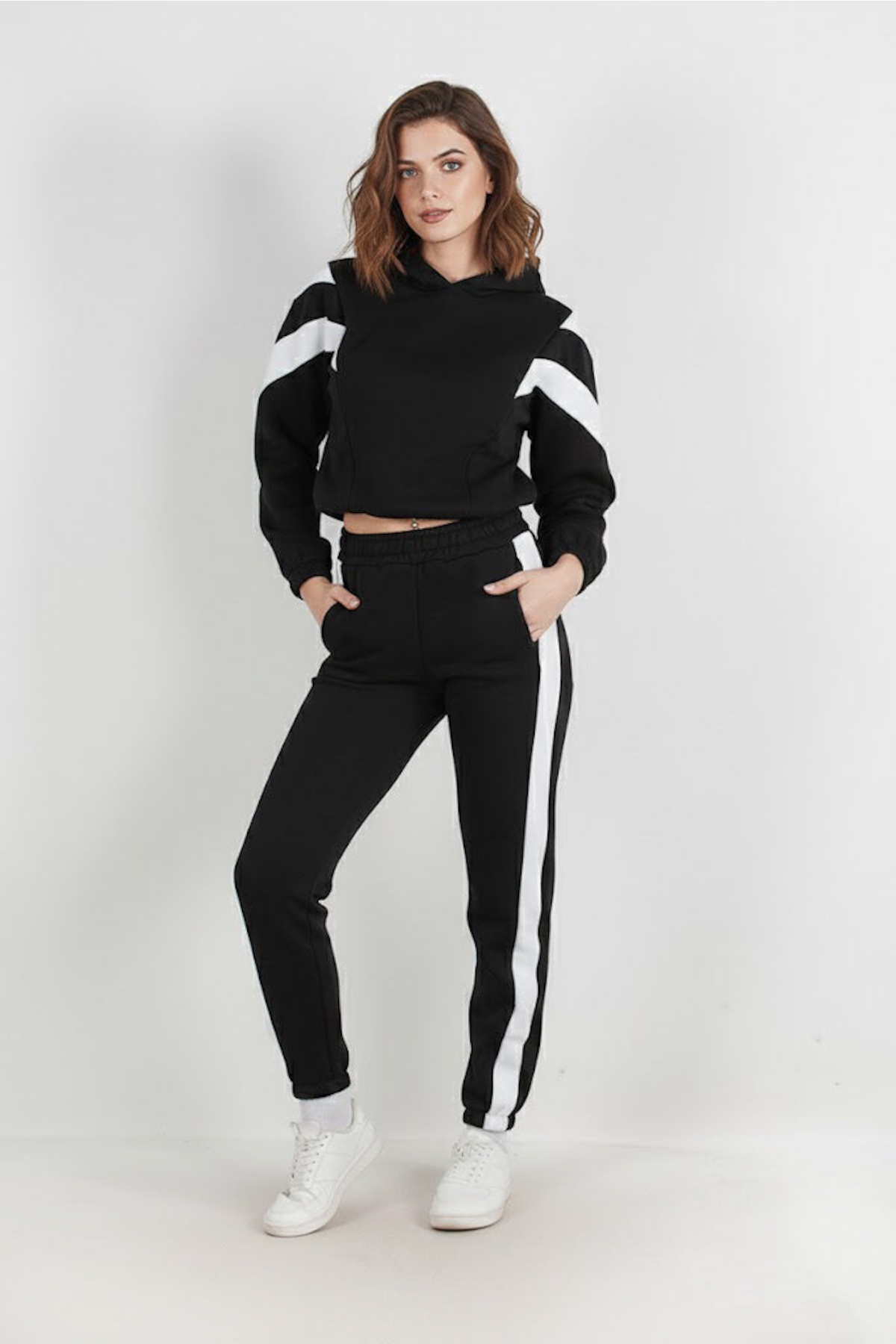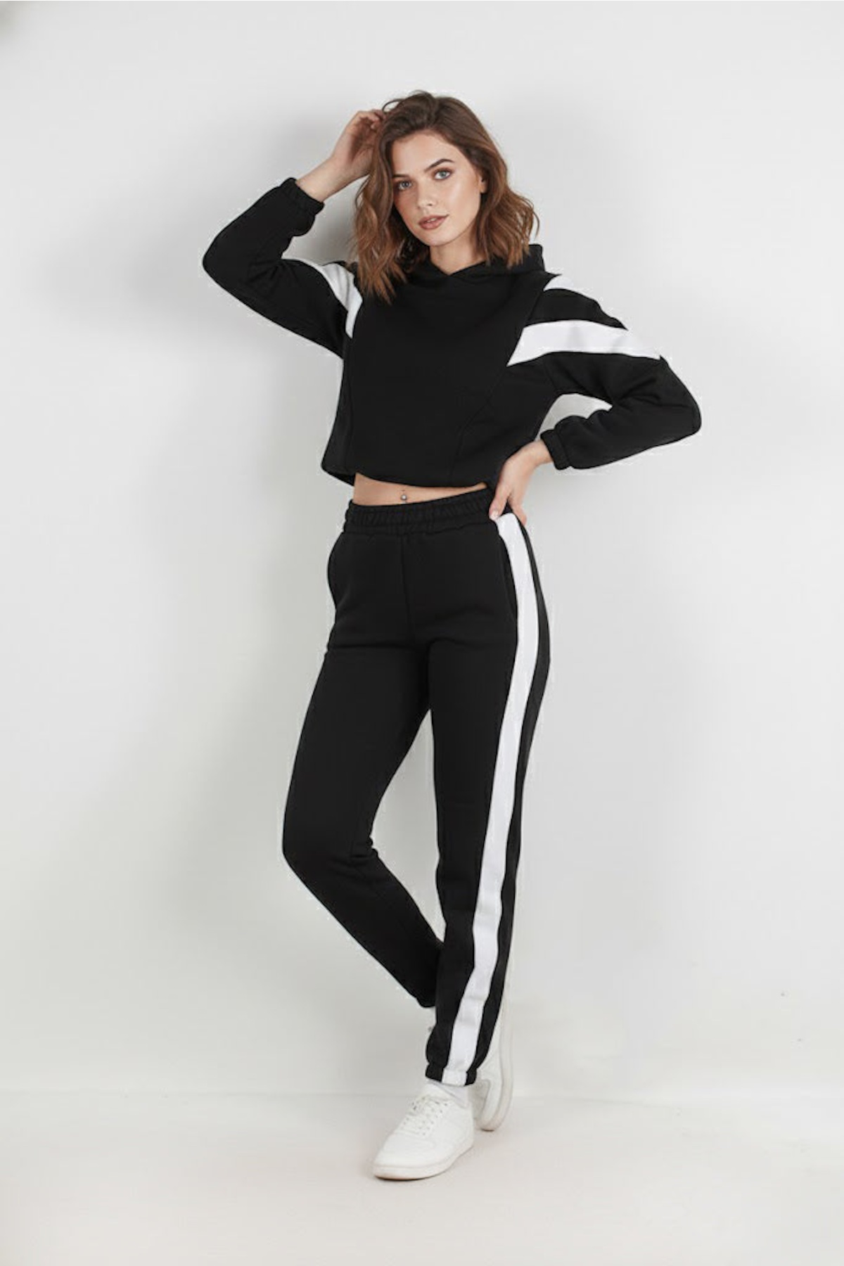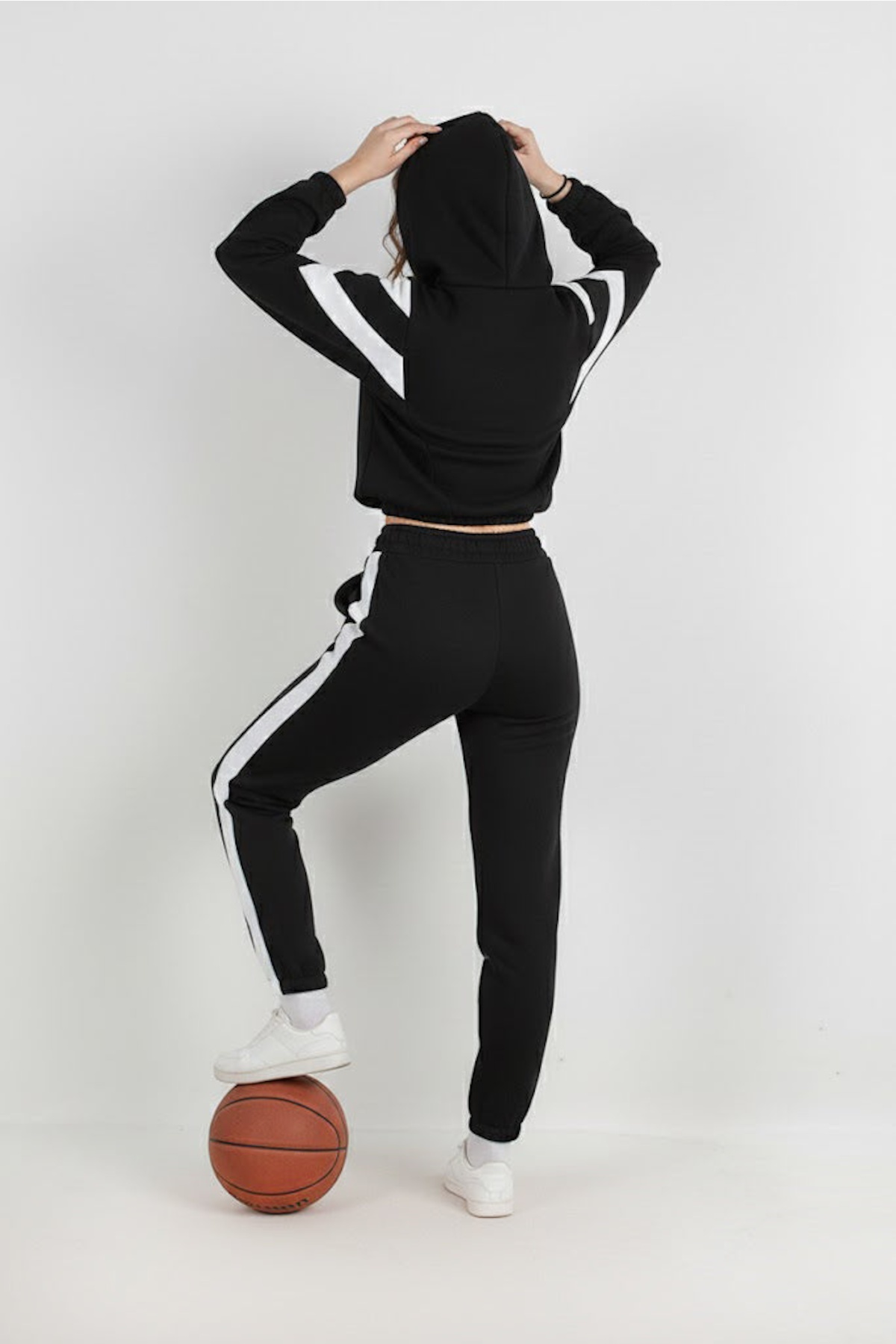 Kadın Şeritli Kapşonlu Eşofman Takımı Siyah