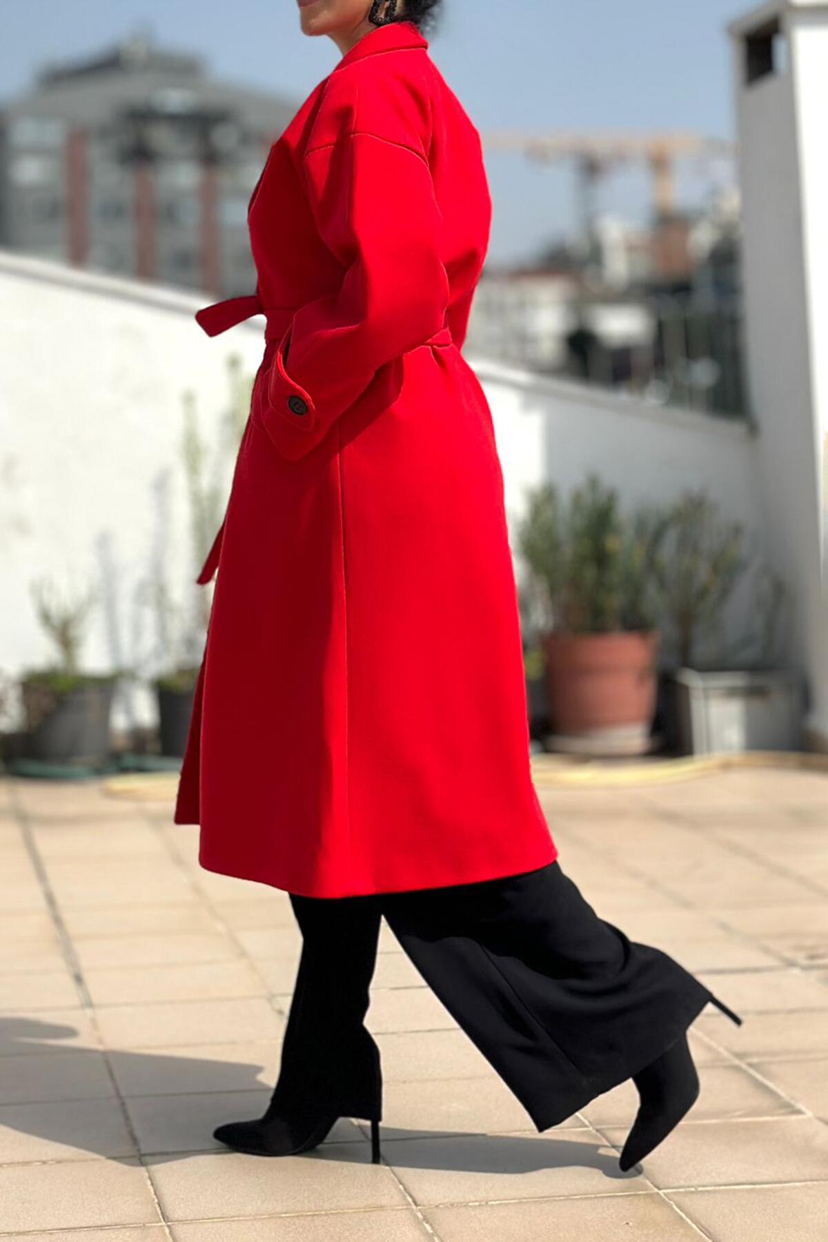 Kadın Bel Kuşaklı Düğmeli Kaban Kırmızı