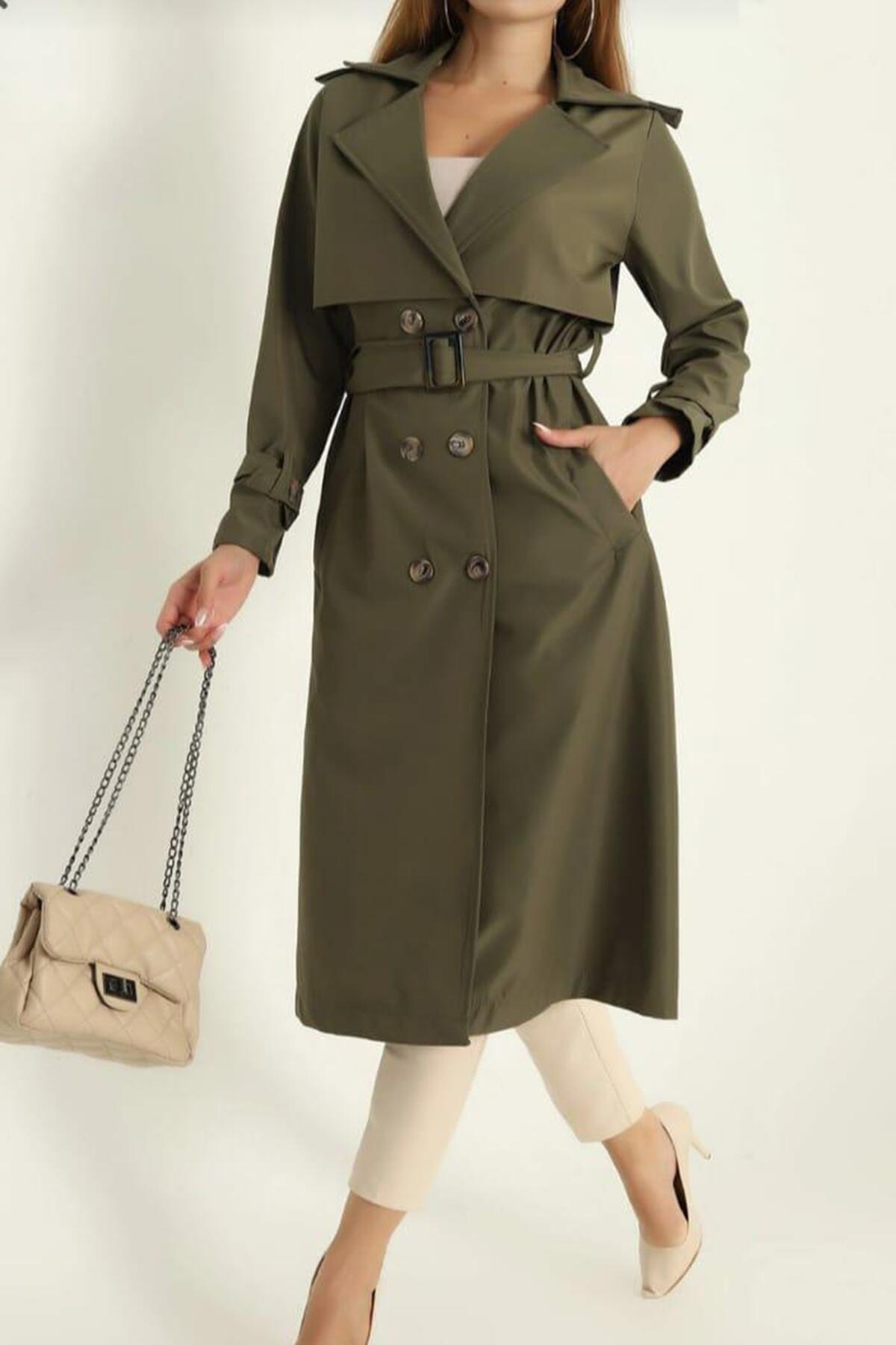 Kadın Bel Kuşaklı Düğmeli Trençkot Haki Haki