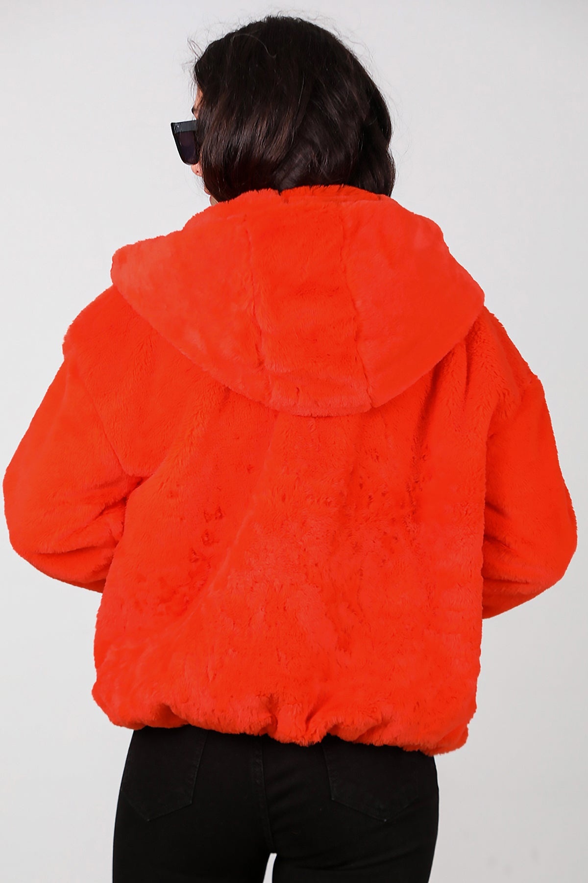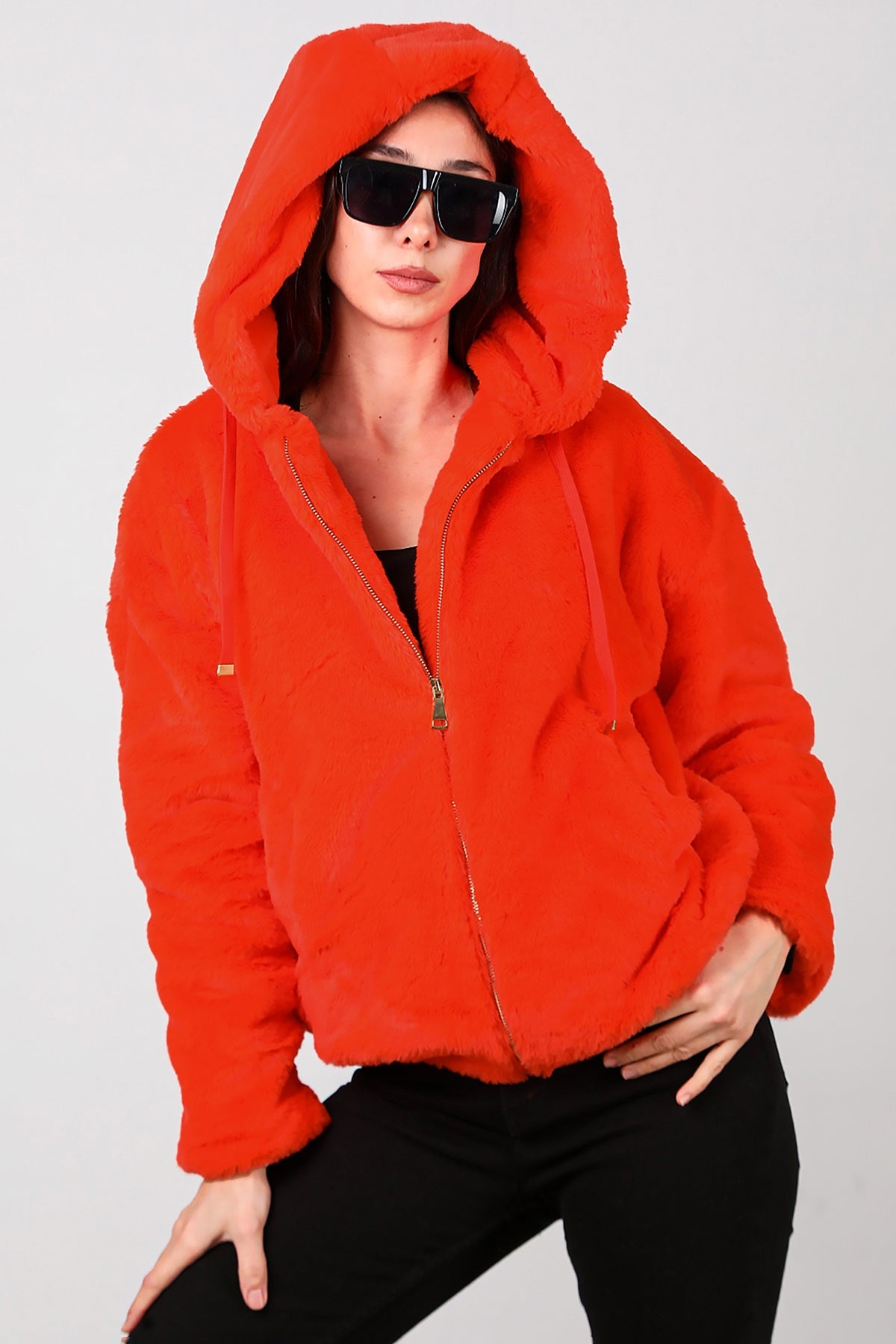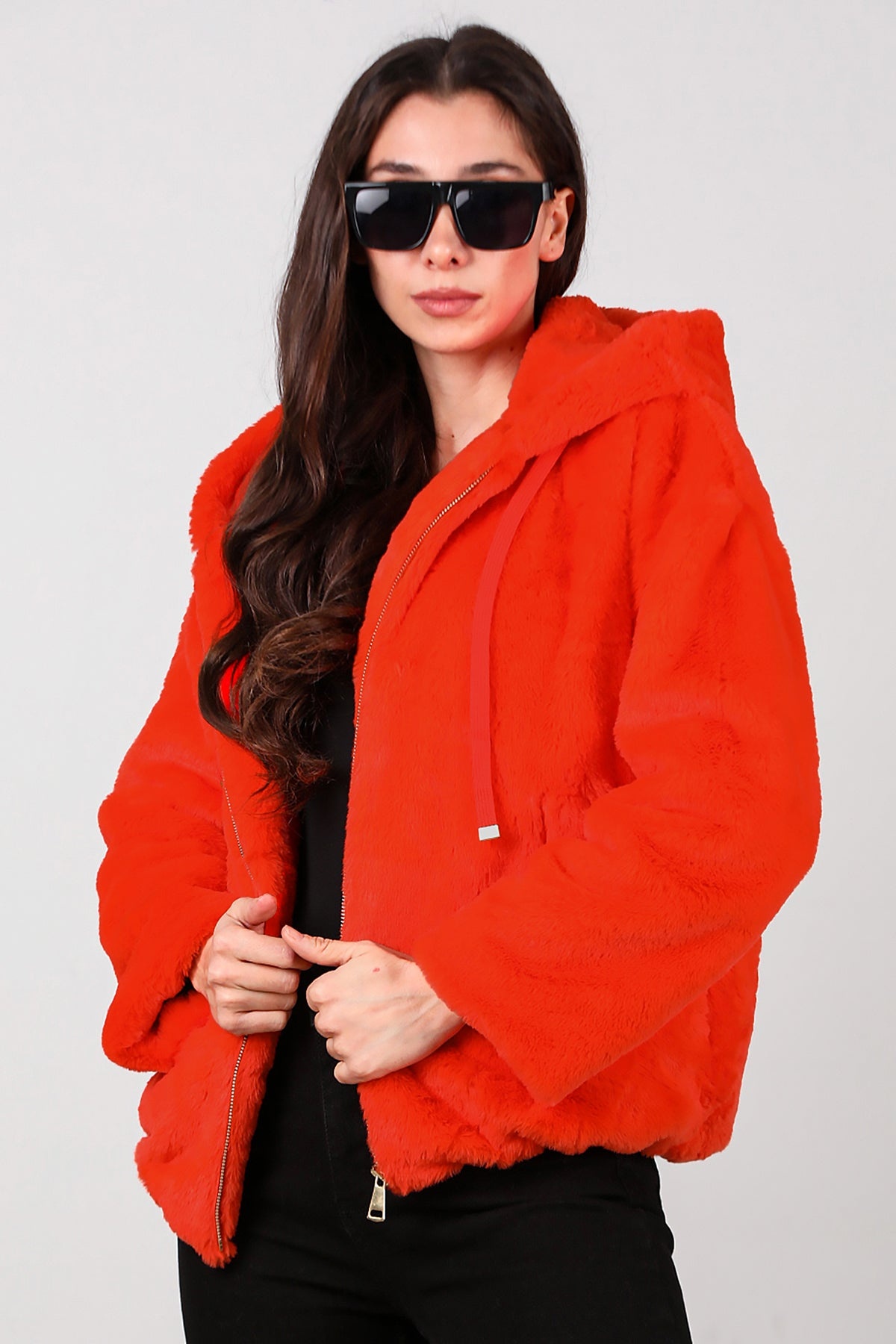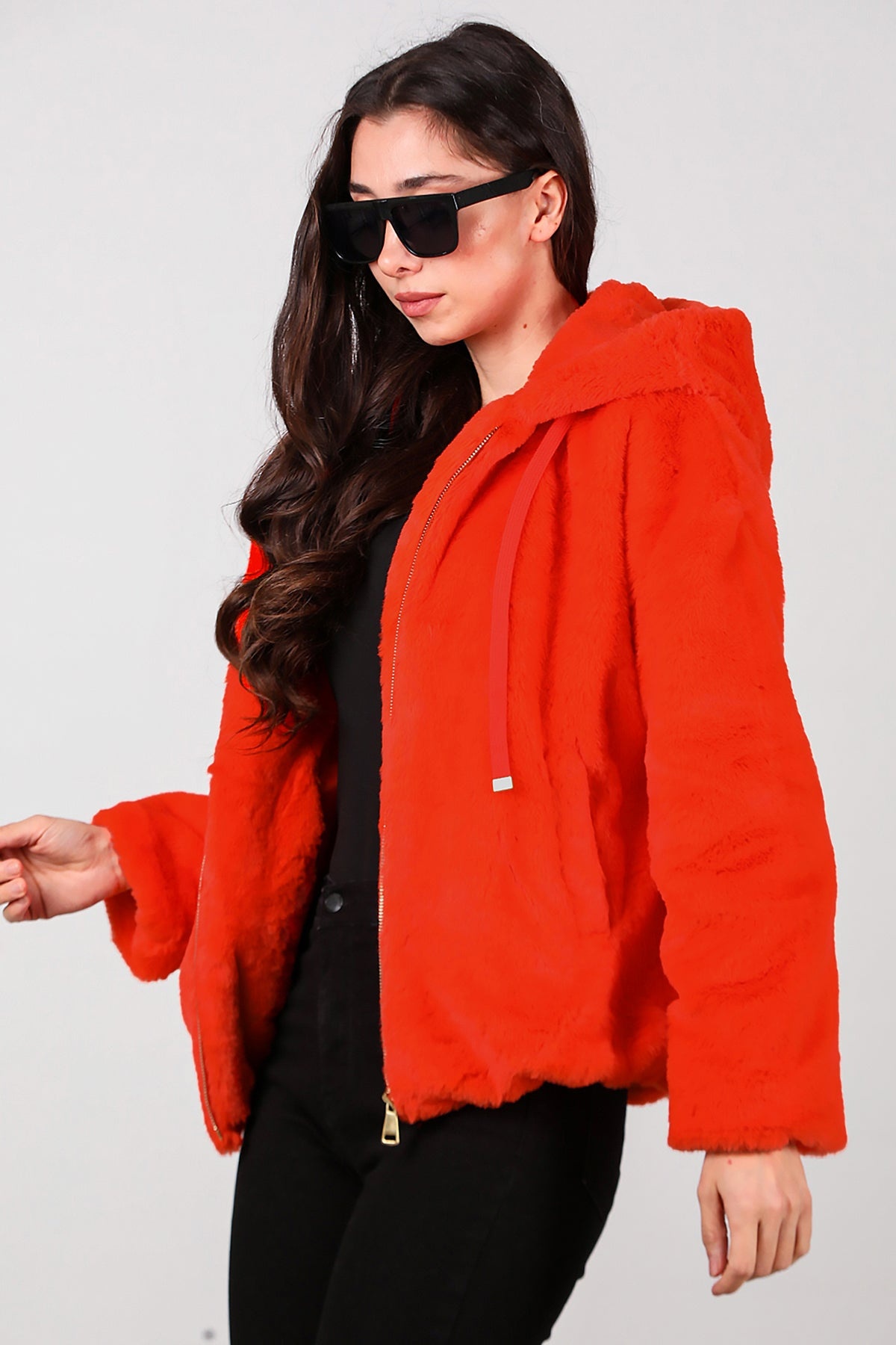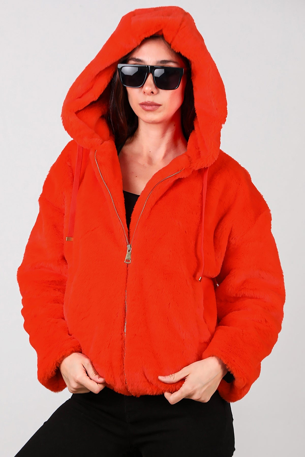Kadın Etek Ucu Lastikli Kapşonlu Peluş Mont Turuncu