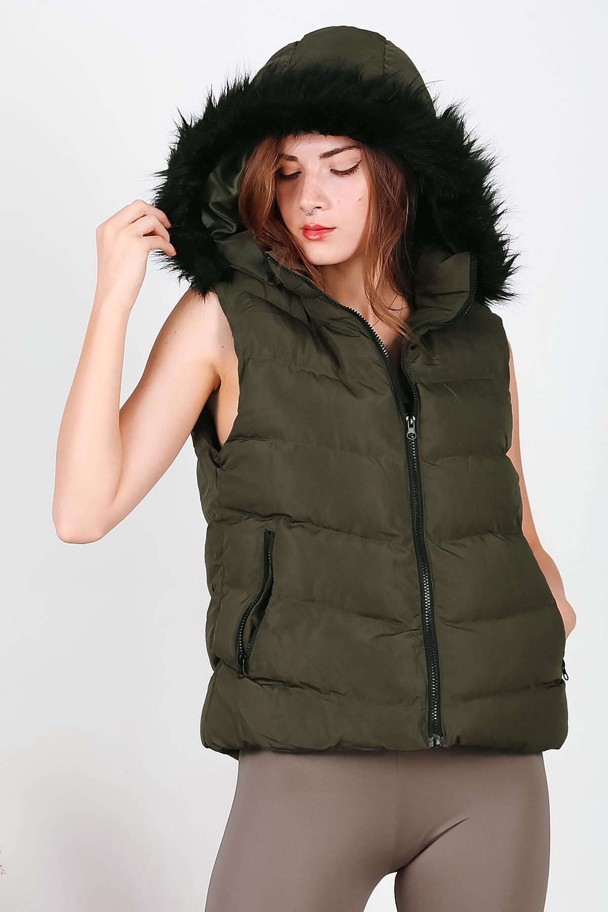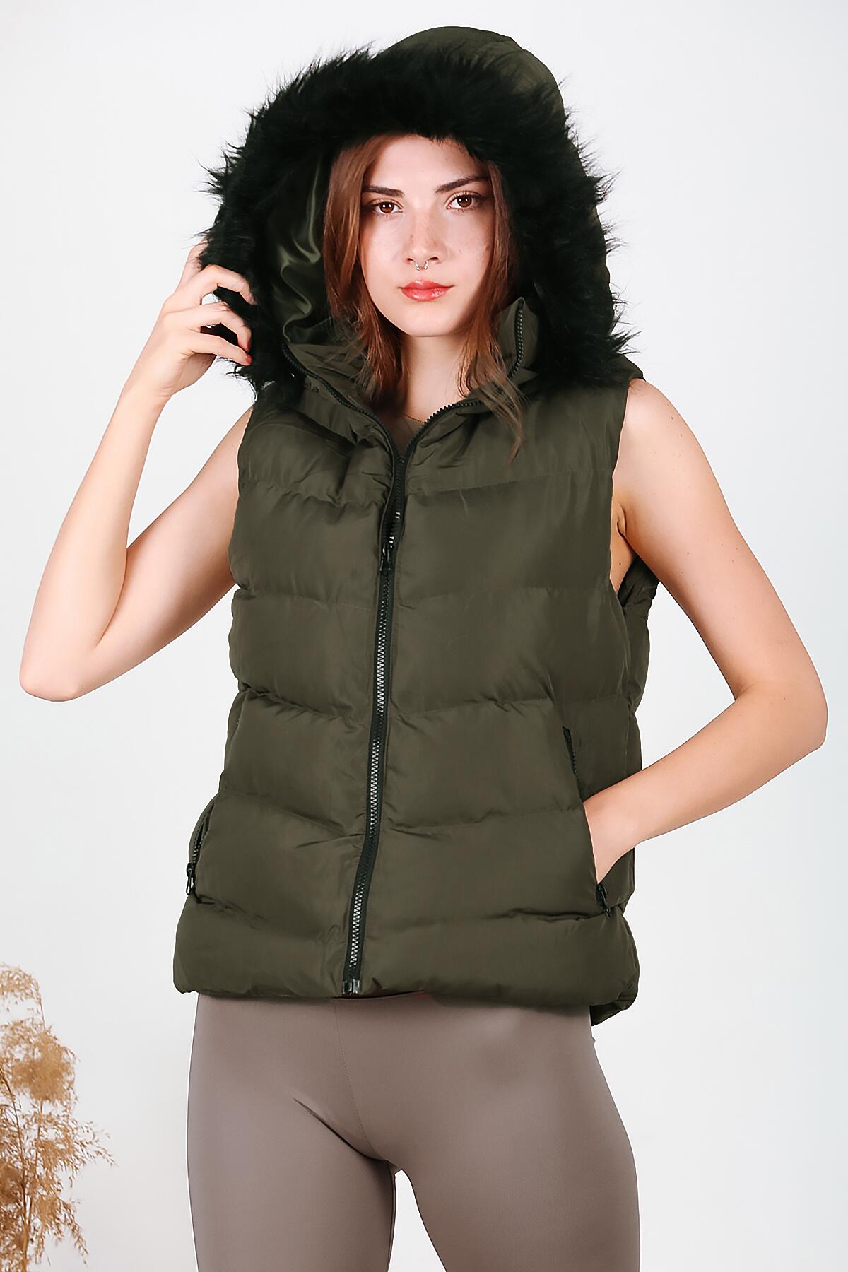 Kadın Kapşonlu Kısa Şişme Yelek Haki