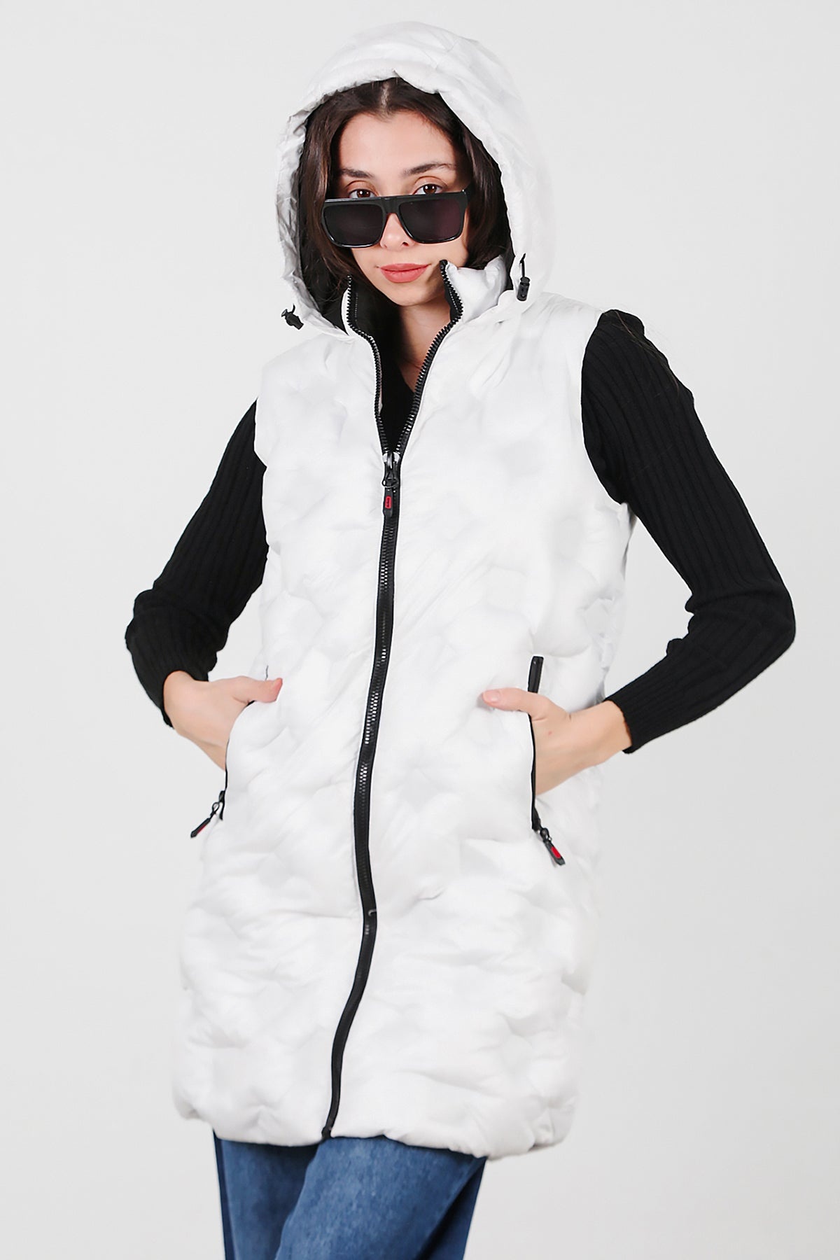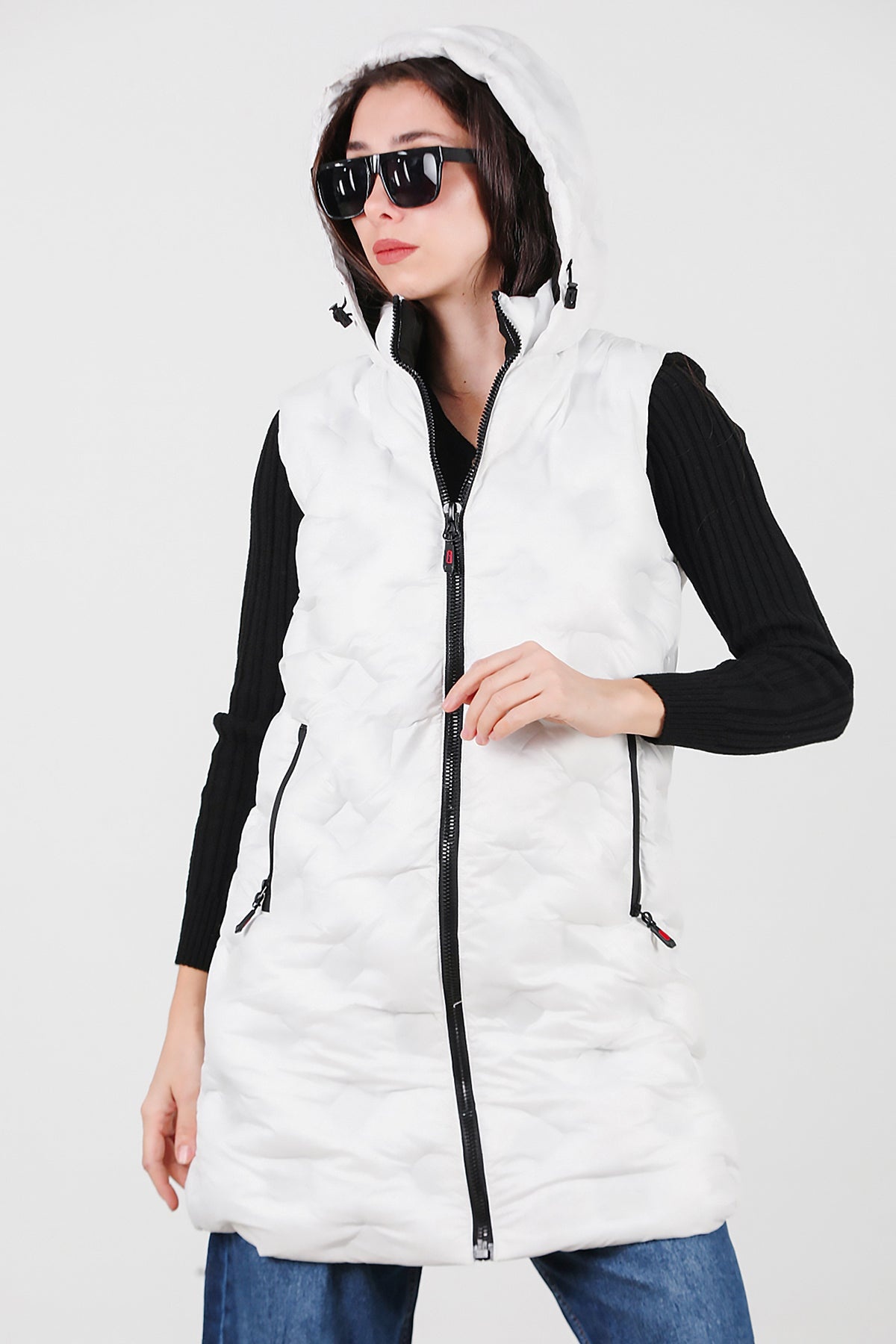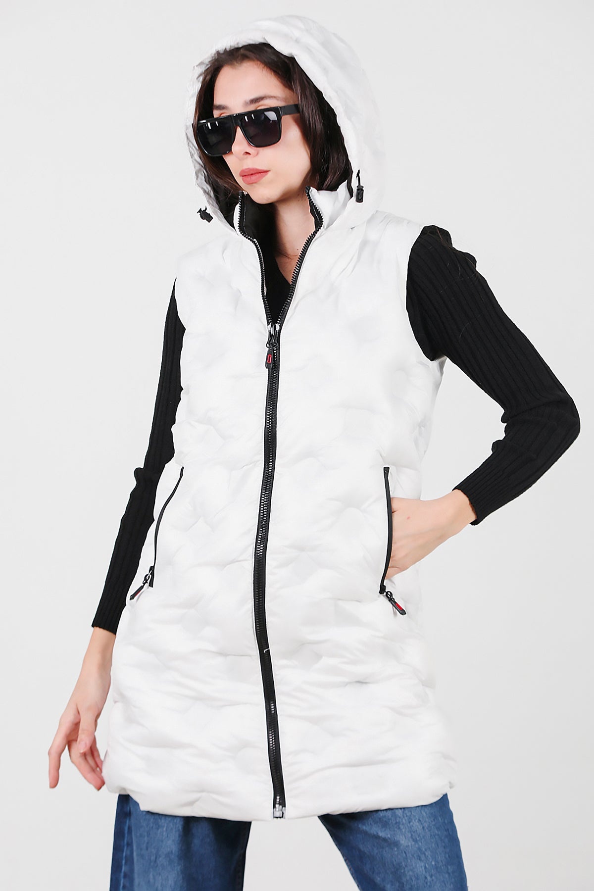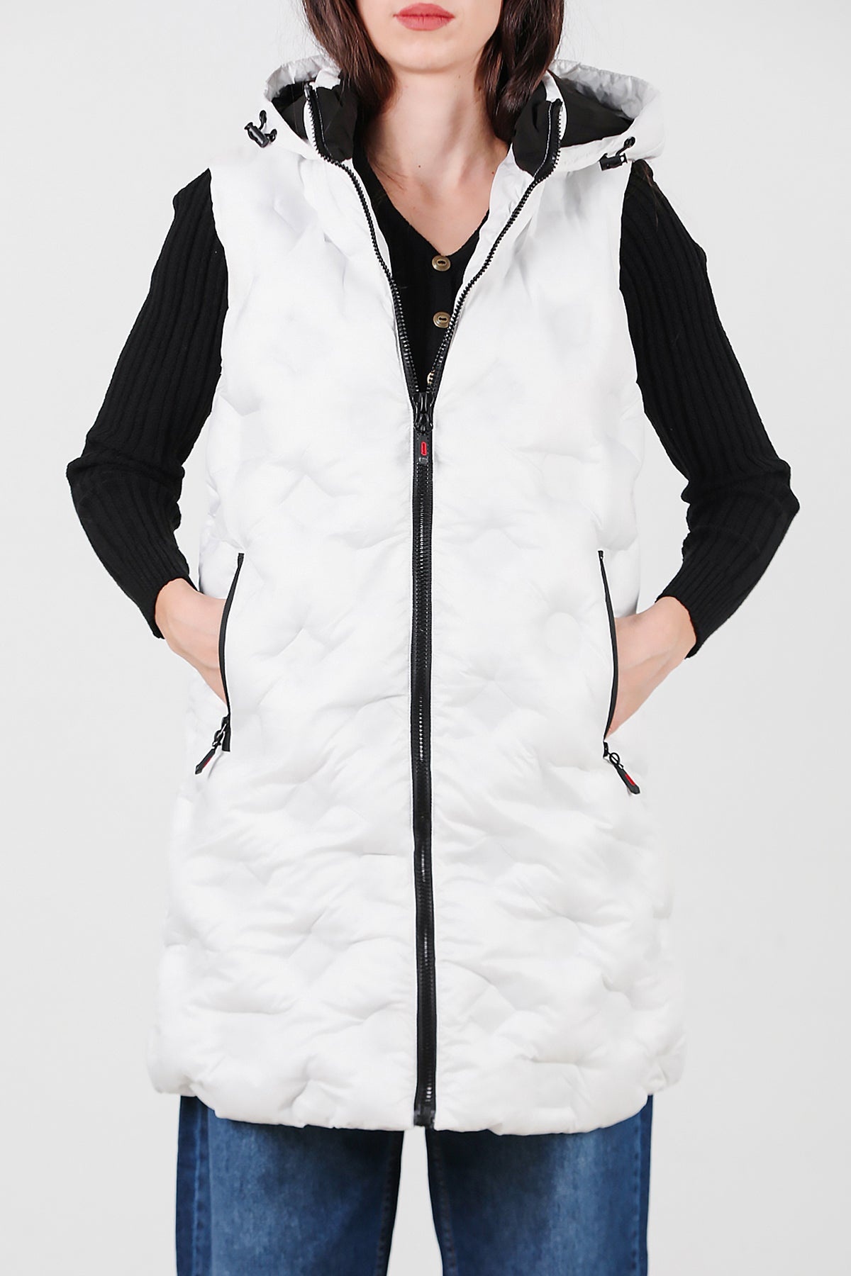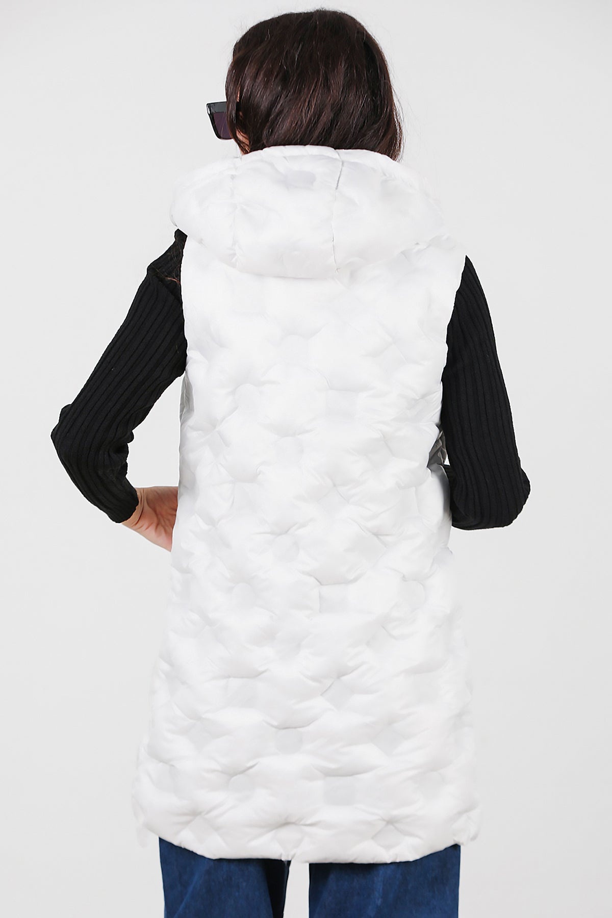 Kadın Kapşonlu Uzun Şişme Yelek Beyaz