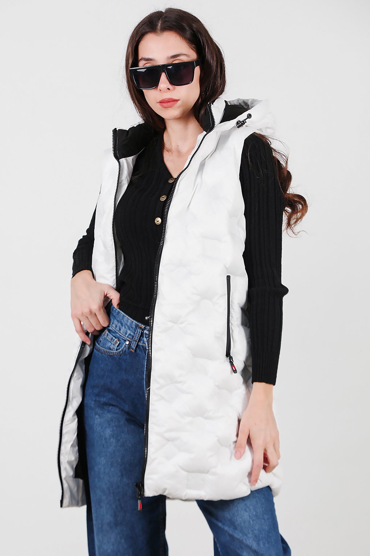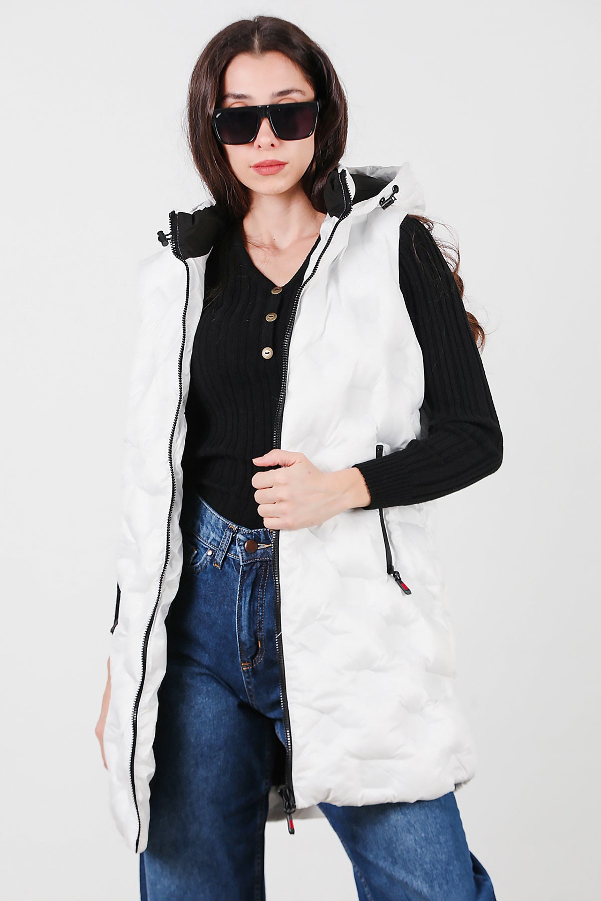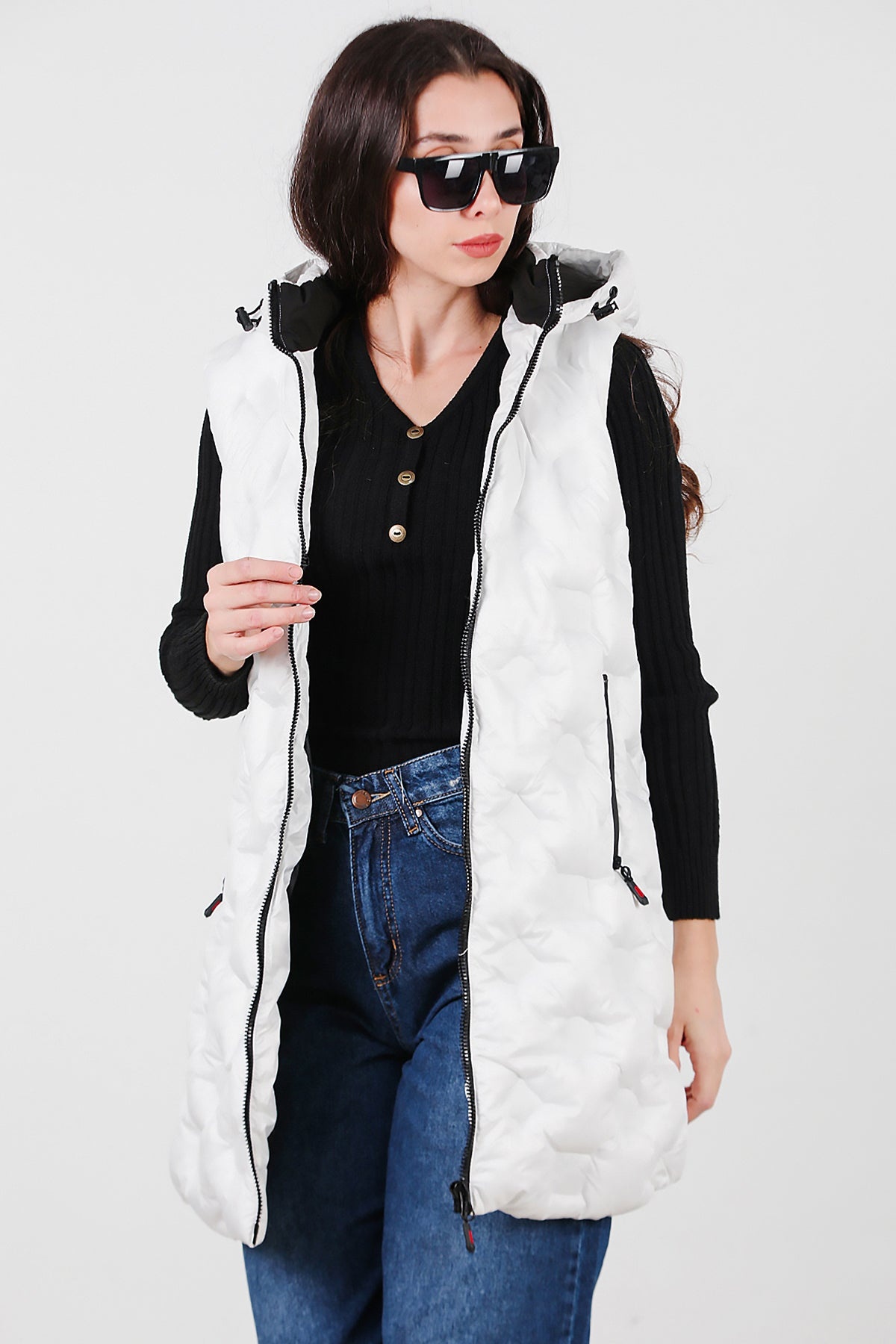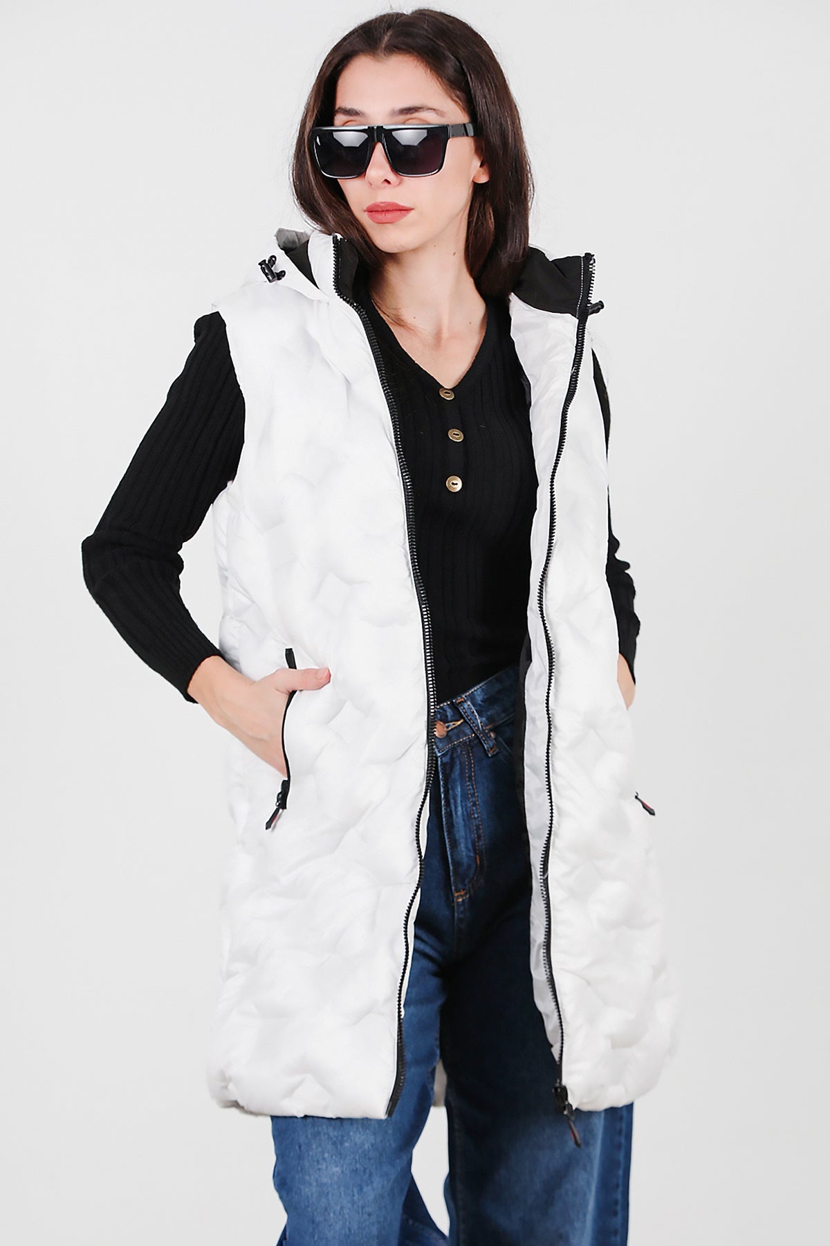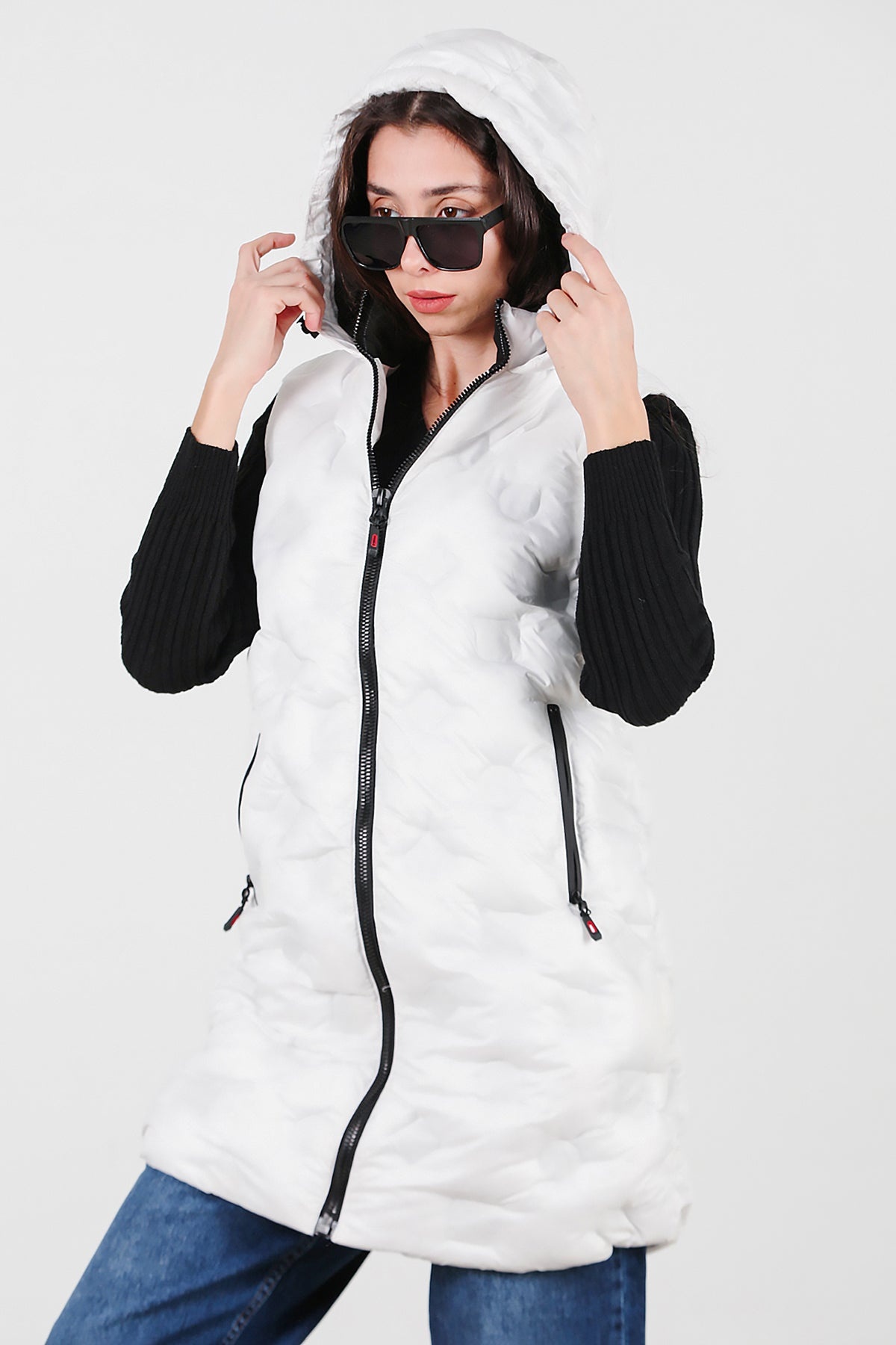 Kadın Kapşonlu Uzun Şişme Yelek Beyaz