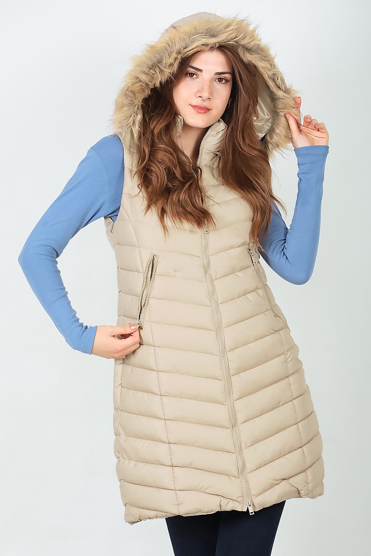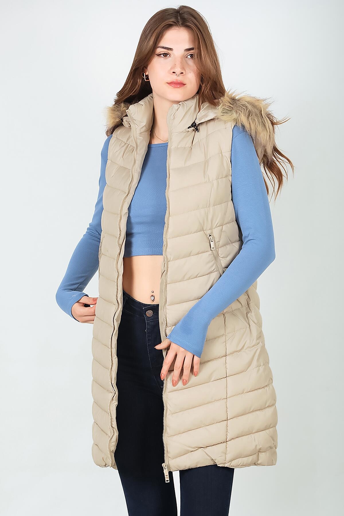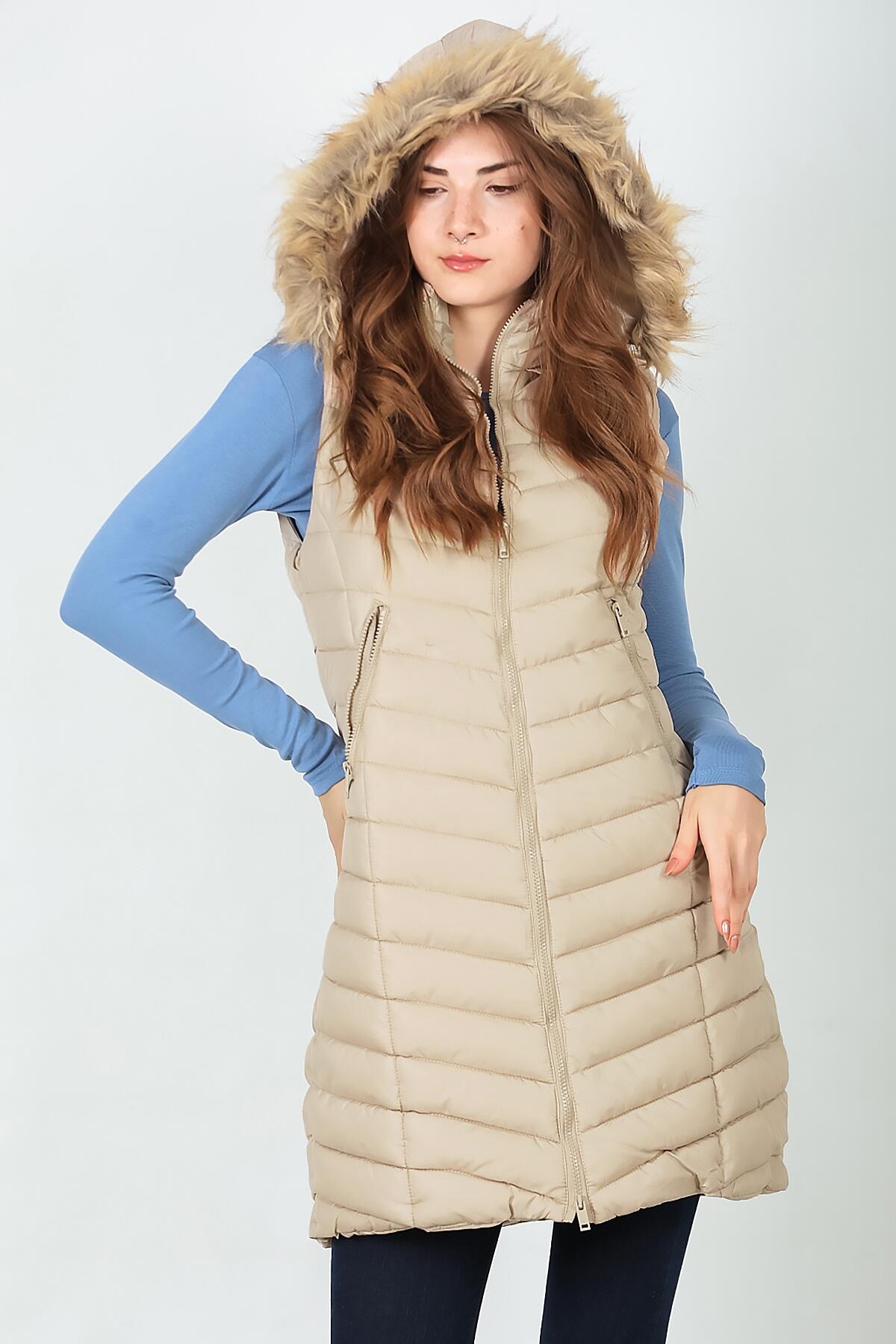 Kadın Kürklü Kapşonlu Şişme Yelek Krem