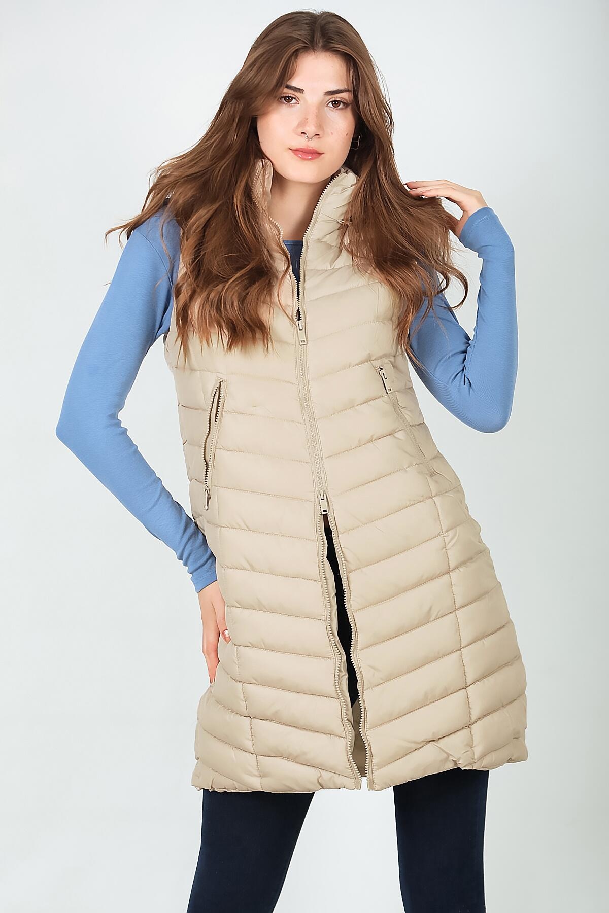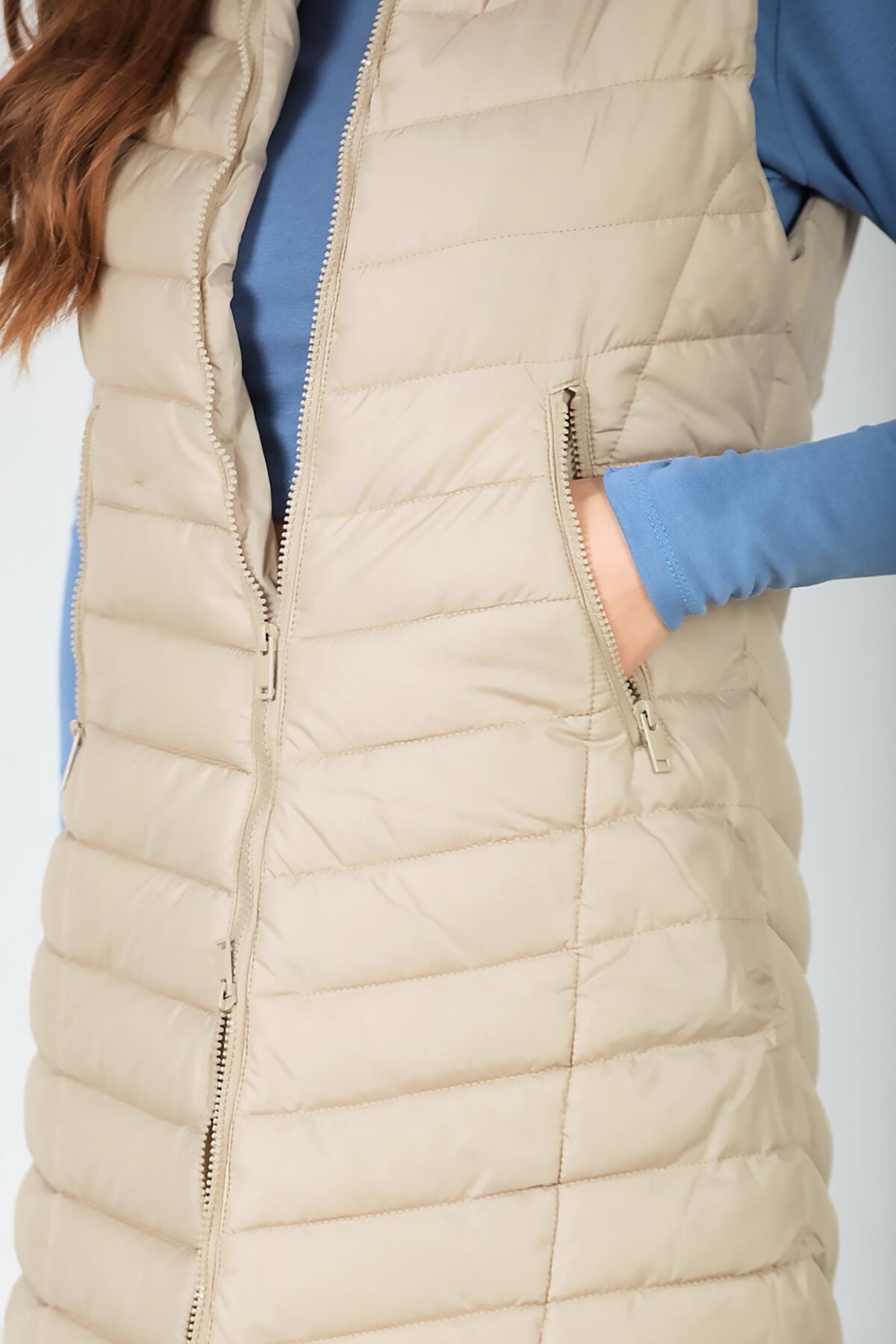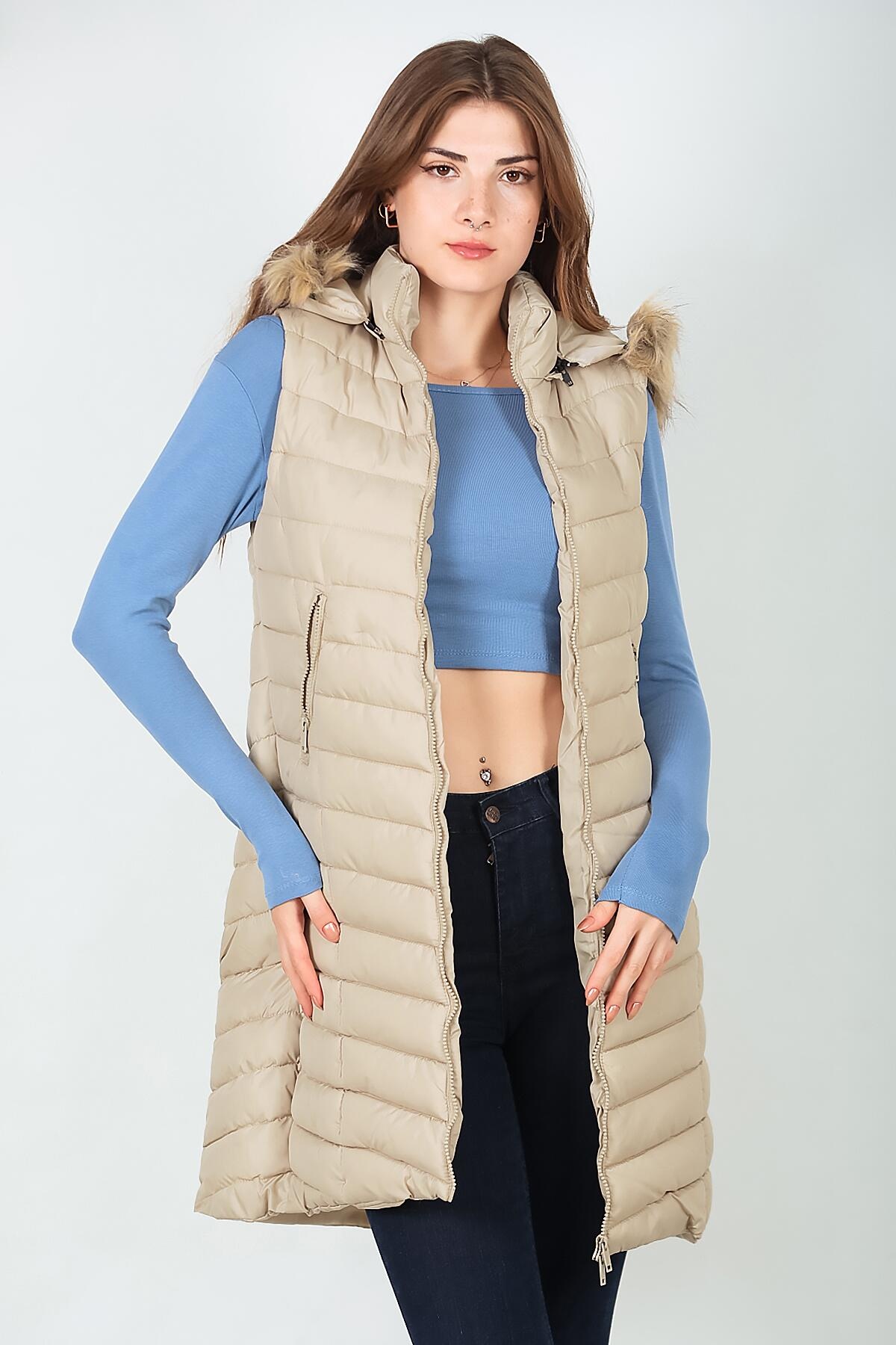 Kadın Kürklü Kapşonlu Şişme Yelek Krem