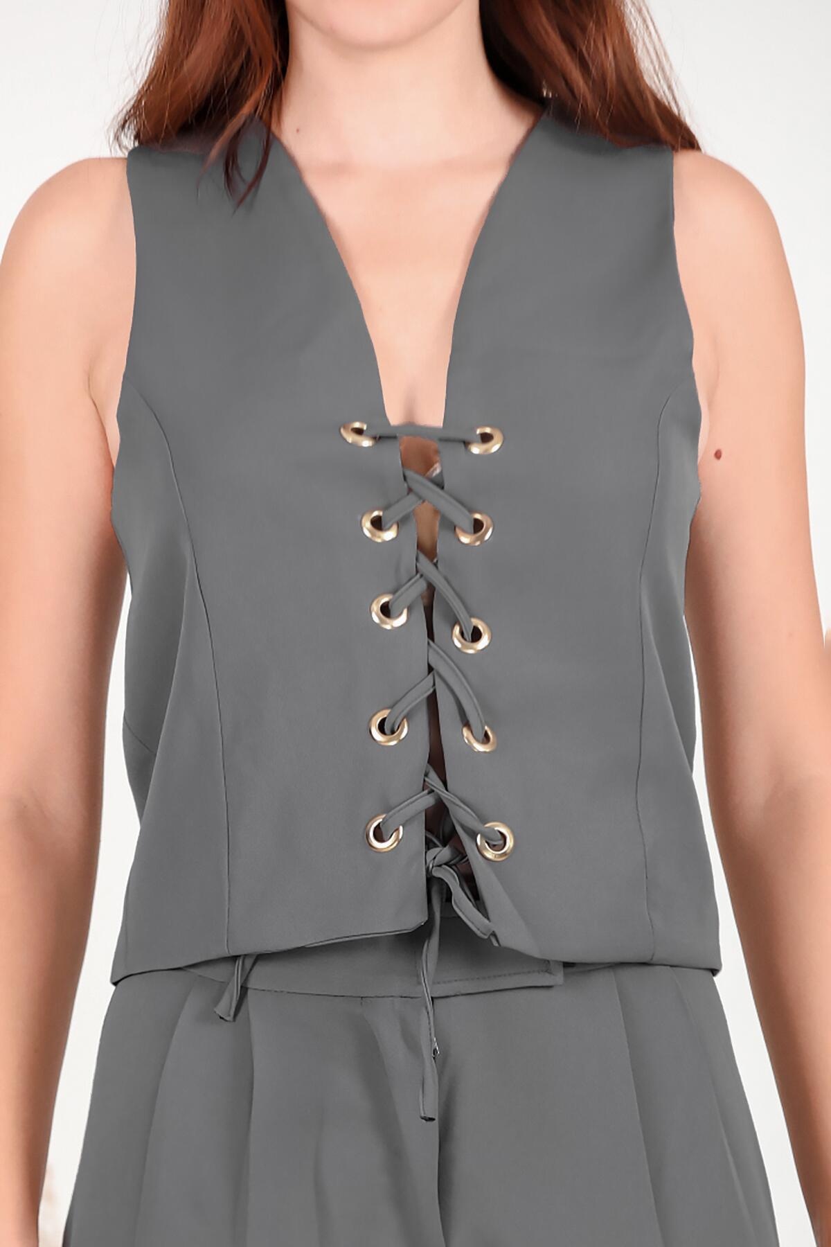 Kadın Kuş Gözlü Bağcıklı Yelek Füme