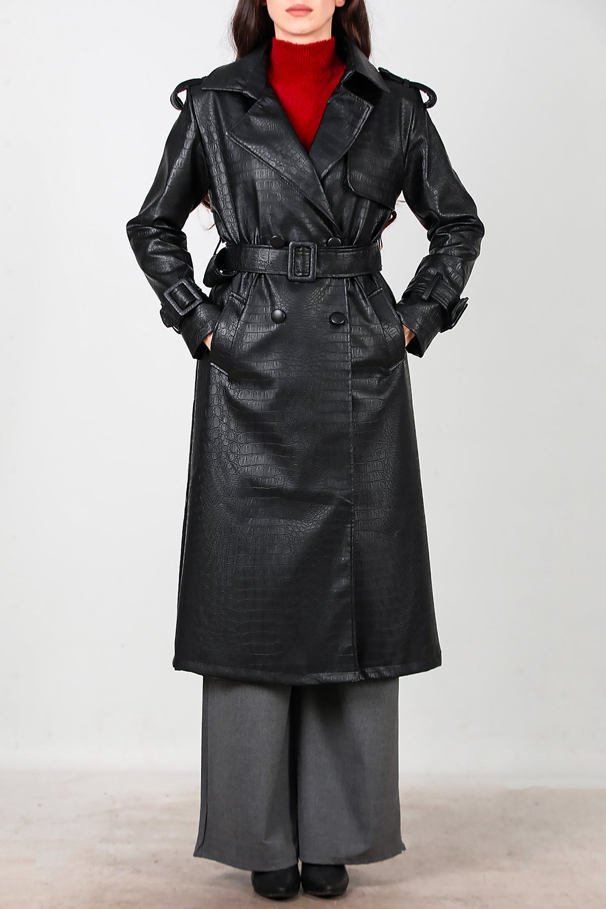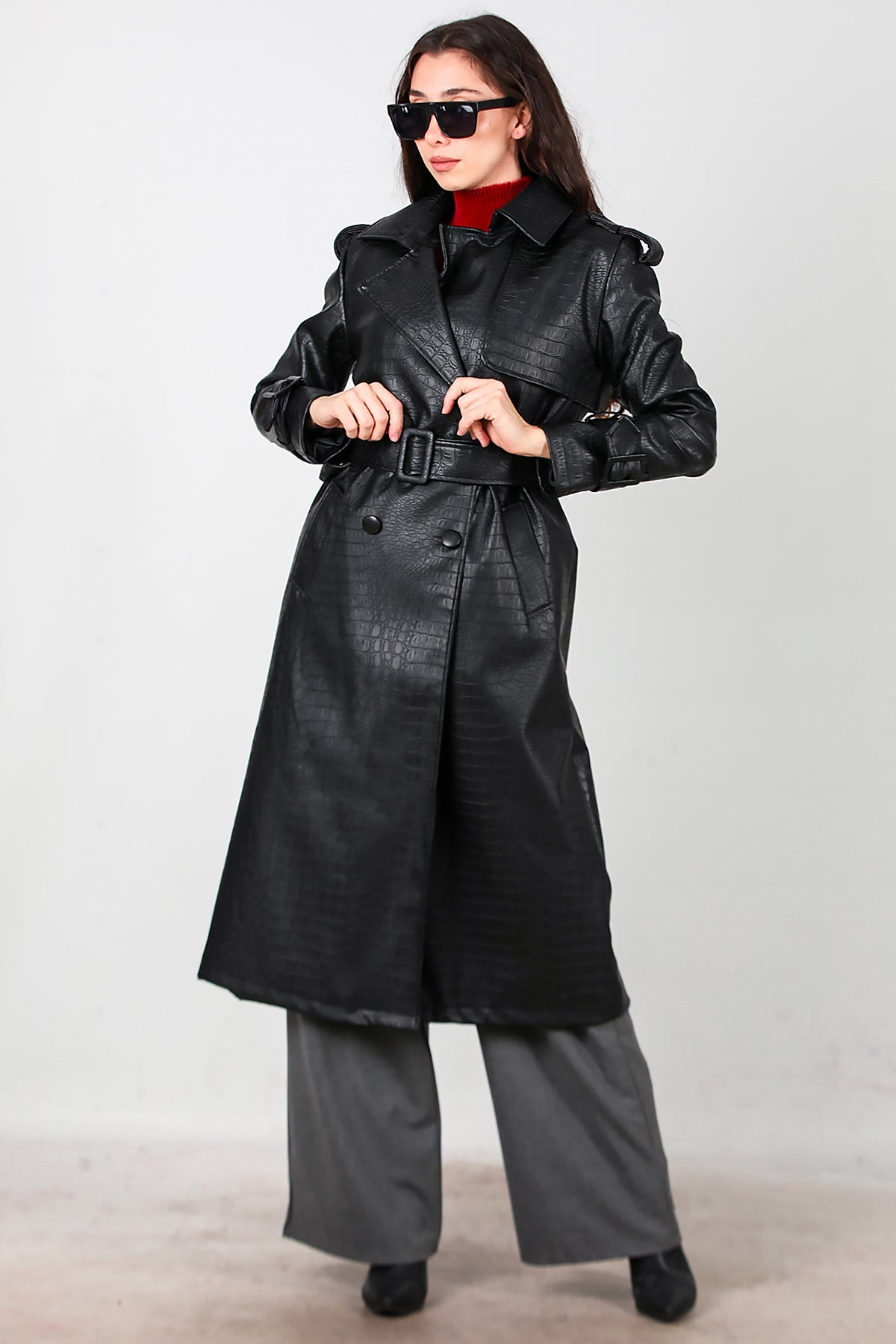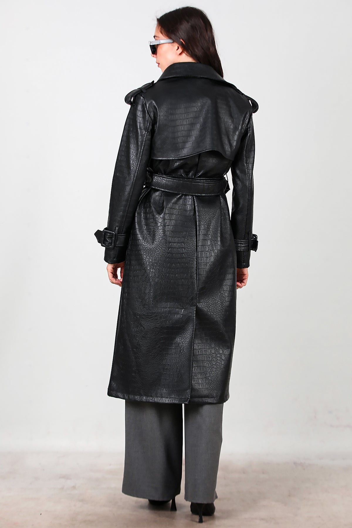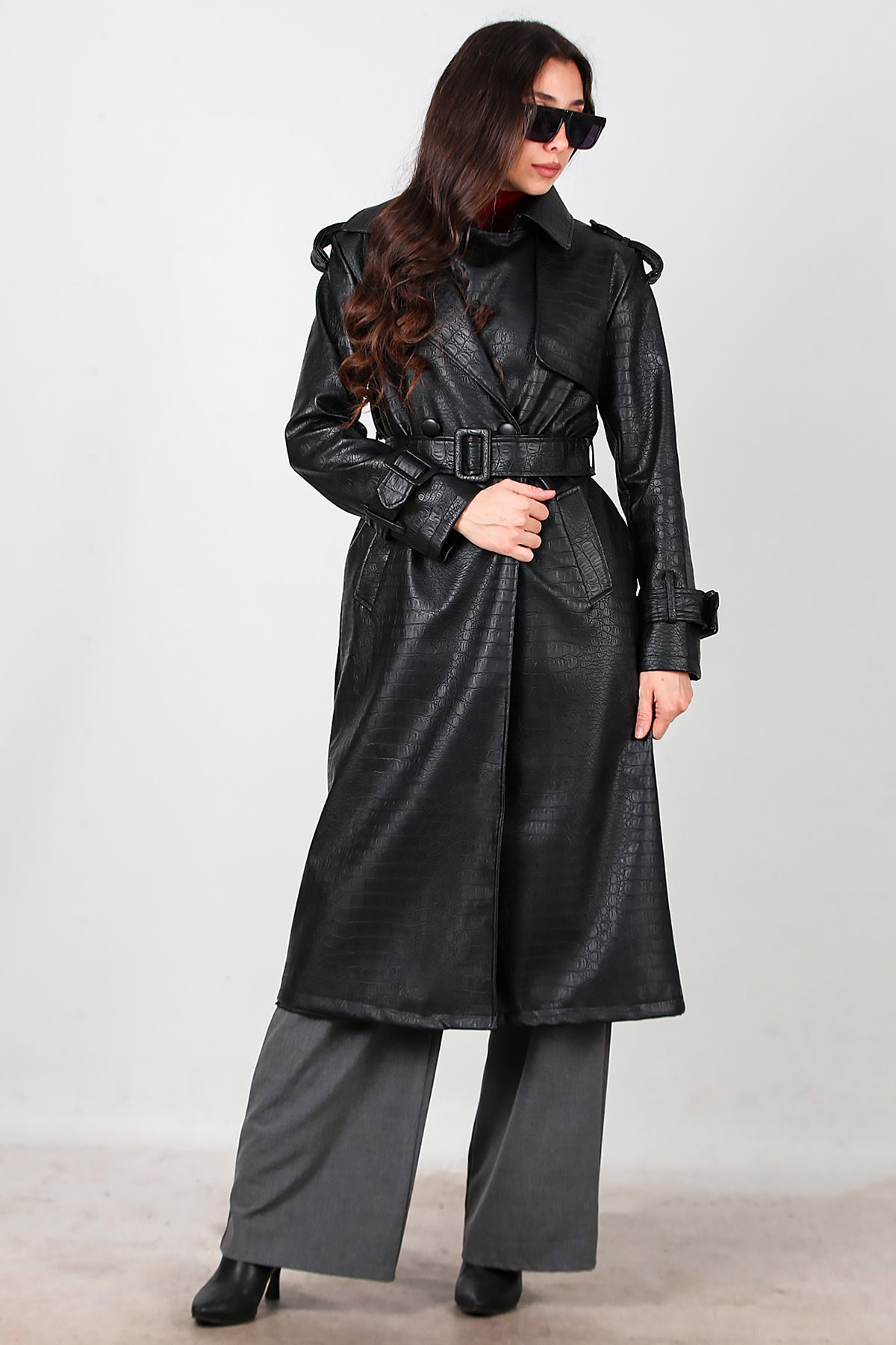 Kadın Kuşaklı Timsah Desen Uzun Deri Kaban Siyah