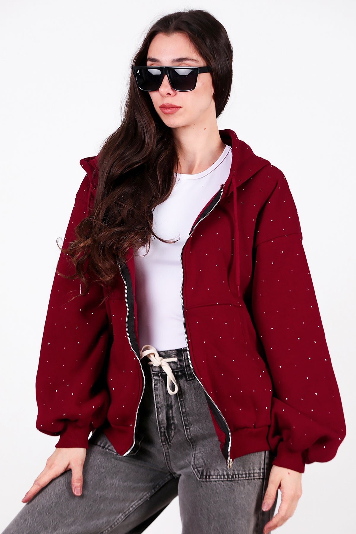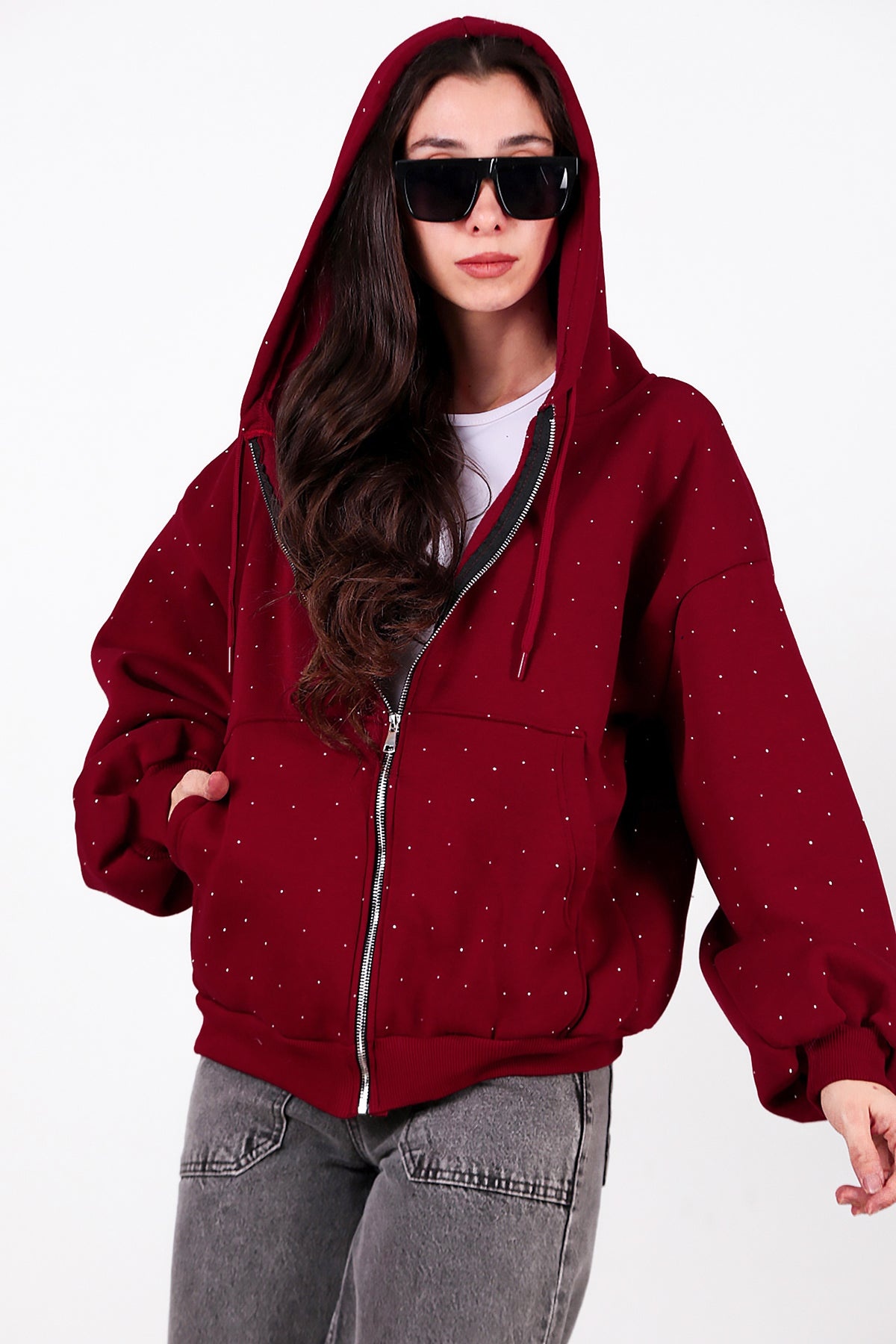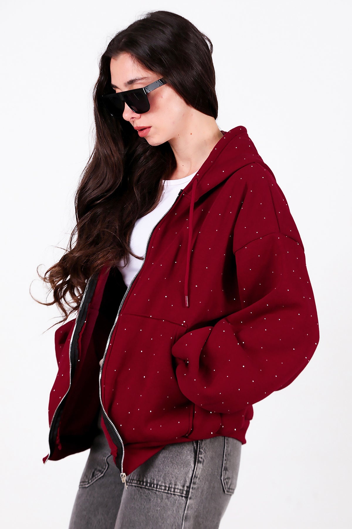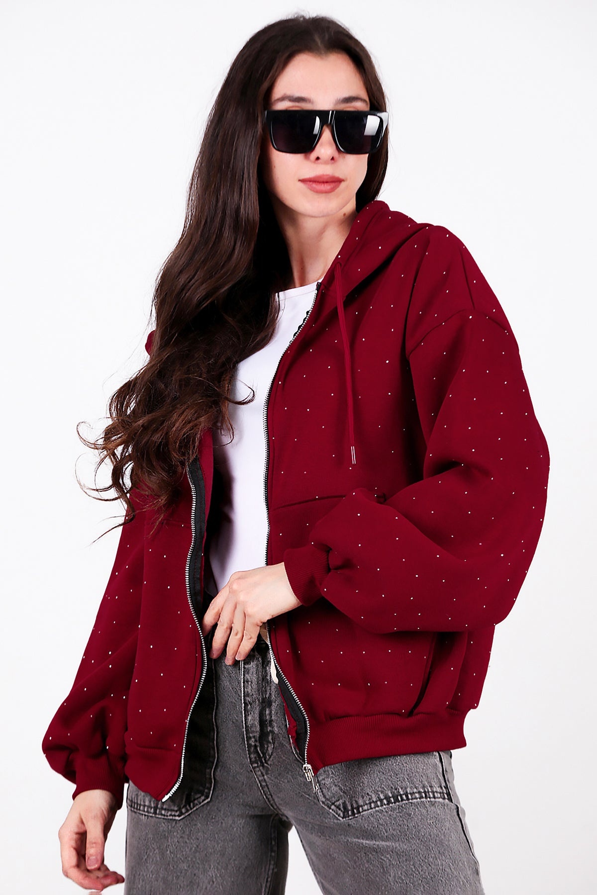 Kadın Taş Detay Kapşonlu Önü Fermuarlı Ceket Bordo