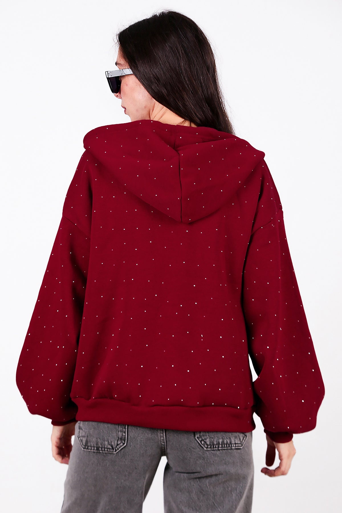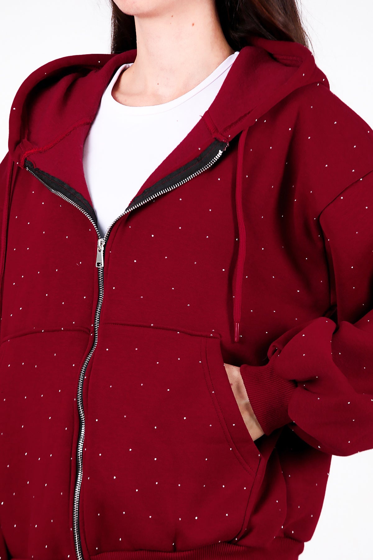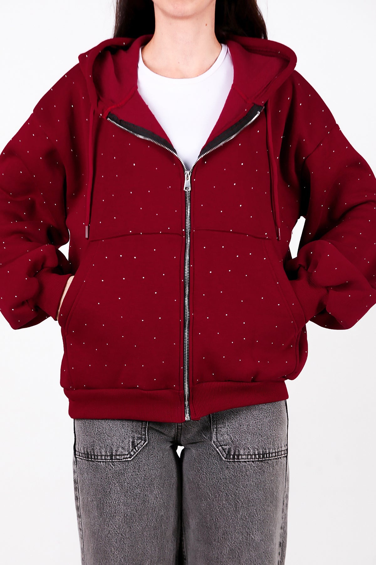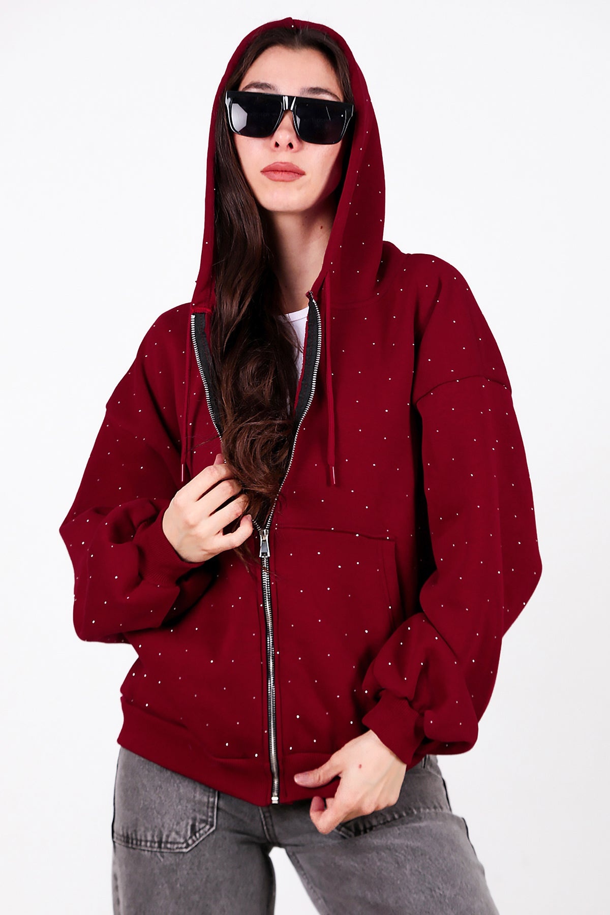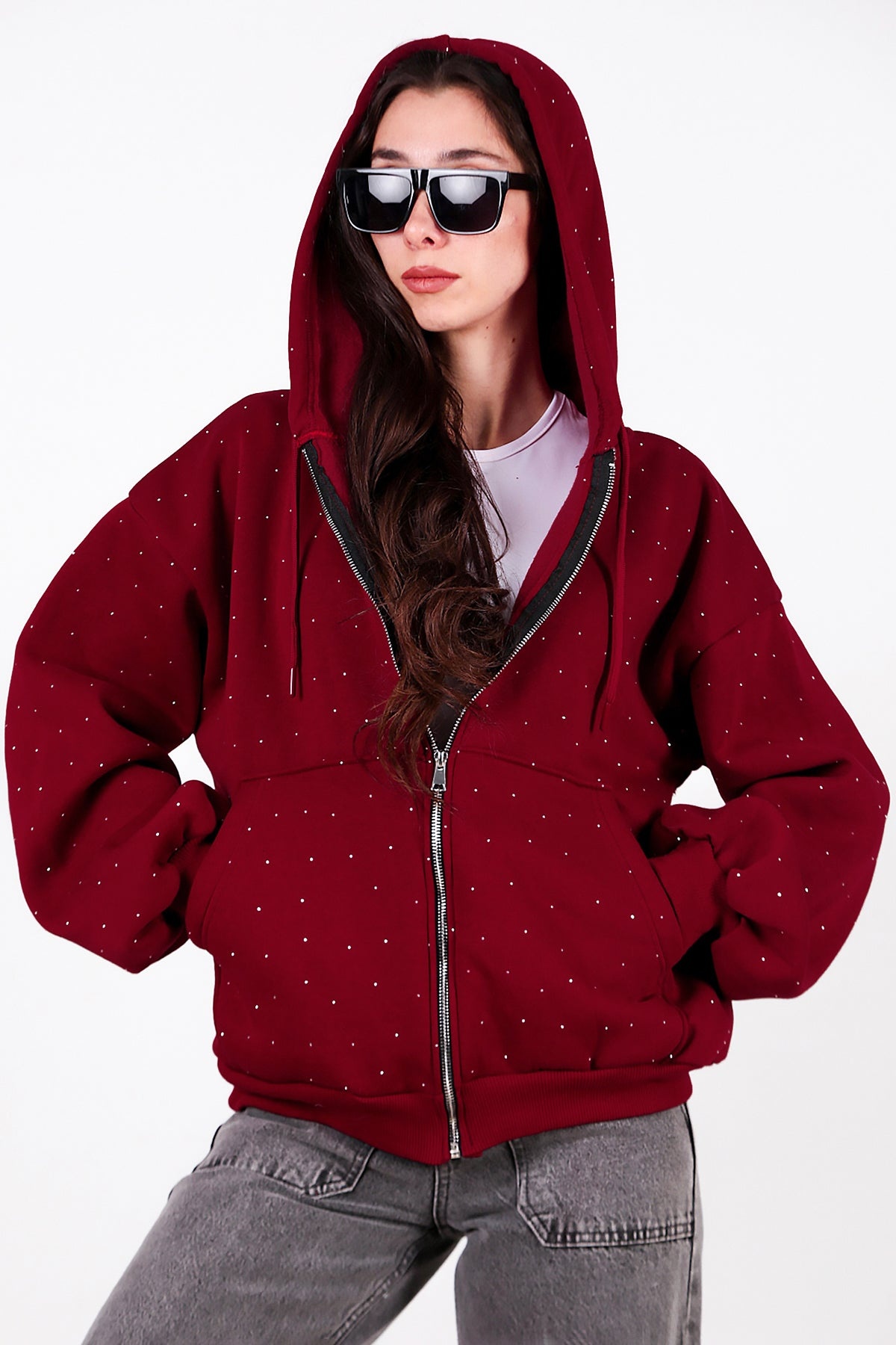 Kadın Taş Detay Kapşonlu Önü Fermuarlı Ceket Bordo