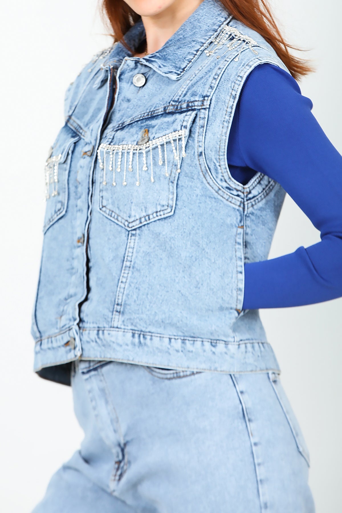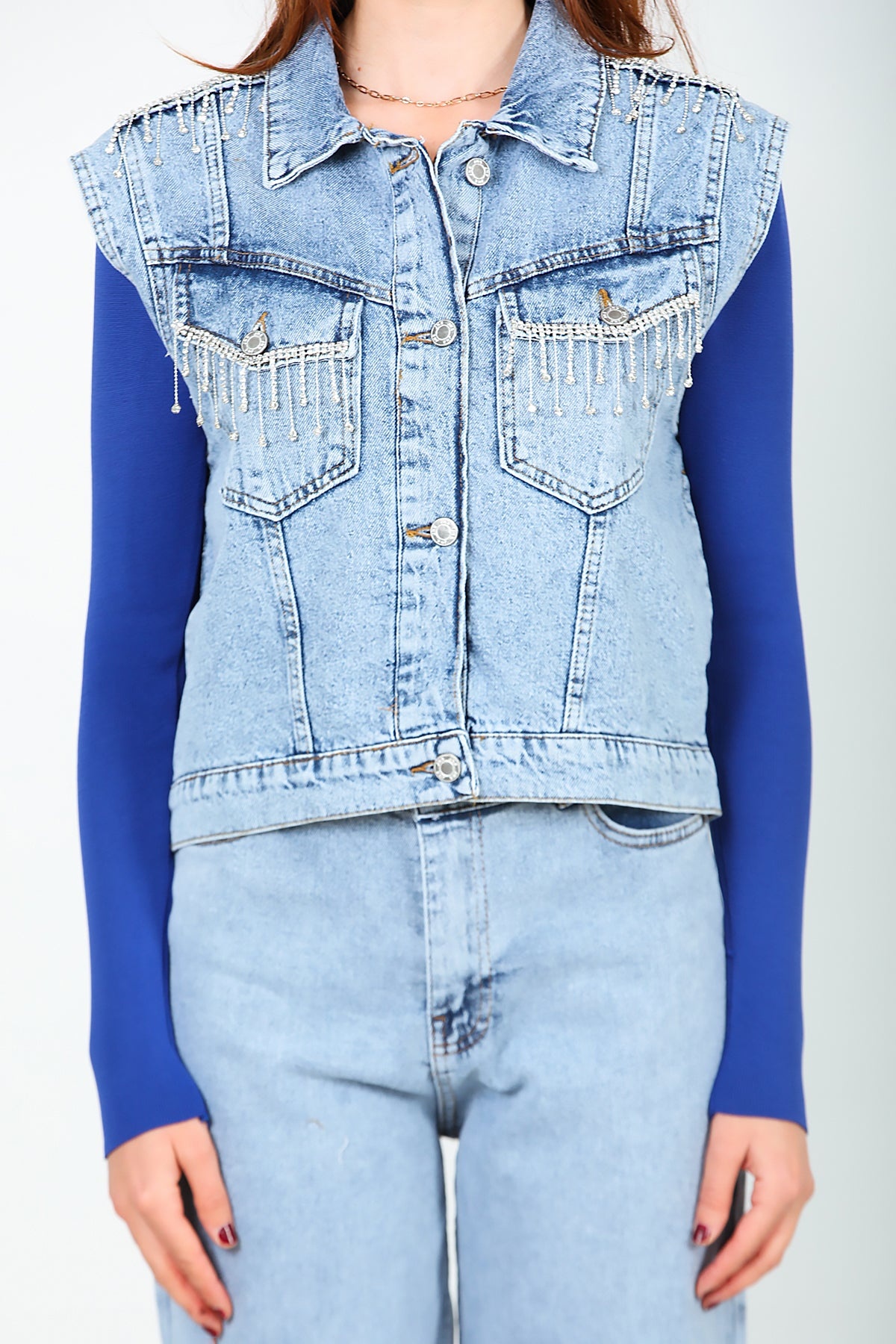 Kadın Taş Detaylı Kot Yelek Mavi Kot