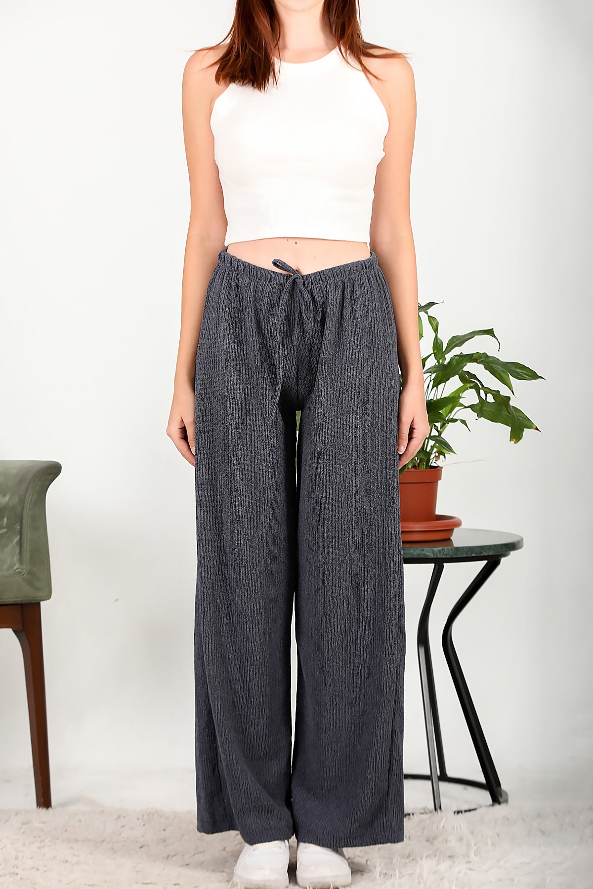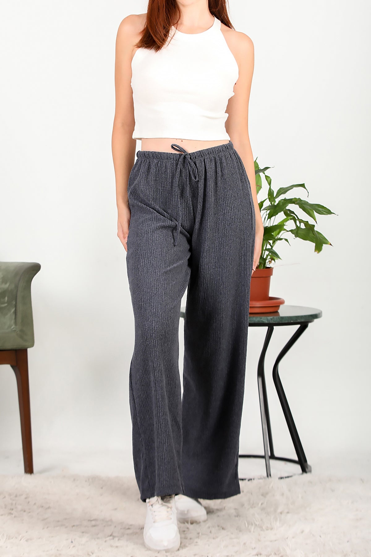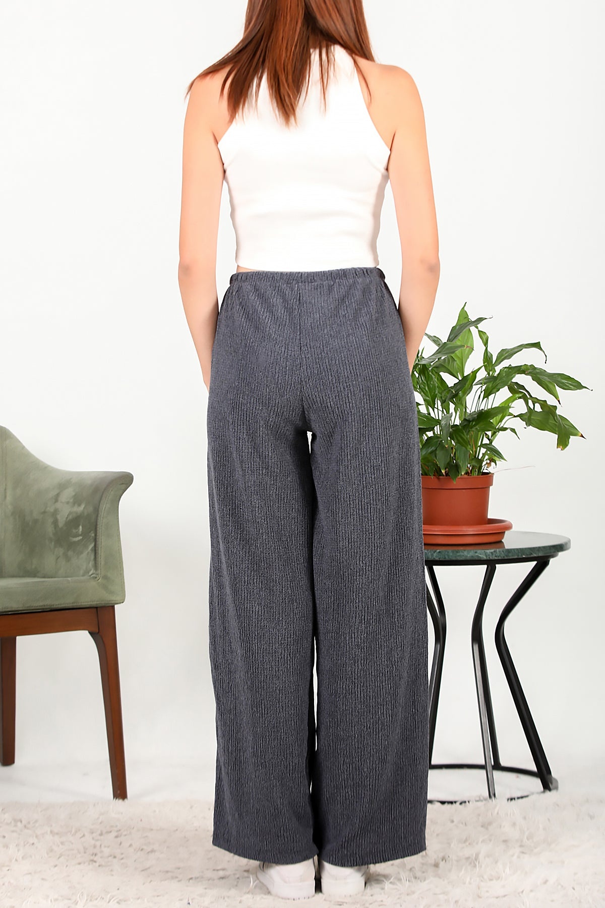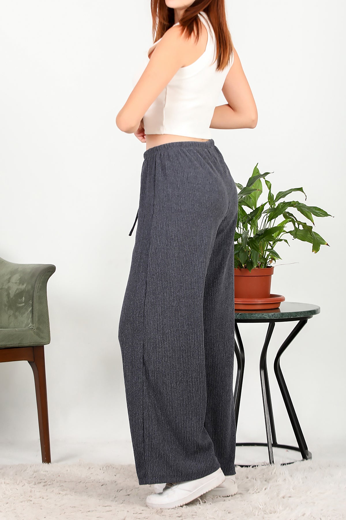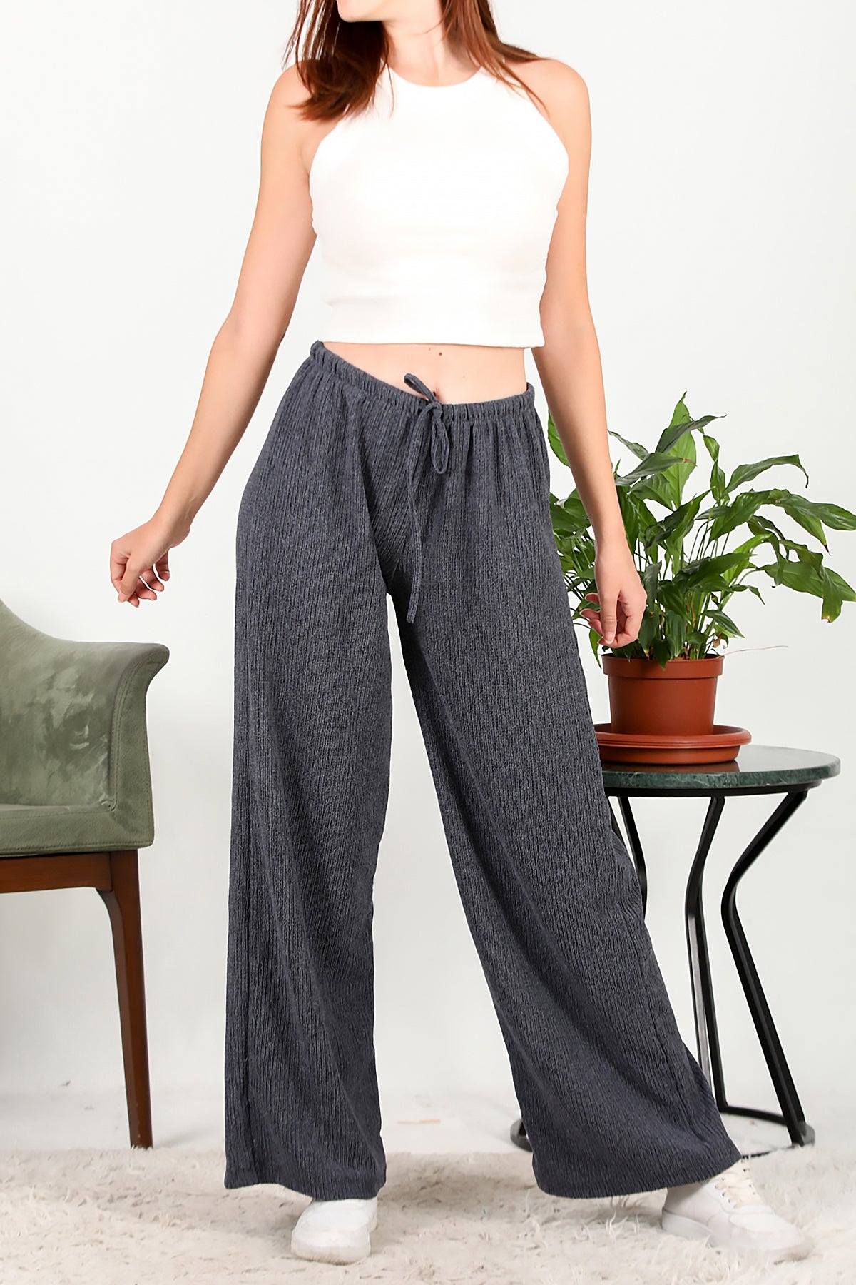 Numune Bedeni: 36 Numune Boyu: 105 cm Kumaş Tipi: %75 Polyester %20 Pamuk %5 ElestanPaça: Bol Paça Bel: Lastikli