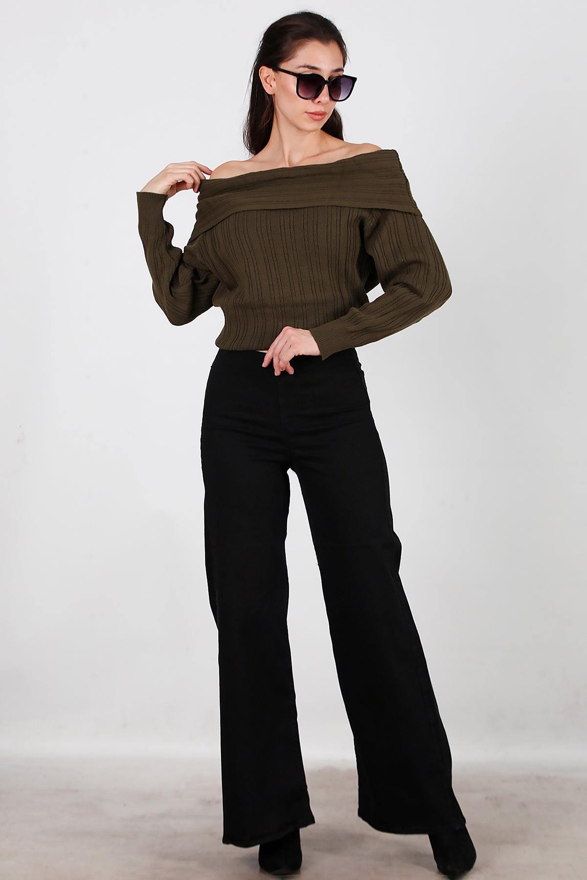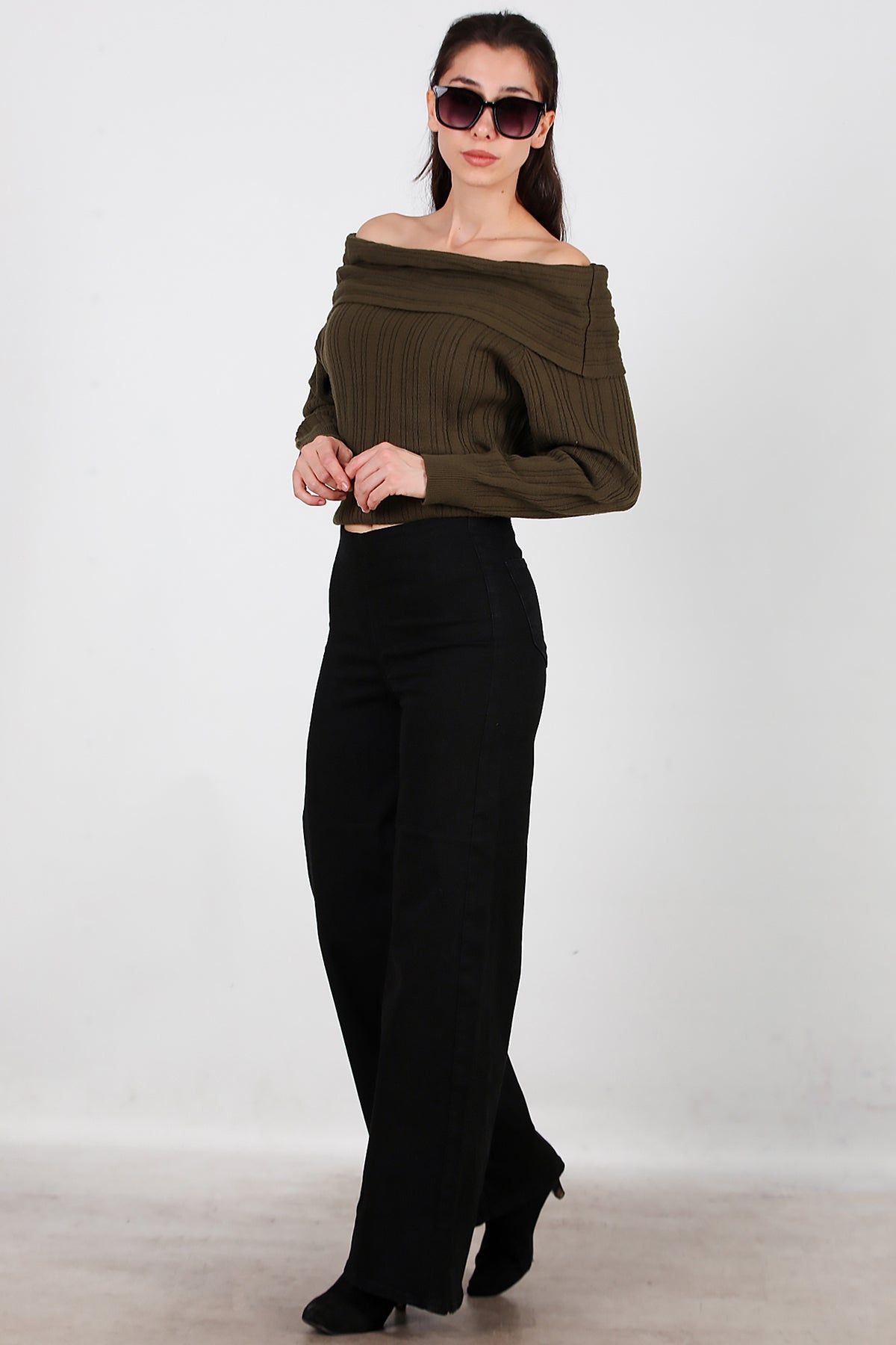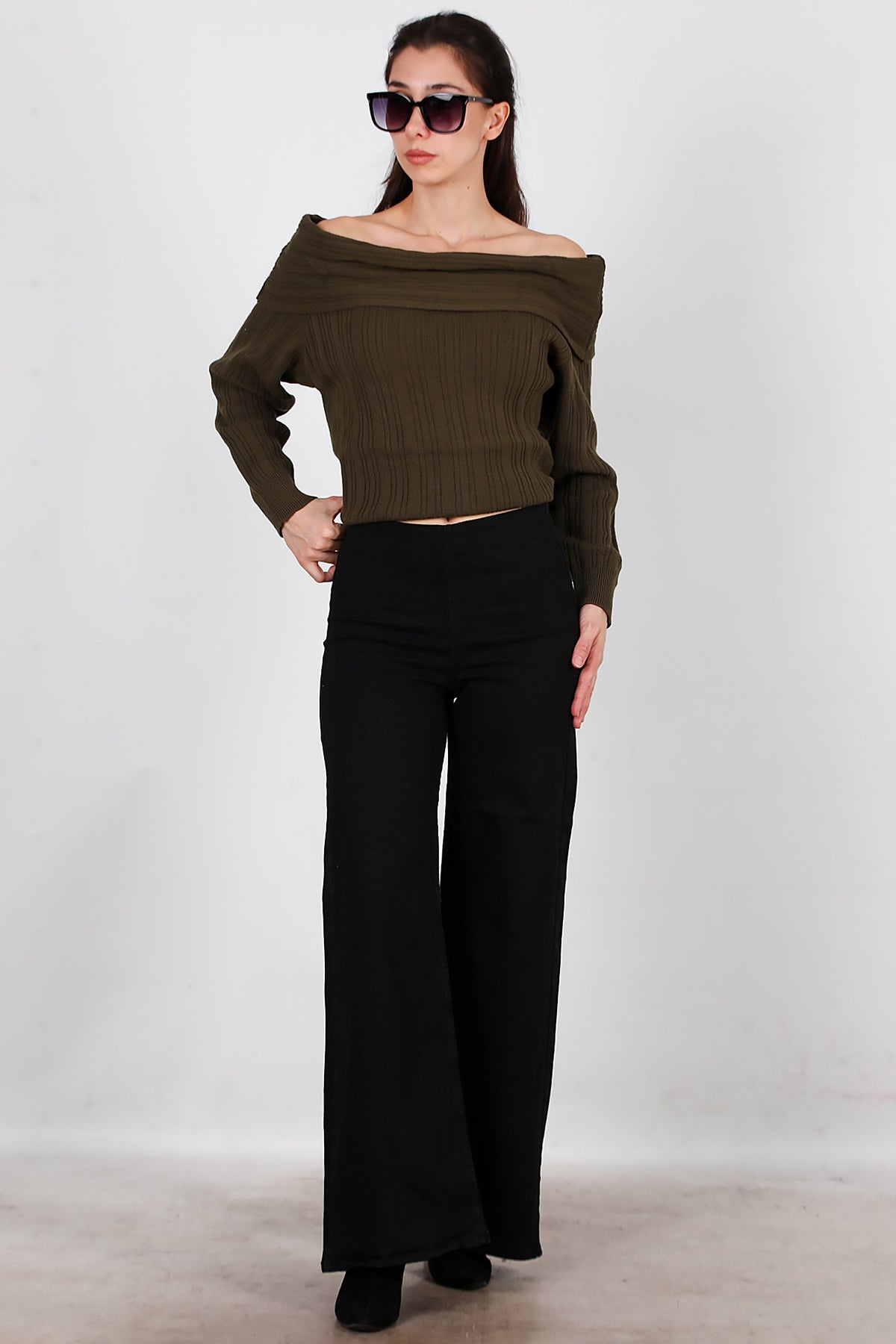 Kadın Bel Lastikli Bol Paça Kot Pantolon Siyah