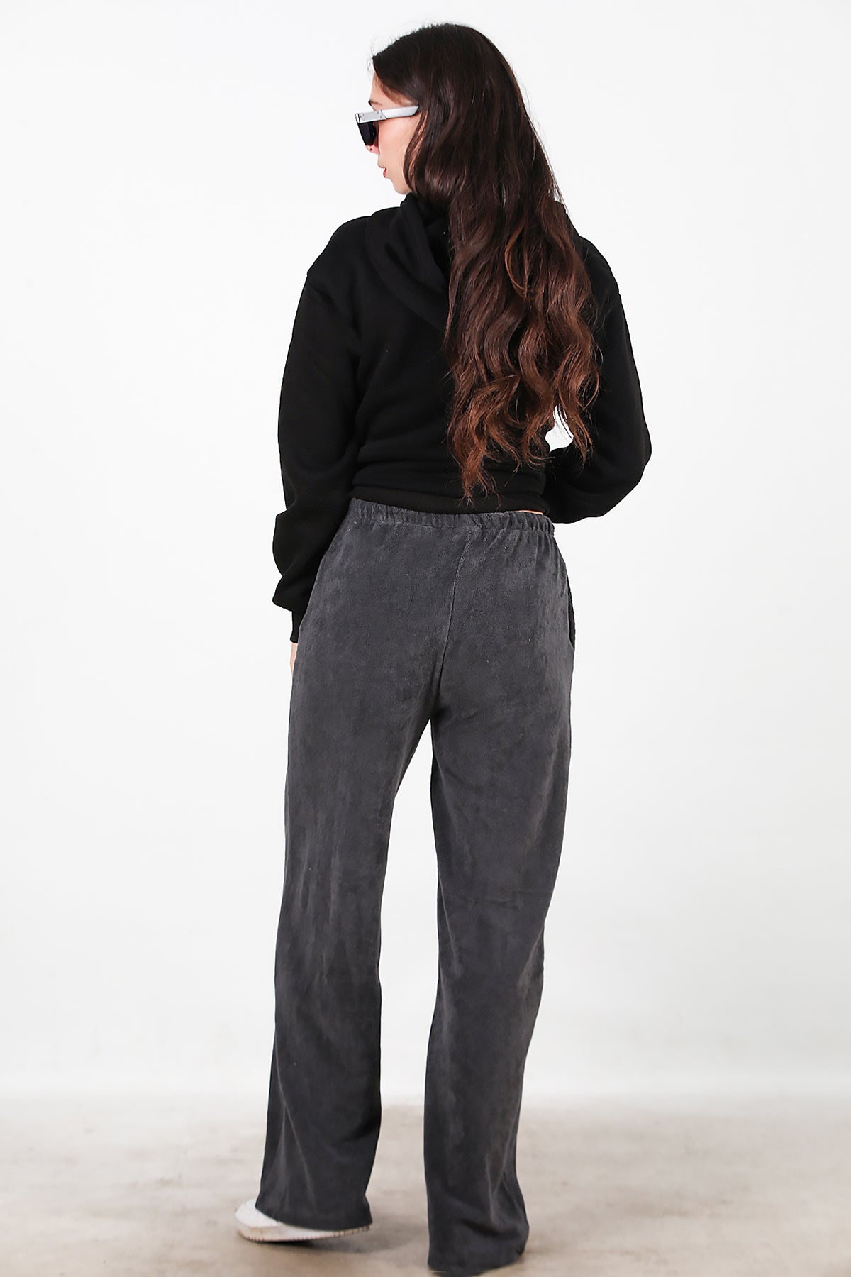 Kadın Cepli Bol Paça Havlu Pantolon Füme