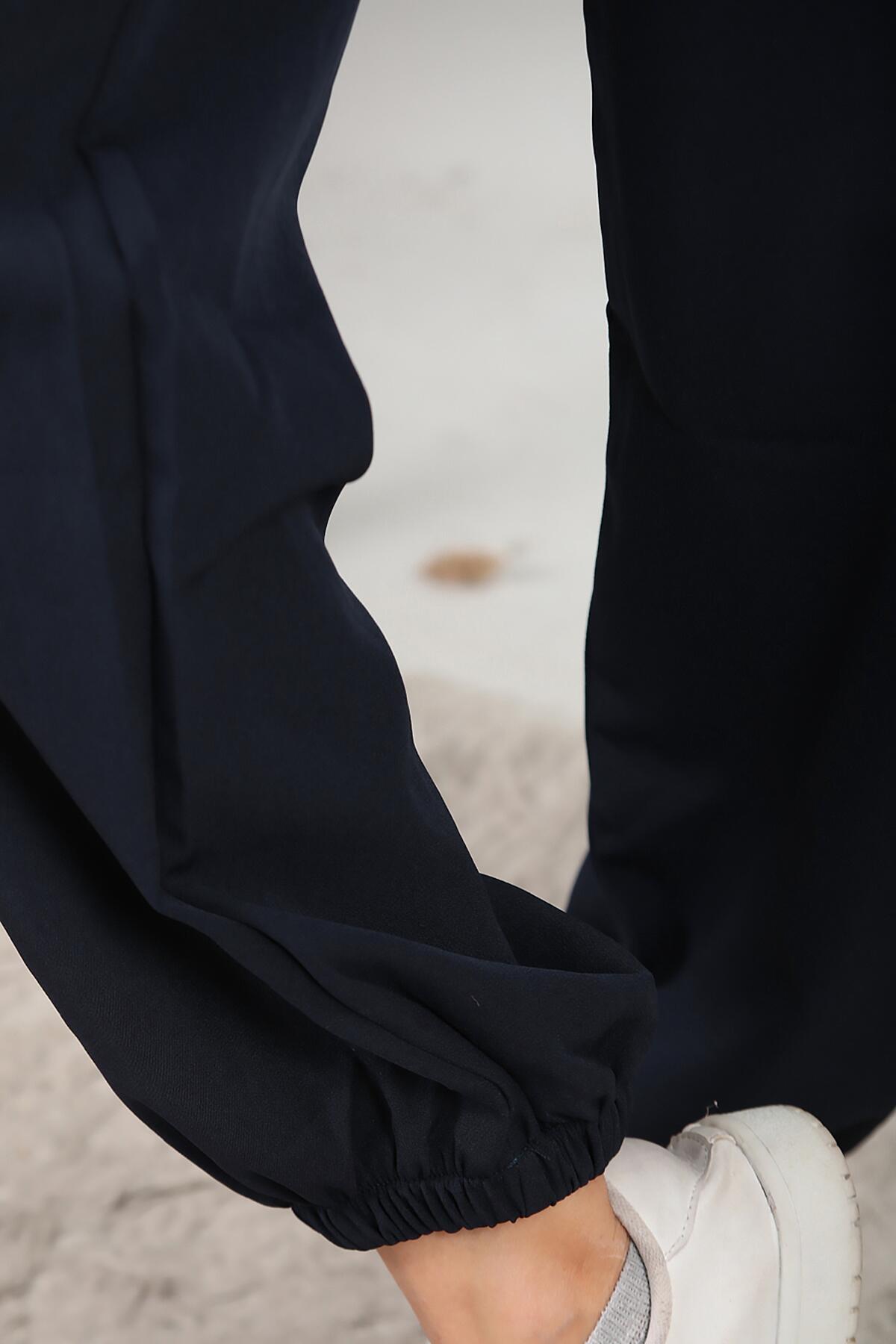 Kadın Cırtlı Paça Lastikli Şalvar Kumaş Pantolon Lacivert