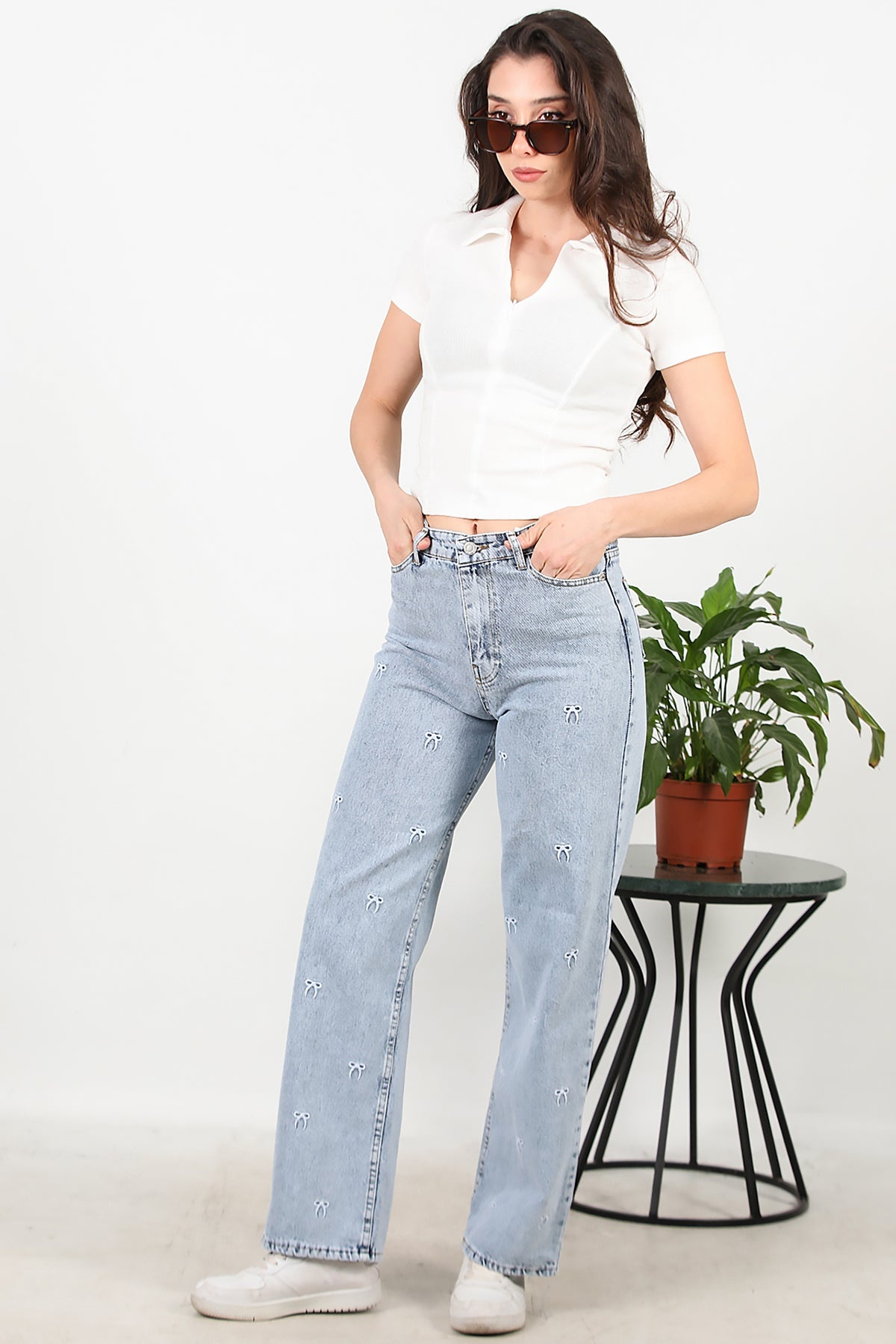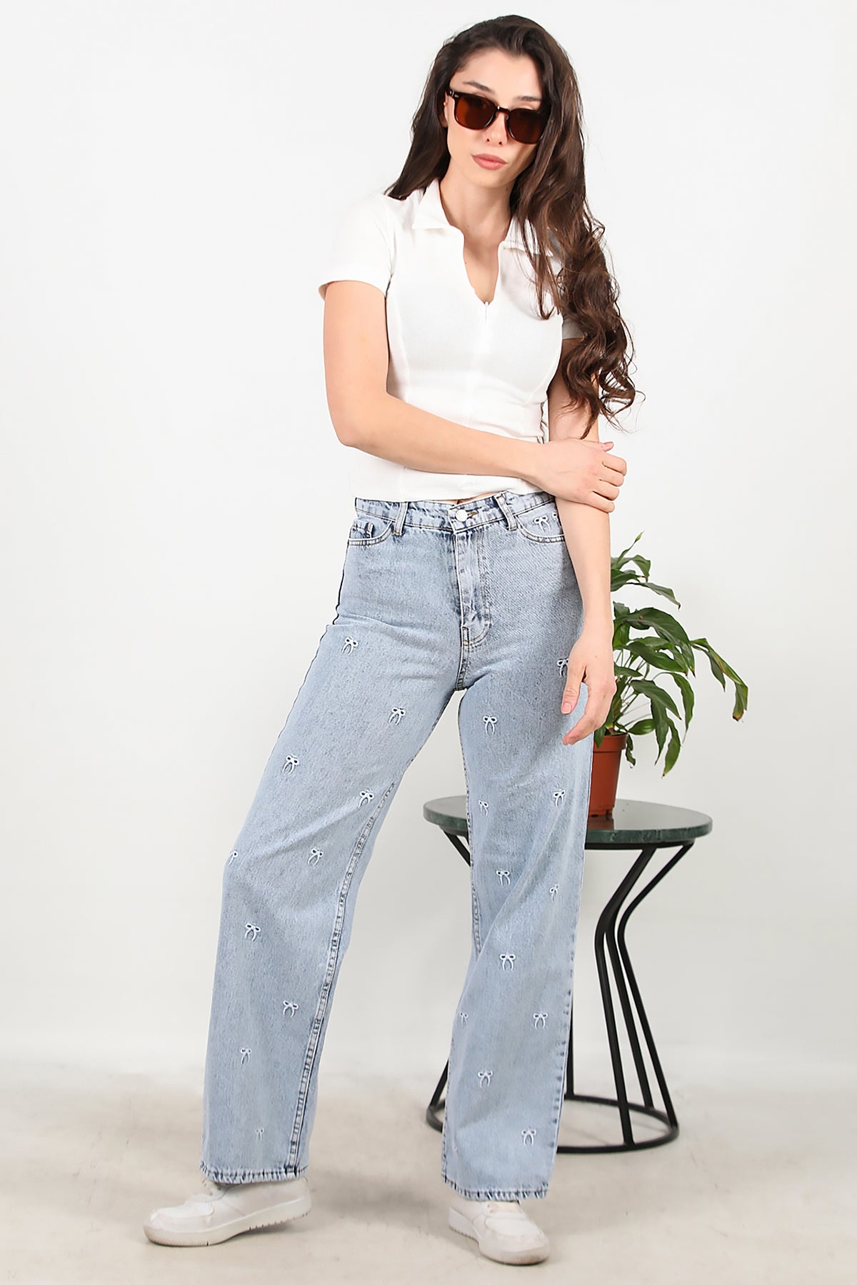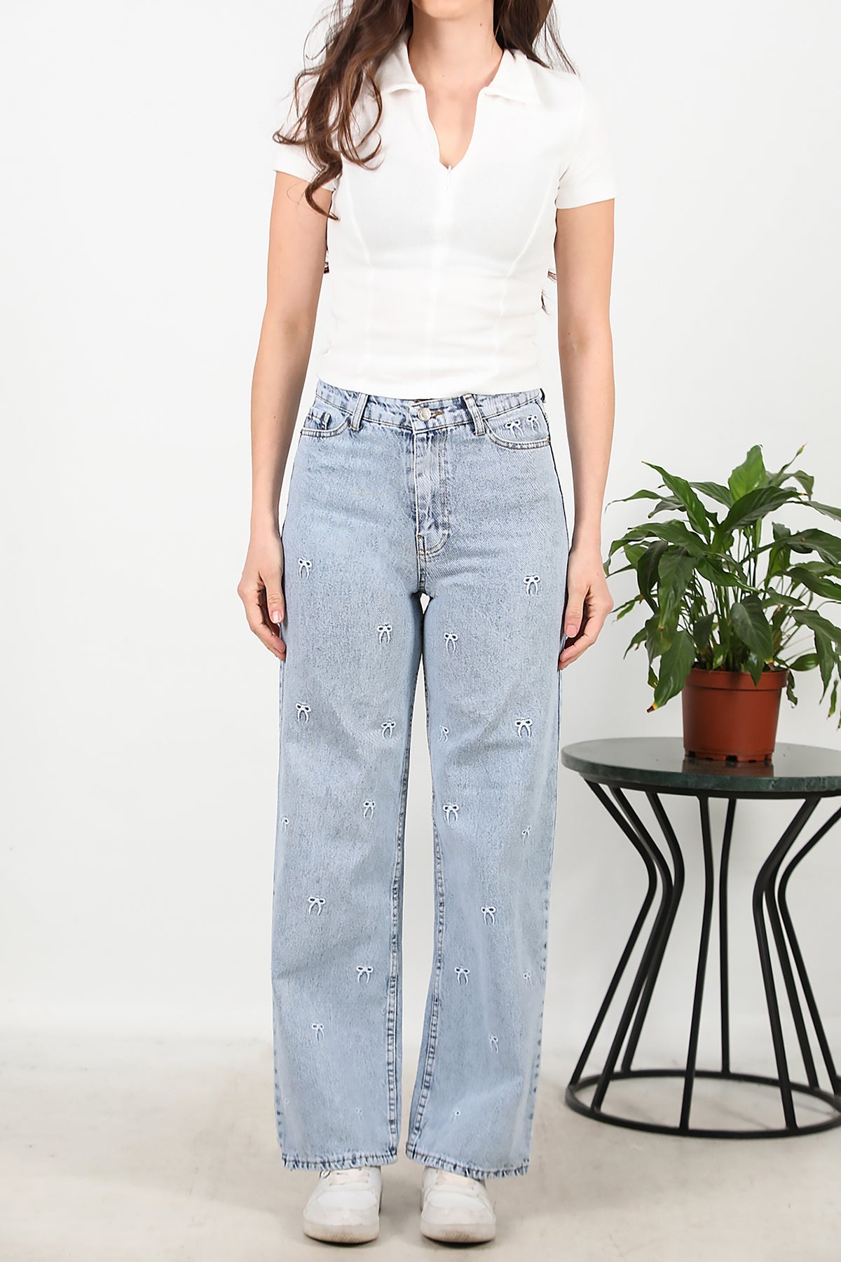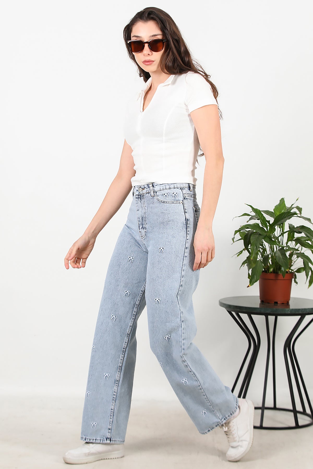 Kadın Fiyonk İşlemeli Bol Paça Kot Pantolon Mavi
