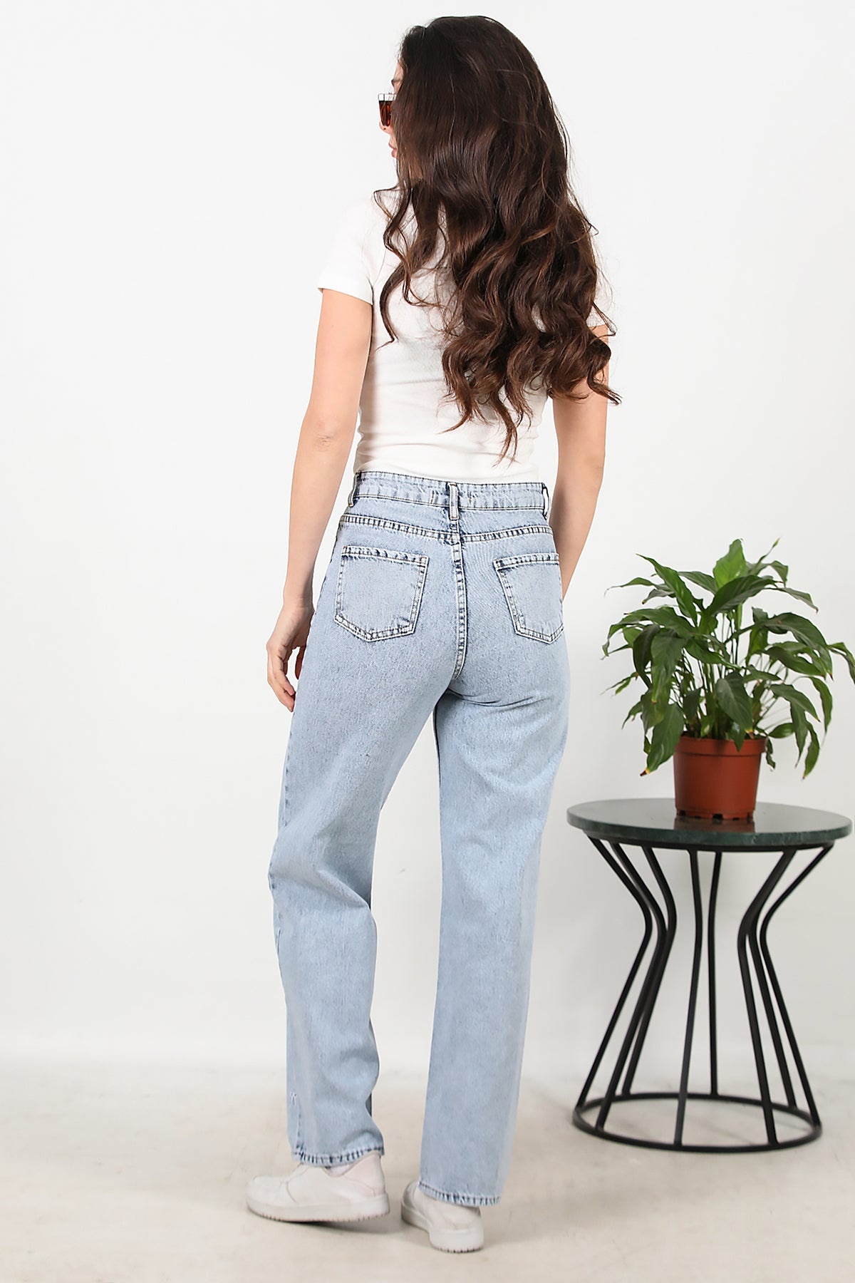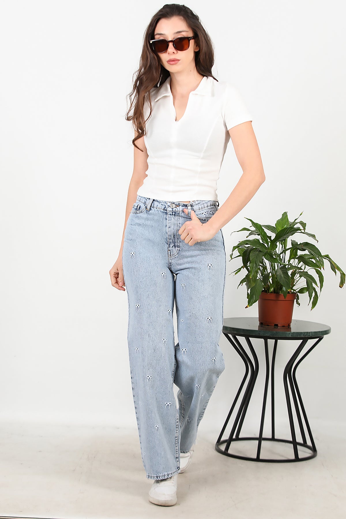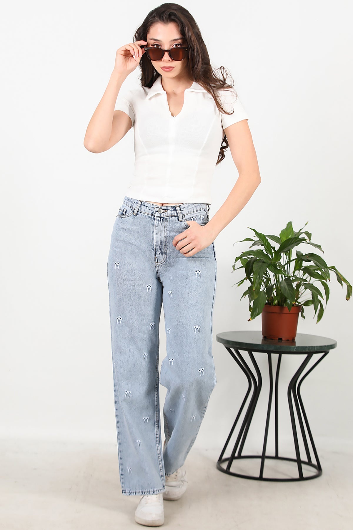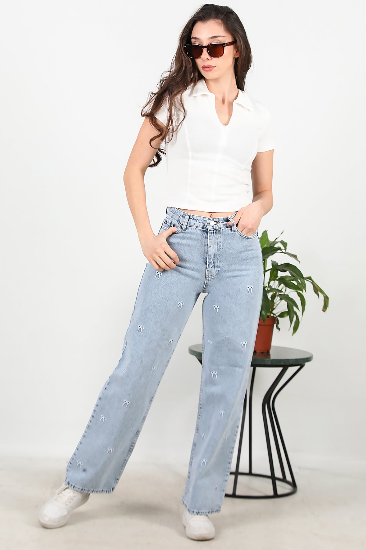 Kadın Fiyonk İşlemeli Bol Paça Kot Pantolon Mavi