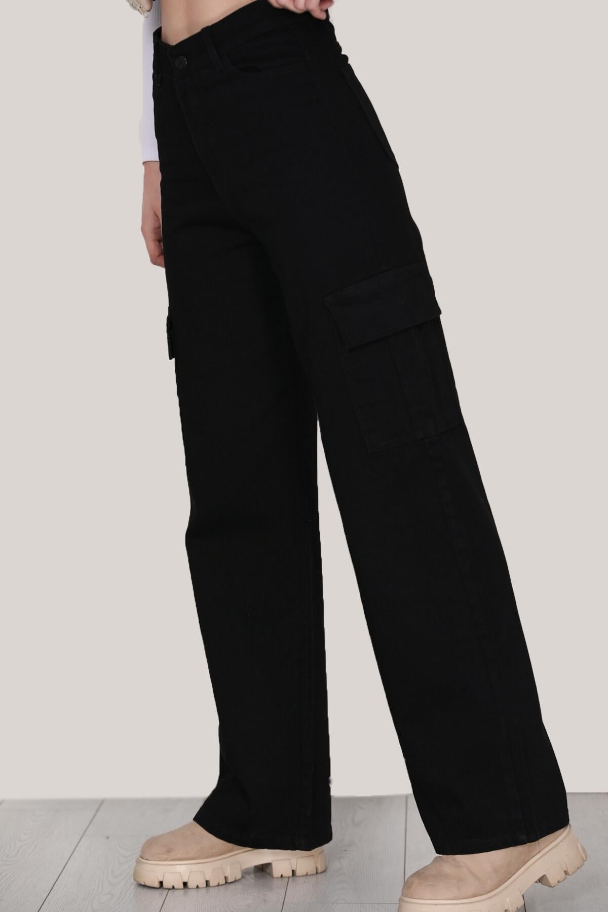 Kadın Kargo Cepli Geniş Pantolon Siyah Siyah