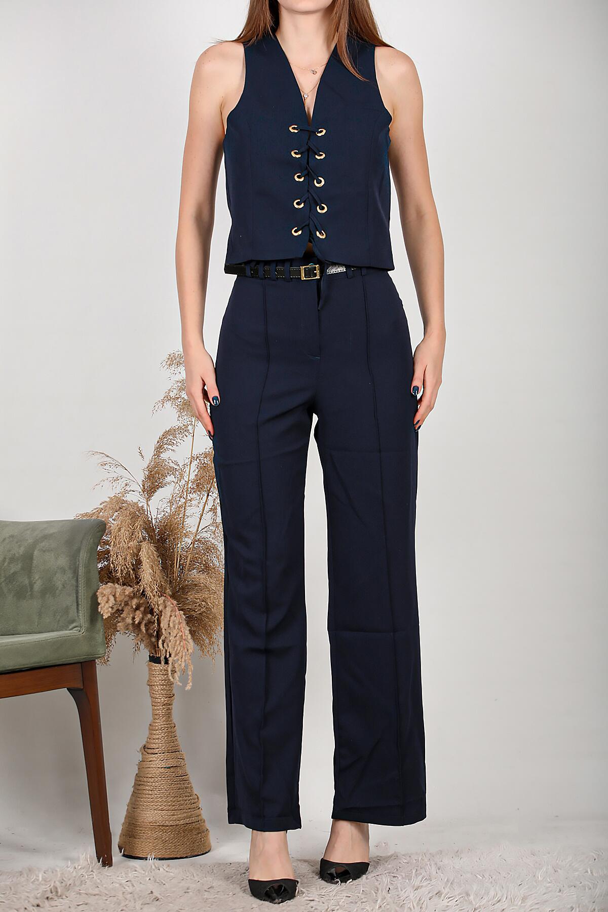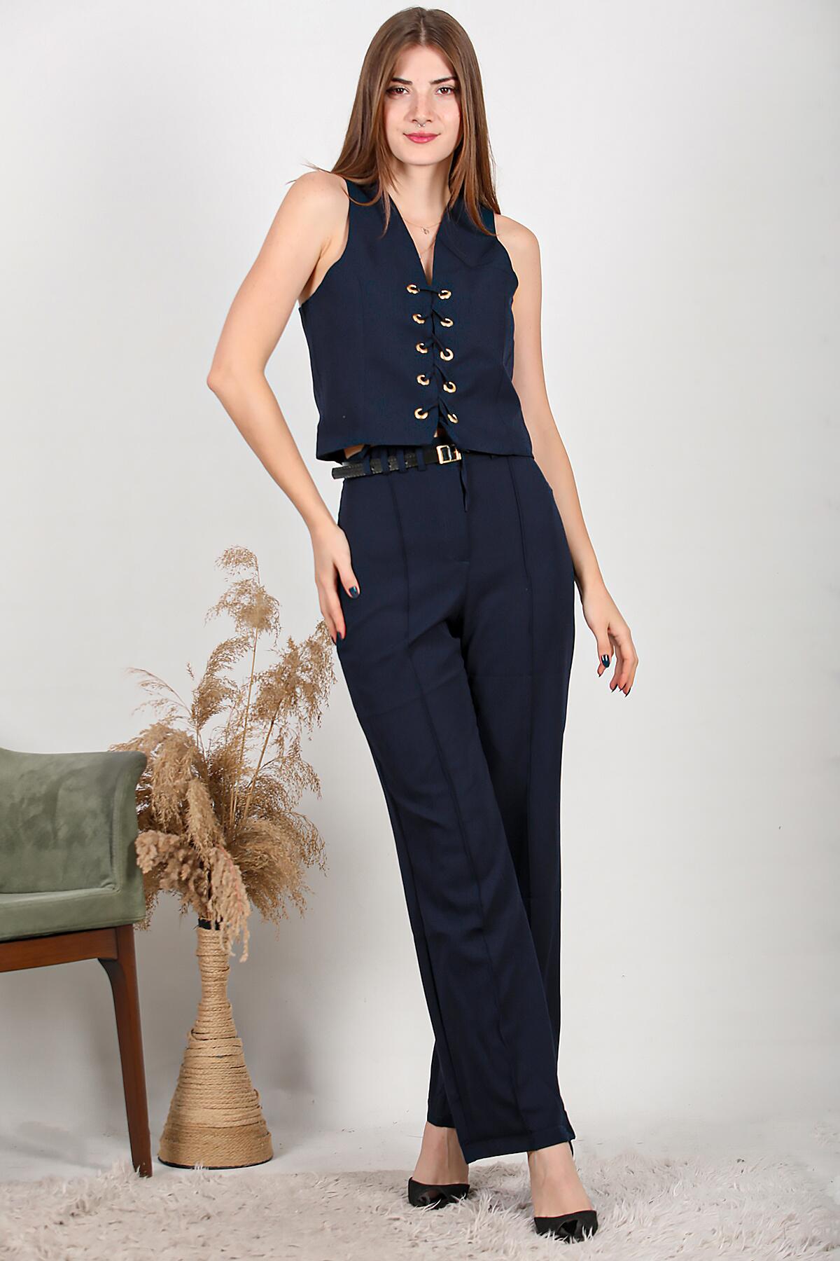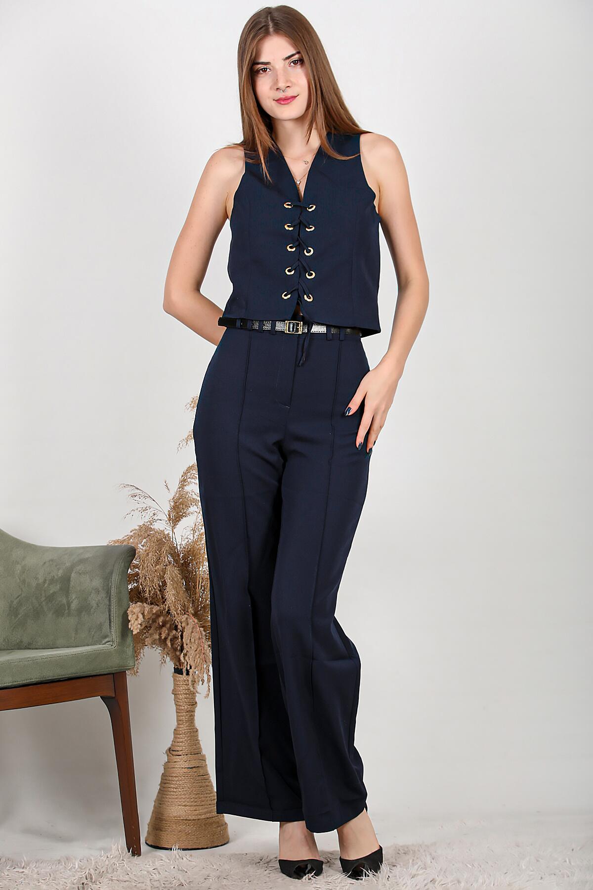 Kadın Kemerli Brit Detay Çimalı Bol Paça Pantolon Lacivert