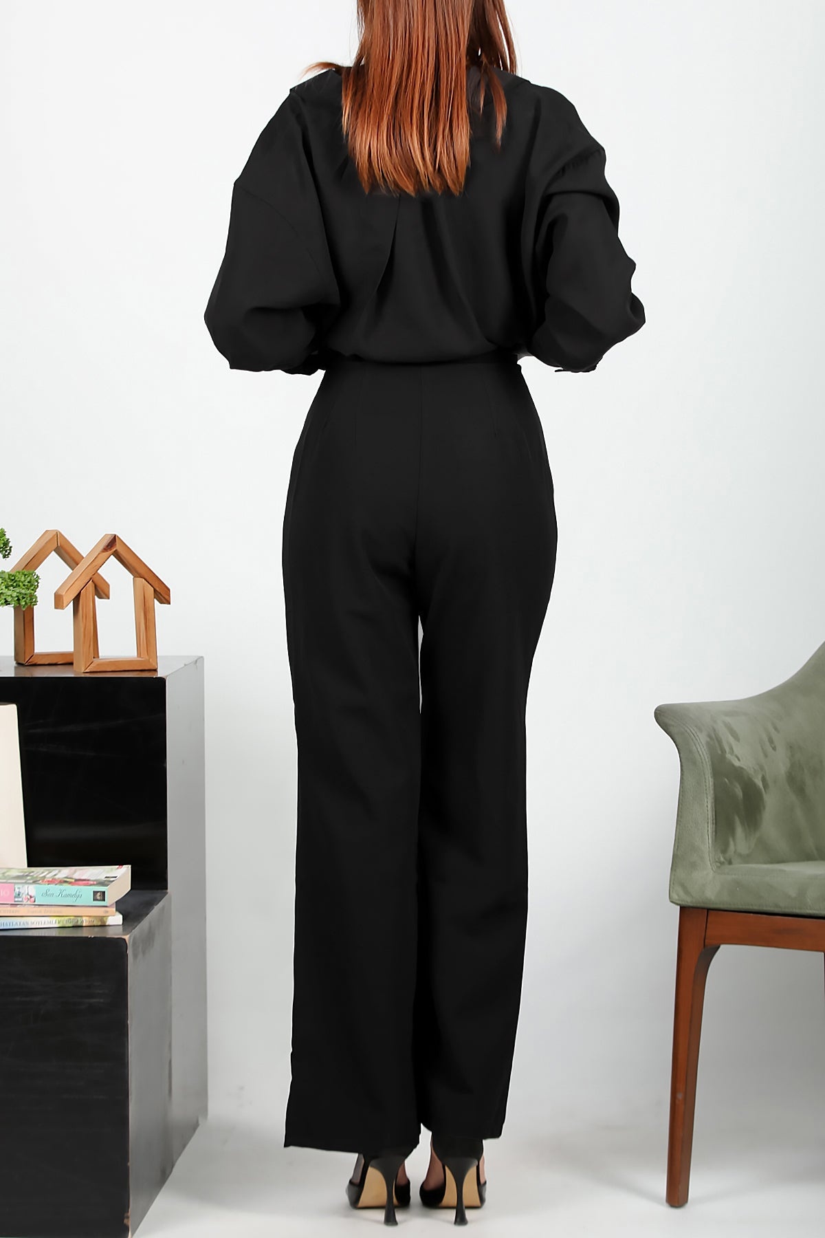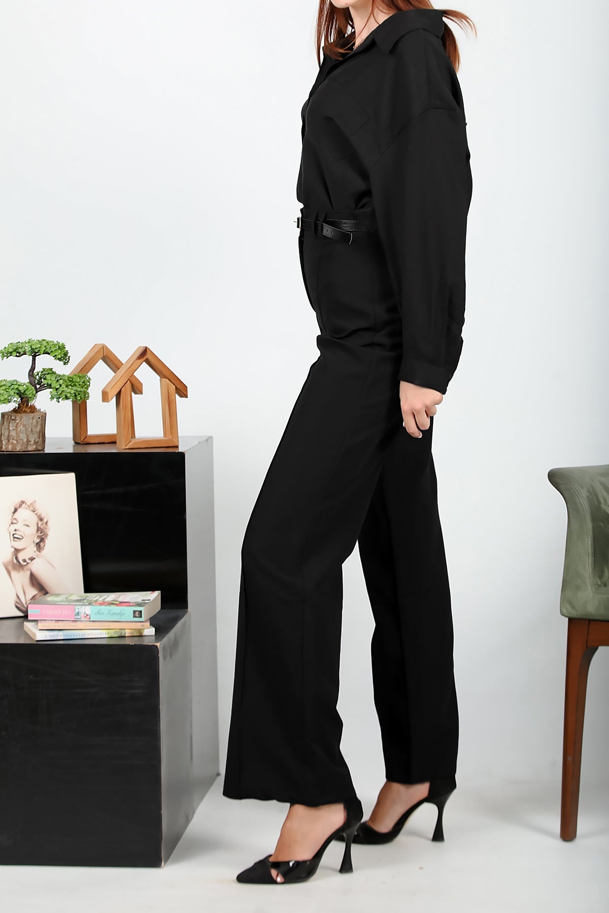 Kadın Kemerli Brit Detay Çimalı Bol Paça Pantolon Siyah