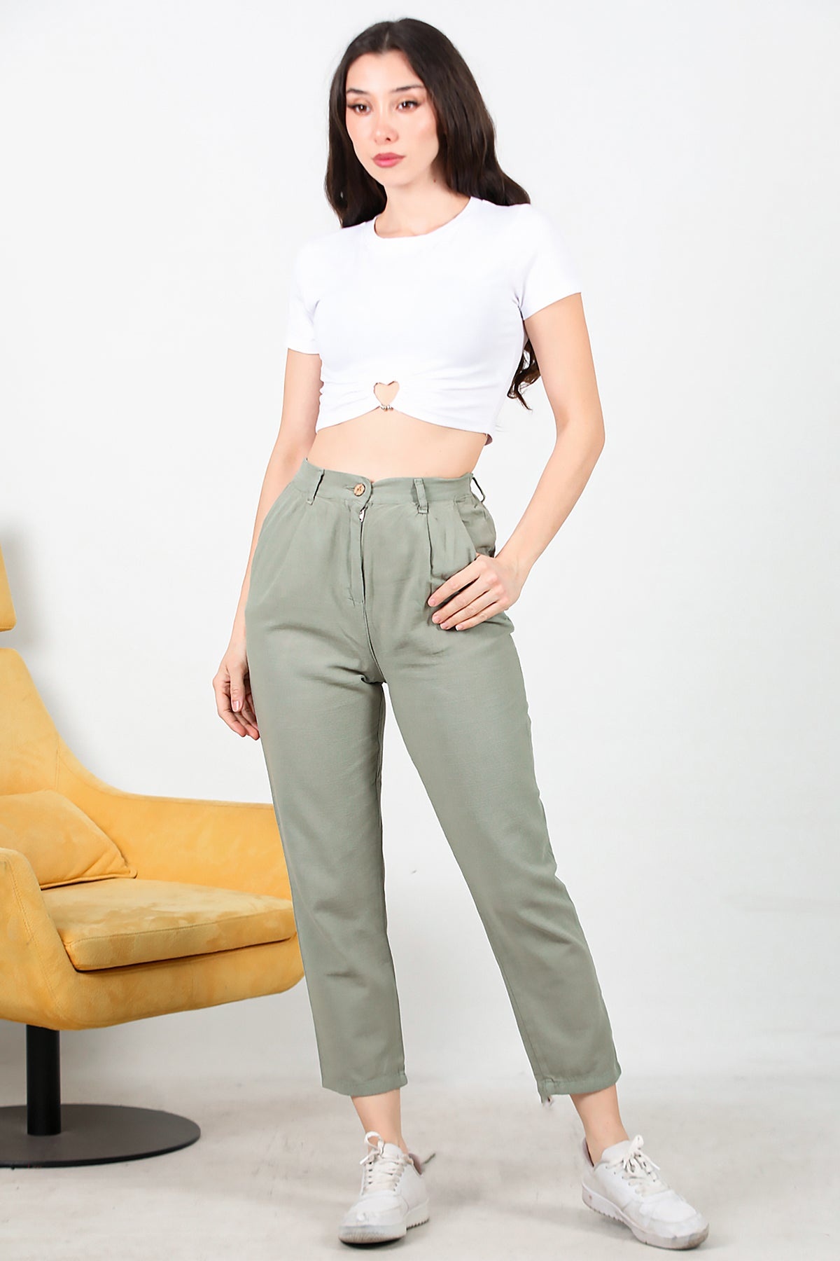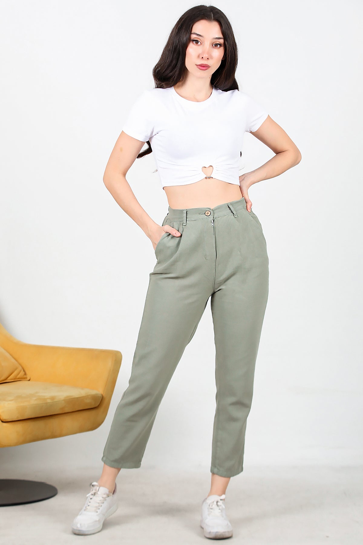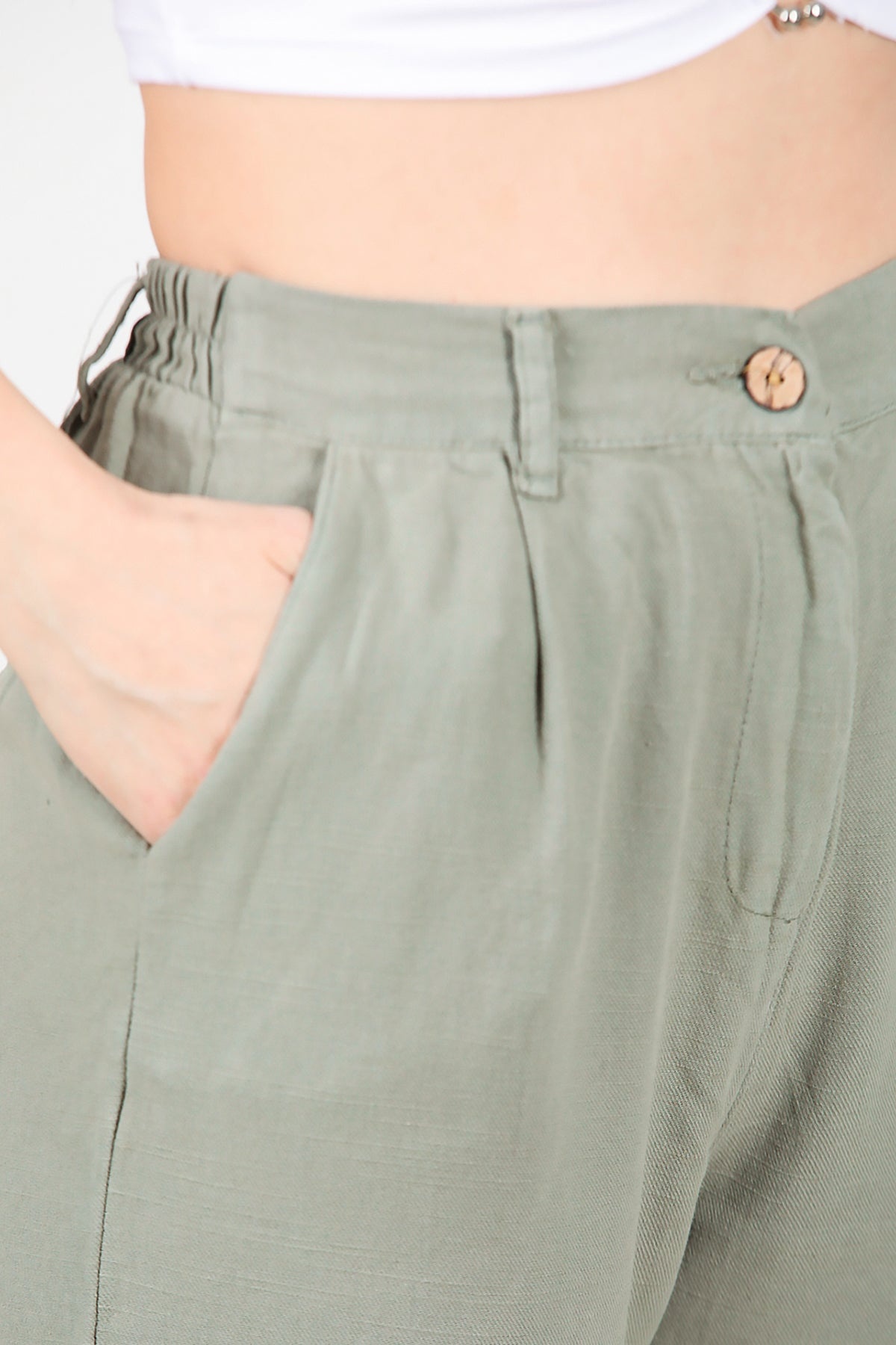 Kadın Pileli Dar Paça Keten Pantolon Haki