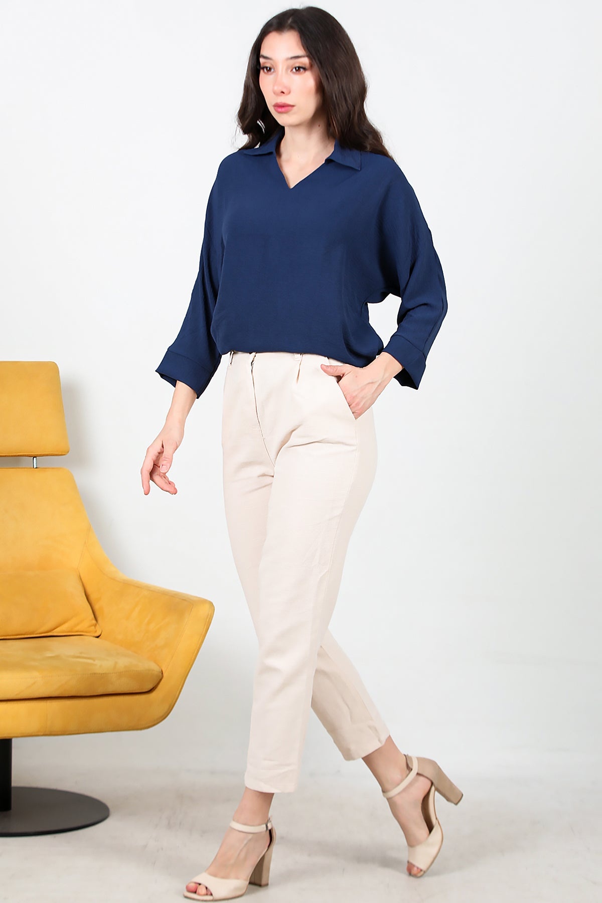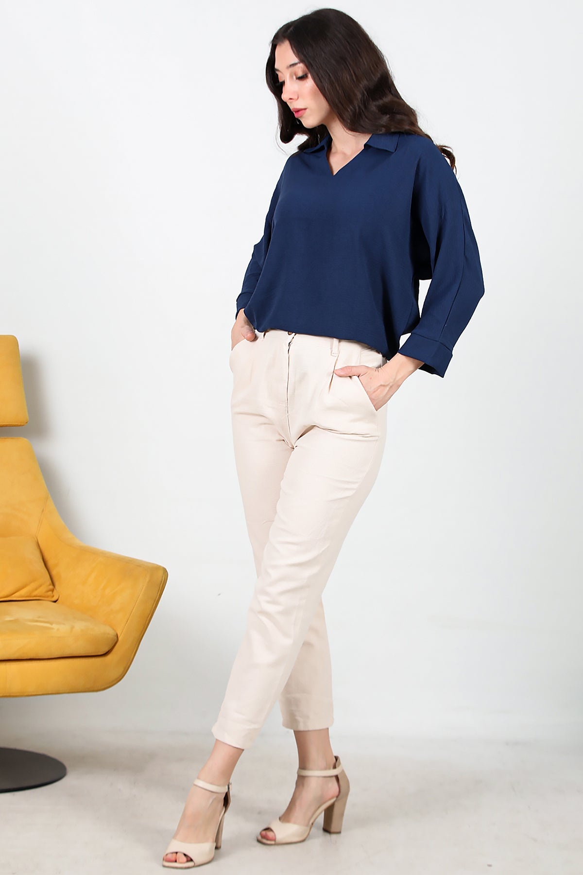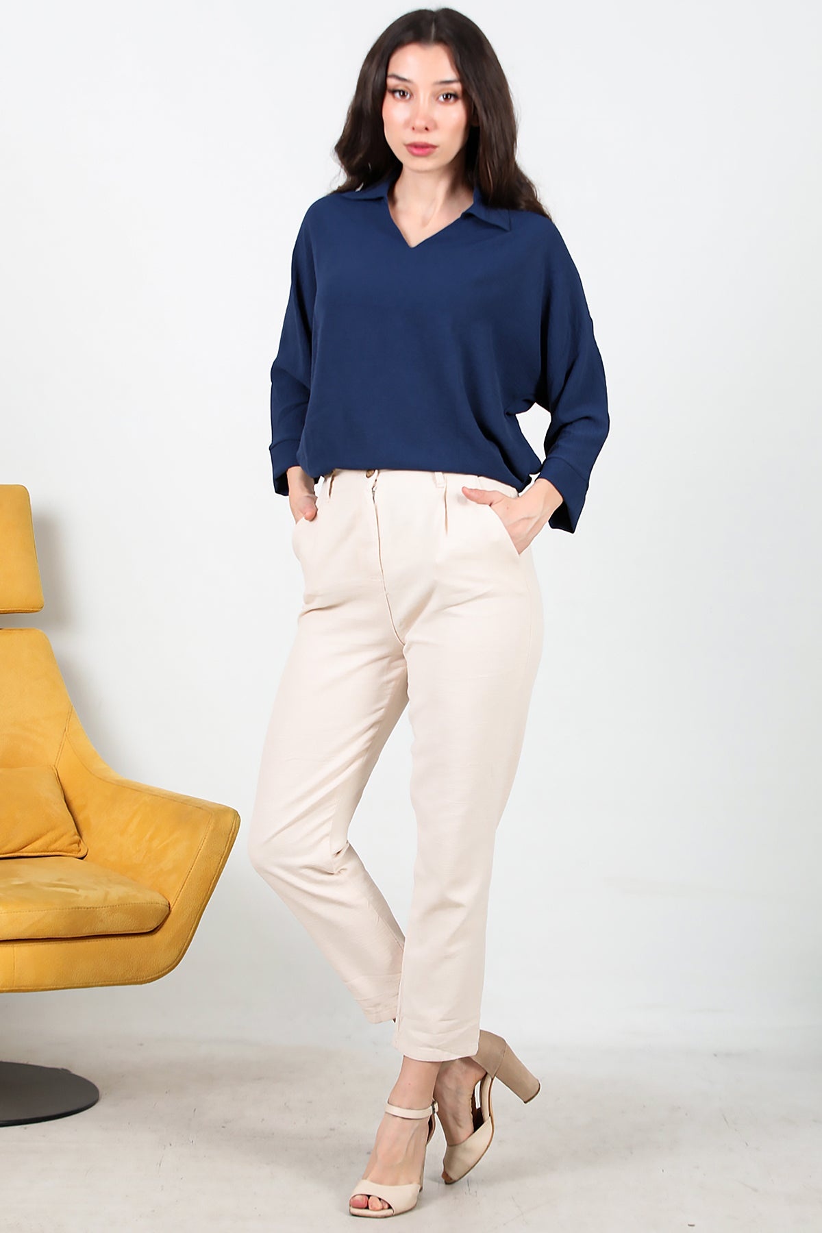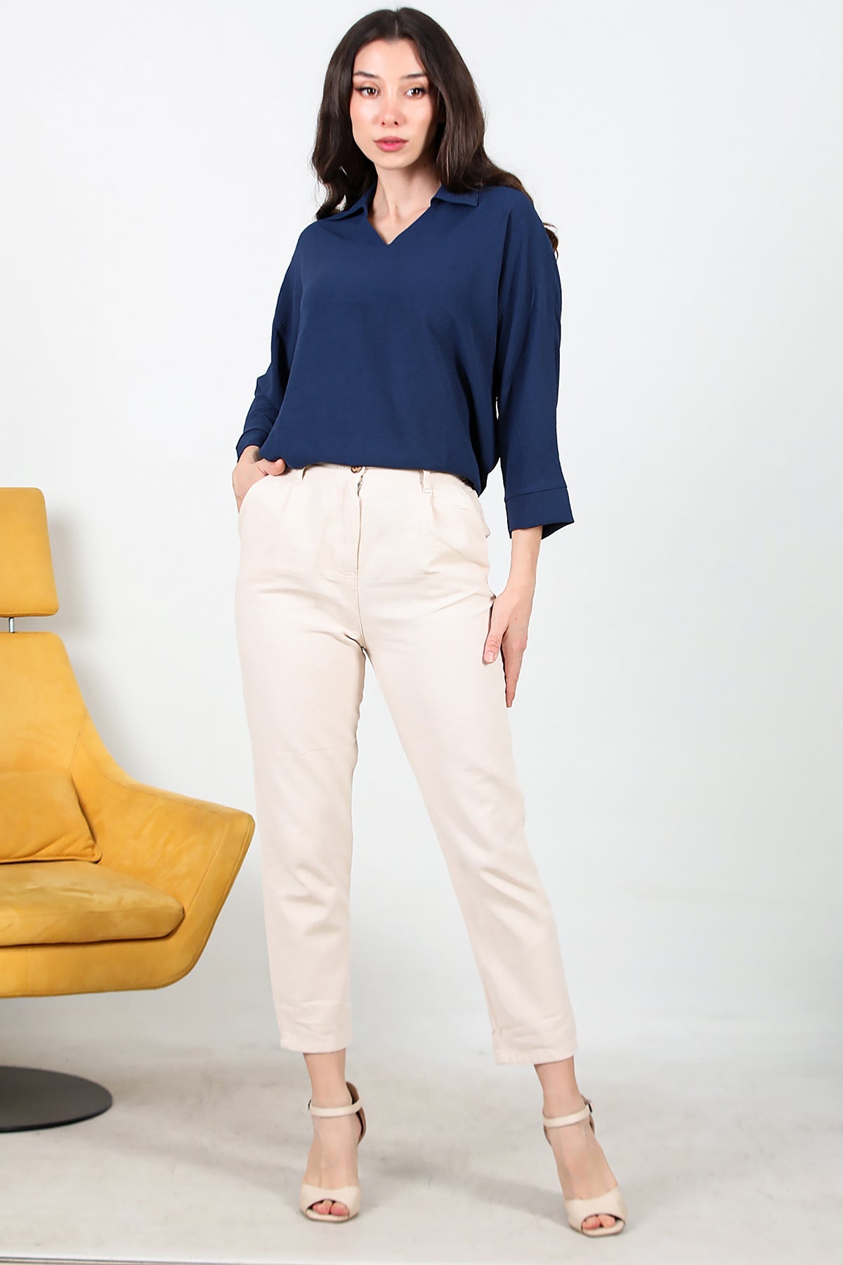 Kadın Pileli Dar Paça Keten Pantolon Taş
