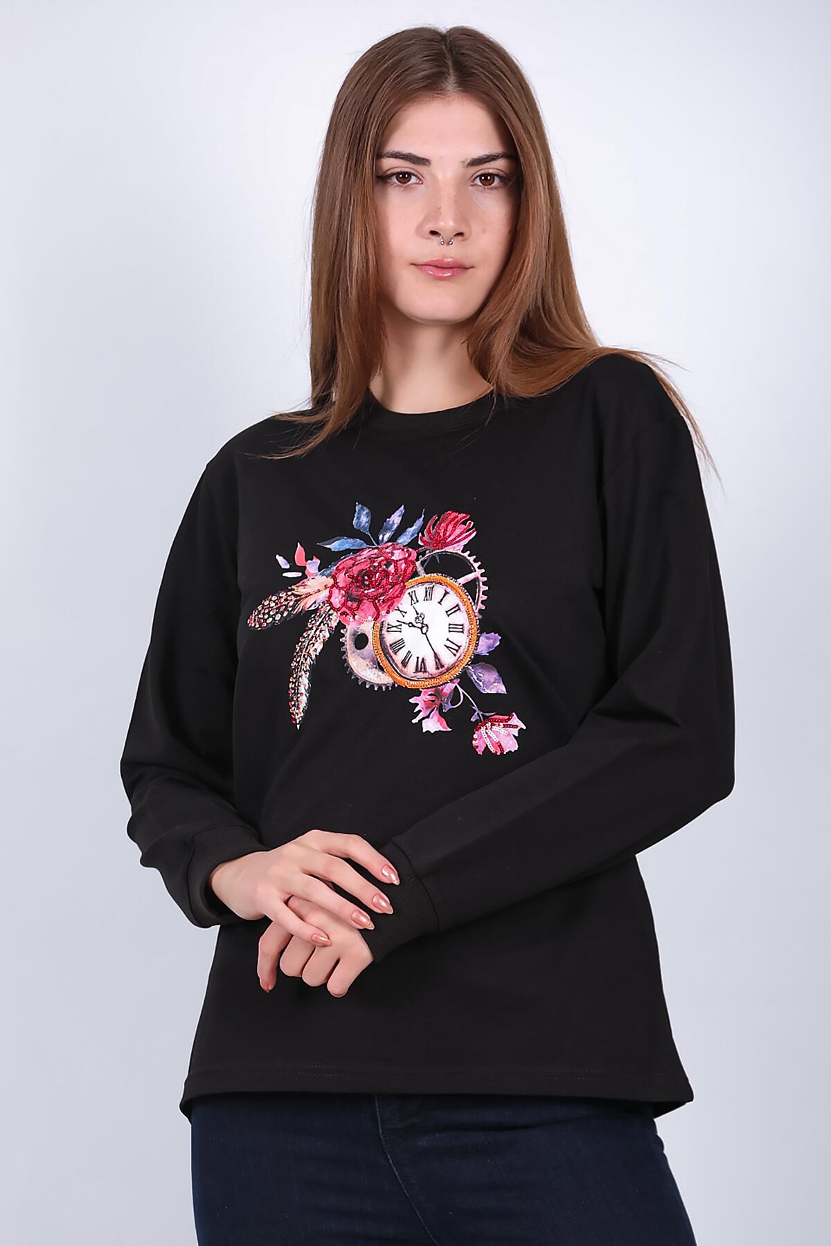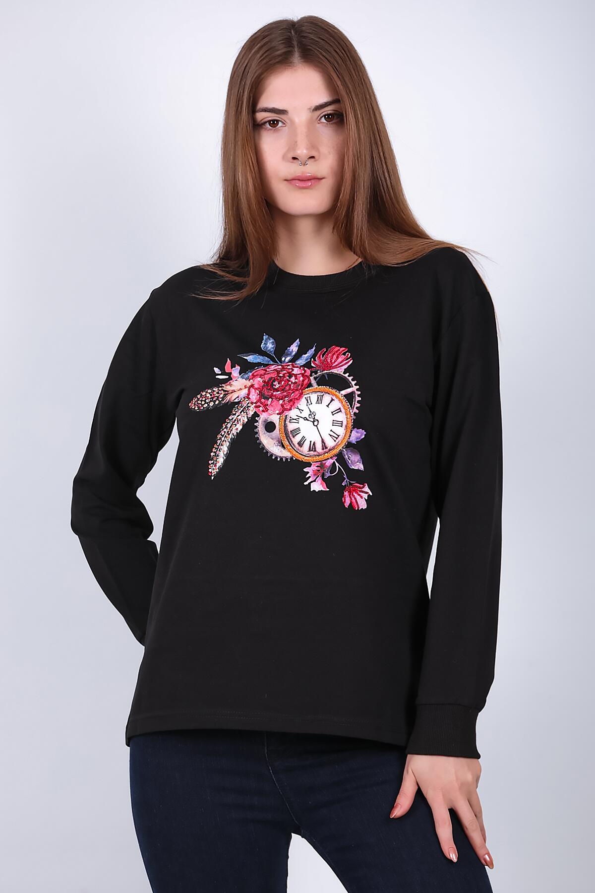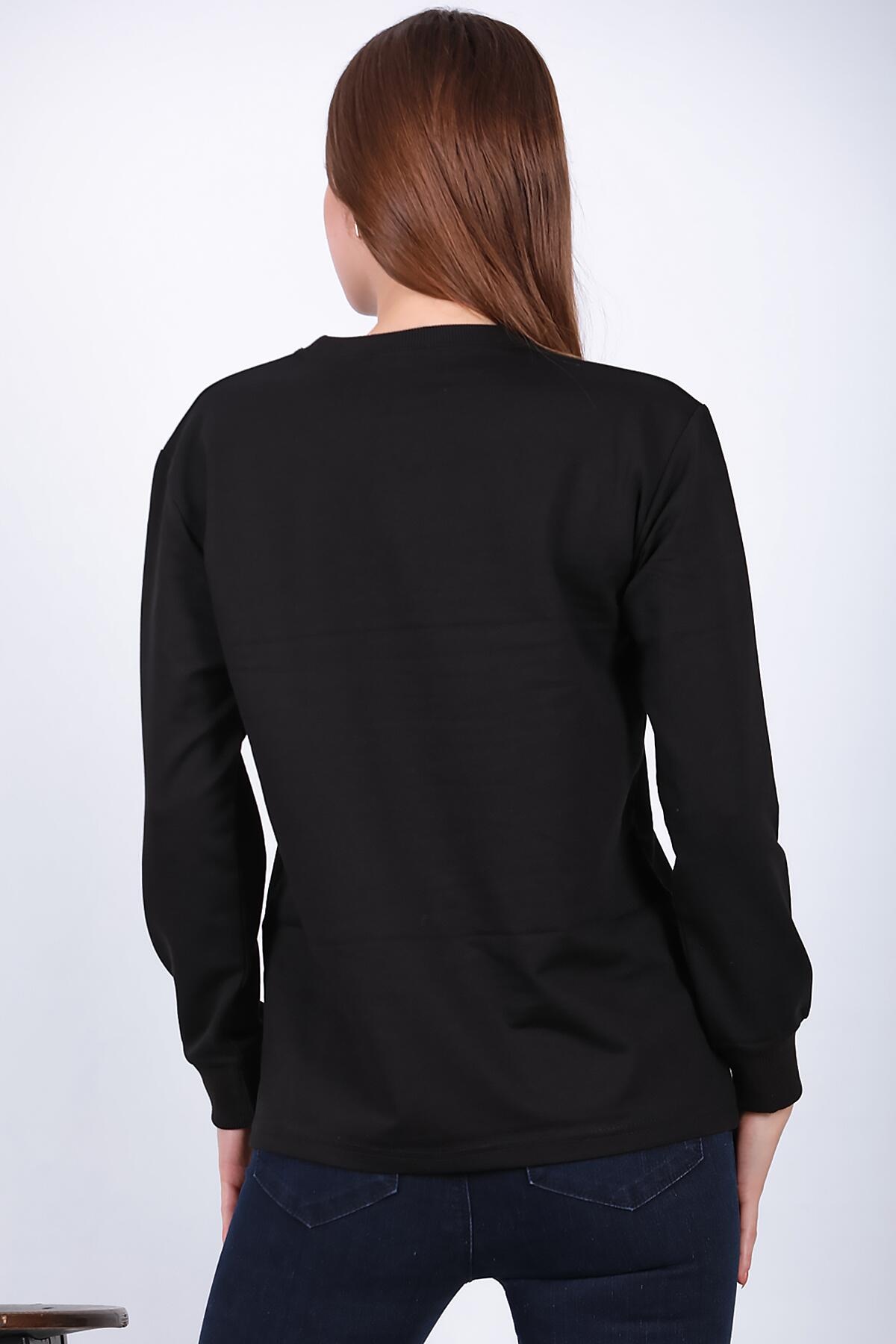 Kadın Bisiklet Yaka Baskılı Sweat Siyah
