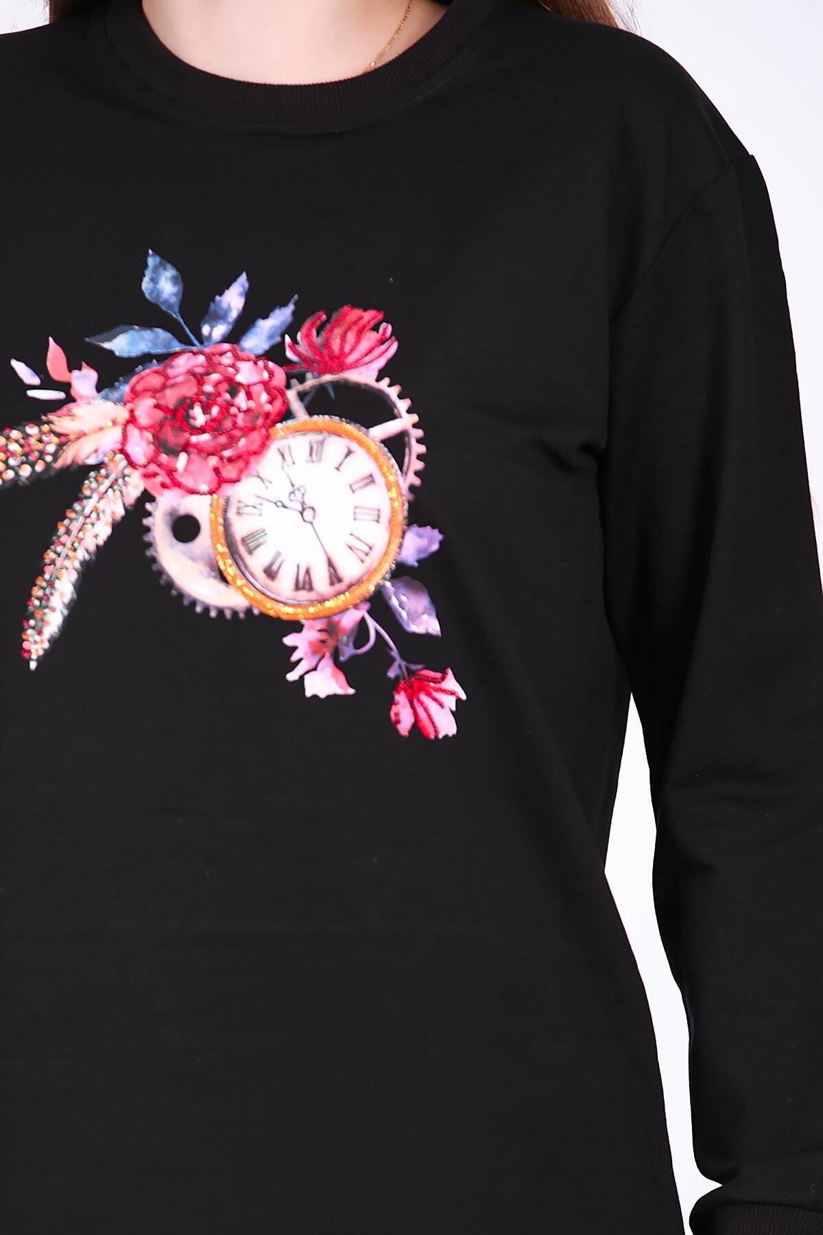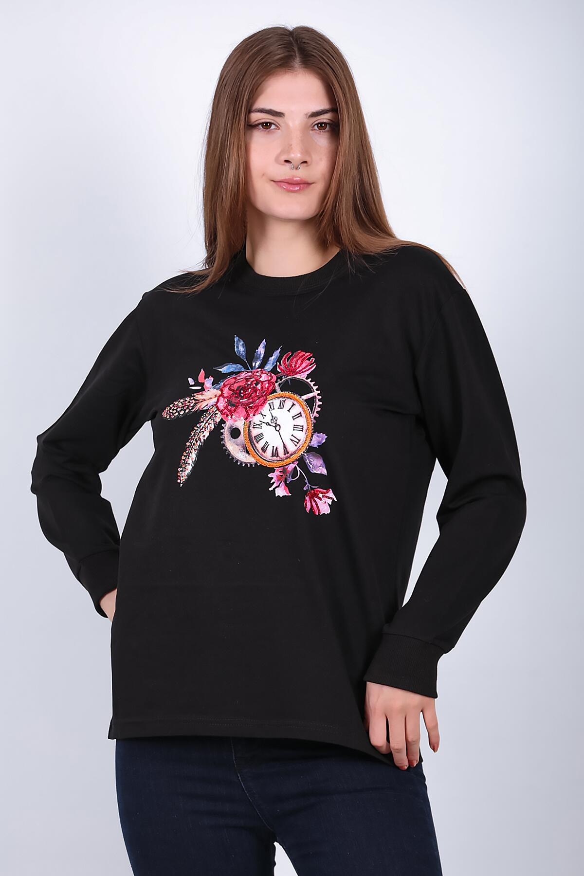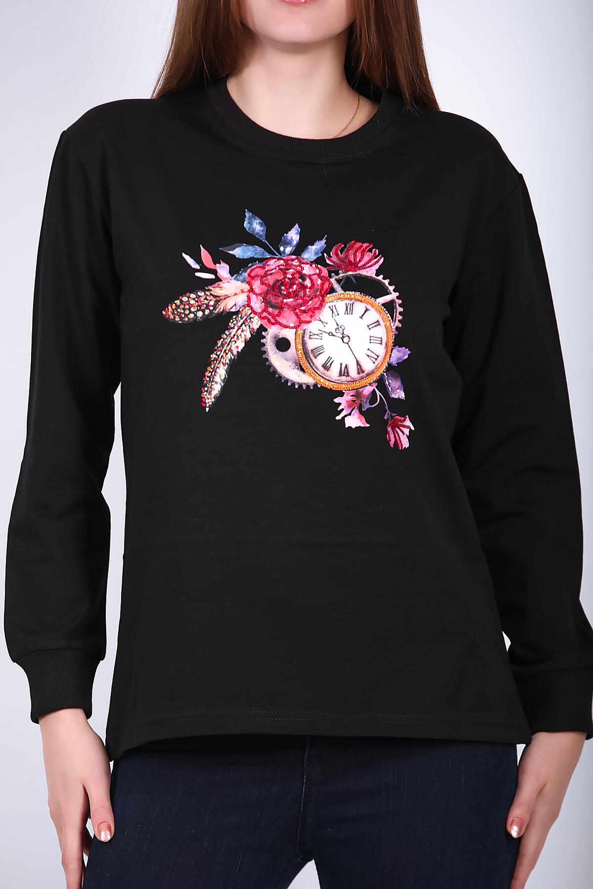 Kadın Bisiklet Yaka Baskılı Sweat Siyah